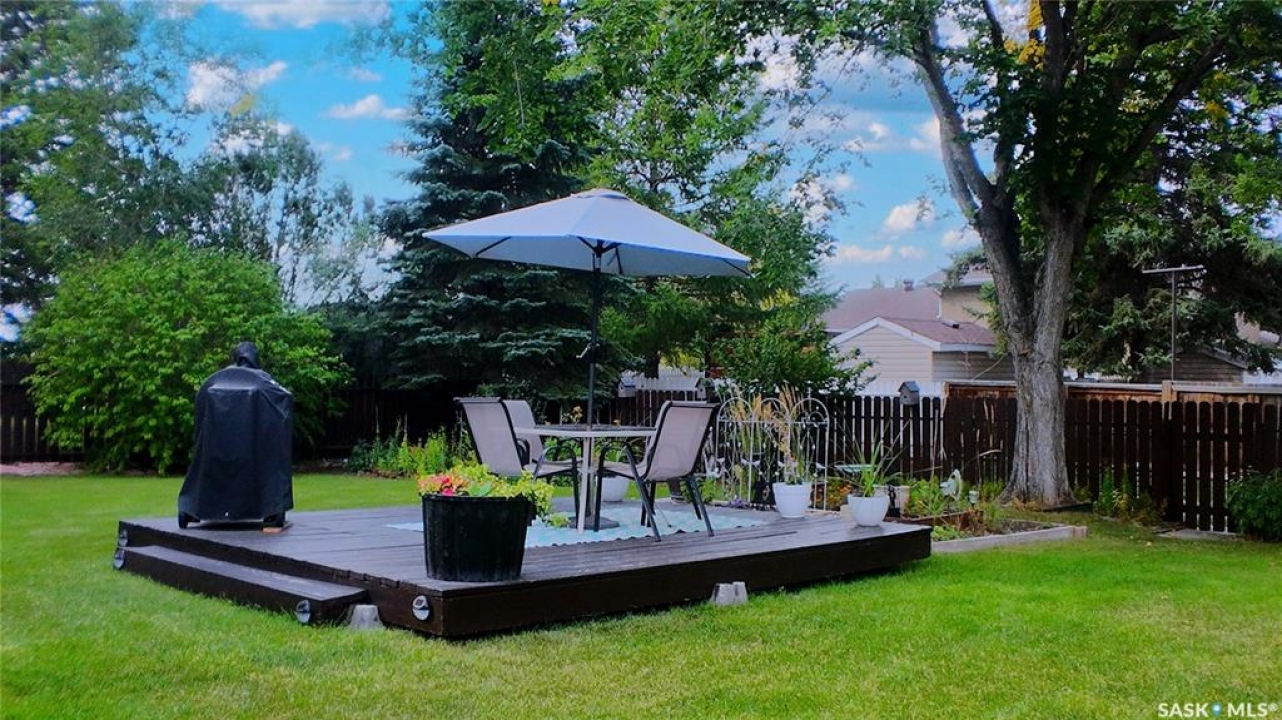 Outdoor: Deck, Fenced, Garden Area, Lawn Back, Lawn Front, Trees/shrubs