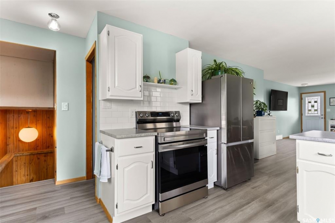 Charming curb appeal welcomes you with a front veranda complete with new vinyl deck and posts with a thoughtfully designed open-concept layout inside. Bright and airy, the main level is enhanced by upgraded PVC triple-pane windows, luxury vinyl plank flooring, and plush carpet in the two generously sized bedrooms. The refreshed white kitchen shines with newer stainless steel appliances, timeless subway tile backsplash, new countertops, hardware and a spacious pantry. The main floor 4 piece bath has been refreshed including flooring, sink, taps, tub and surround. The basement offers a functional layout with large windows that fill the space with natural light. Enjoy a spacious rec room, 2-piece bath, third bedroom, laundry area, cold room, and ample storage. Recent upgrades include a new water heater (Dec 2022), water softener (2025), and new lighting throughout the main level. Outside, the backyard is a gardener's dream with established perennials including hascap and gooseberry bushes, garden beds, a wood deck for summer entertaining, and a large shed. The property also includes a large single garage (no direct entry to the house).