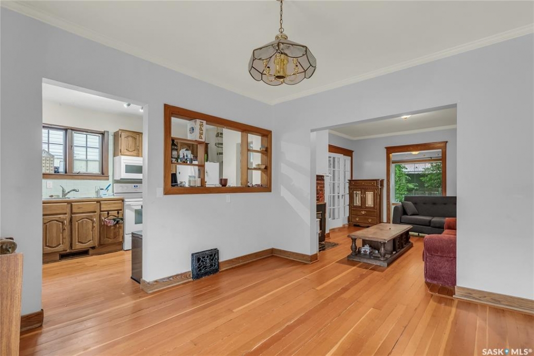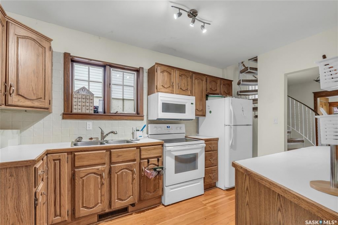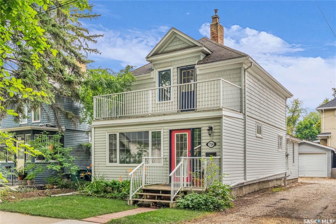 Welcome to 714 King St in desirable City Park! This charming 2-bedroom + den (could be used as a small bedroom) , 2-bath, 2-storey character home sits on a unique lot with a detached garage and a lovely backyard. The main floor features a bright kitchen, formal dining with deck access, spacious living room, and front sitting room. Upstairs offers a large primary, one additional bedroom & den, a clawfoot tub, and access to a fantastic front balcony. The basement includes a large family room, storage. With a front and rear mudroom, laundry, this home is both functional and full of character—perfectly located near City Hospital and downtown amenities.