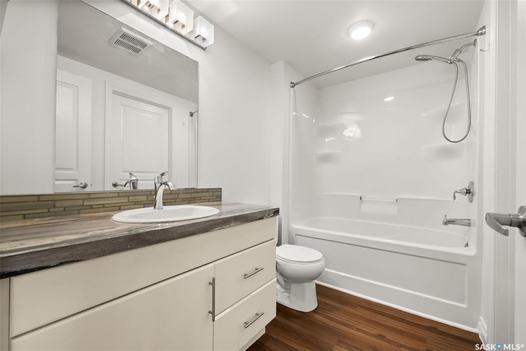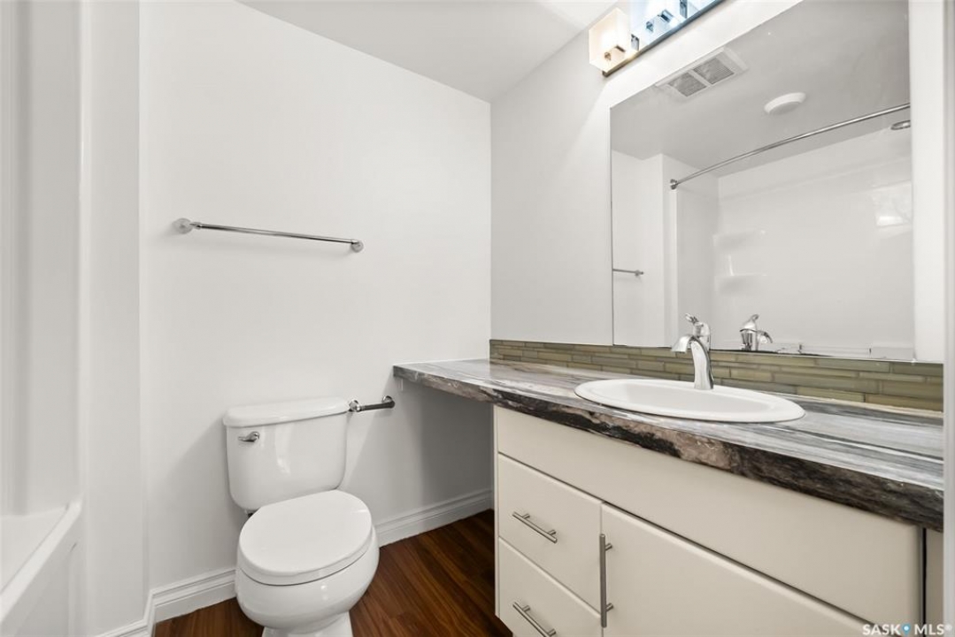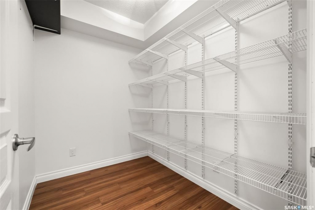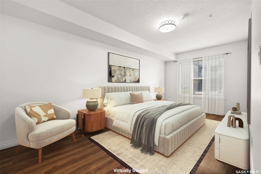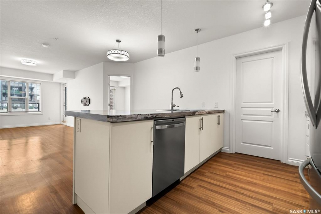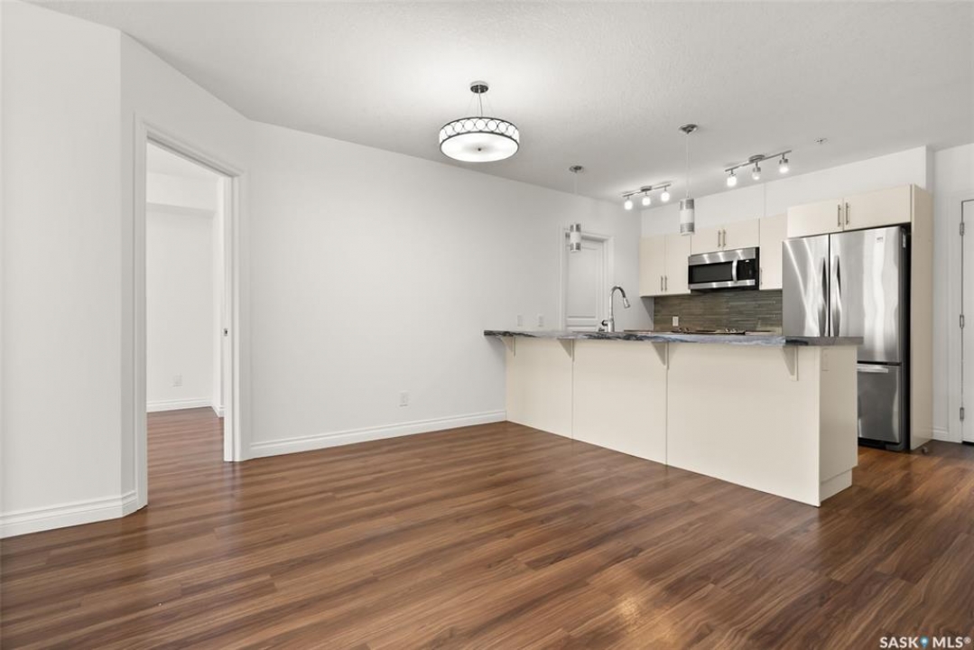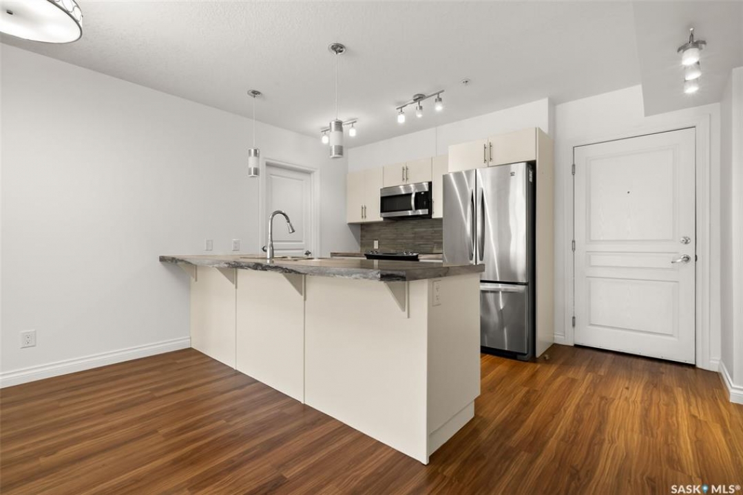 Welcome to Fontaine Bleu, where style meets convenience in the heart of Harbour Landing. This vibrant community brings a touch of Miami flair to Regina with amenities designed for modern living—dog wash station, car wash, bike storage, fitness centre, and a stylish amenities room for gatherings. Inside, this bright, open-concept condo is instantly inviting with paint so fresh it looks brand new. The kitchen is a showstopper with sleek stainless steel appliances, an island with seating, and a walk-in pantry large enough for your small appliances—and even a deep freeze. Whether you're hosting friends or enjoying a quiet evening in, the living and dining areas offer the perfect canvas to create your ideal space. The primary suite feels like a private retreat, featuring a walk-thru closet and a 4-piece ensuite with space for a makeup vanity. A second bedroom also boasts a walk-thru closet and private access to the main bathroom, making it perfect for guests or a home office. For added convenience, you'll find an in-suite laundry room. Luxury vinyl plank flooring runs throughout—stylish, durable, and pet-friendly. Step out to your private patio to soak up the summer sun or nurture a garden of potted blooms. This unit also includes TWO underground parking stalls (#219 & #220)—a rare and valuable find. With Harbour Landing's walking paths, parks, and the Grasslands shops and restaurants just steps away, you'll love the lifestyle as much as the home itself. Condo fees cover heat, water, sewer, building insurance, maintenance, lawn care, snow removal, and reserve fund contributions, so you can enjoy peace of mind and hassle-free living. Move-in ready, pet-friendly, and packed with extras—this Fontaine Bleu condo is the perfect blend of comfort, convenience, and community.
