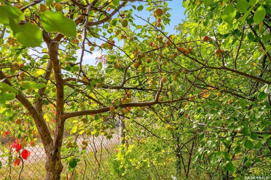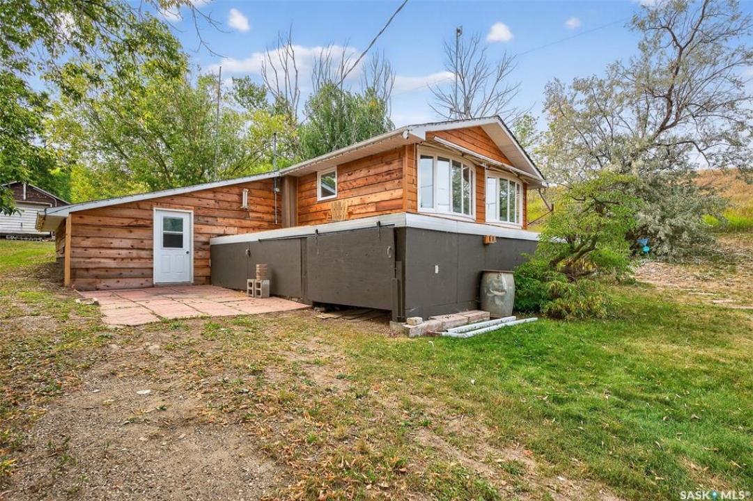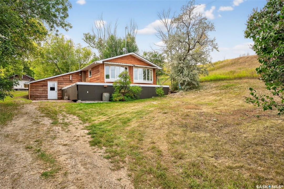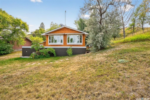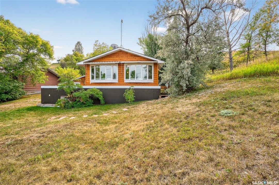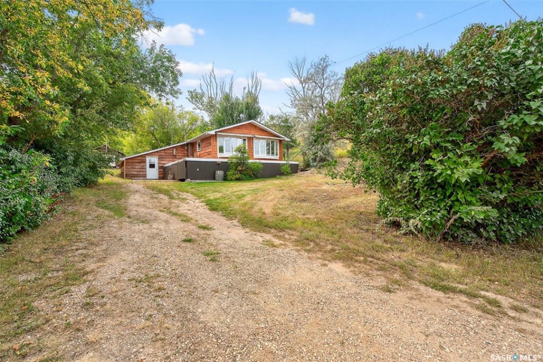 Charming year-round property at Parkview on Buffalo Pound Lake! This inviting 2-bedroom home offers comfort, functionality, and lake-life charm. As you approach, you're welcomed by a spacious front deck with convenient storage underneath. Inside, the open-concept layout connects the kitchen and living room, highlighted by large windows that fill the space with natural light. The kitchen features updated cabinetry, a modern sink, a generous pantry, and a functional island that doubles as a prep area and eating space. The main level includes a well-sized bedroom and a spacious 4-piece bathroom, complete with laundry. At the back of the home, step out to a screened-in deck that overlooks a large yard—perfect for relaxing or entertaining. The lower level offers a small additional bedroom, mechanical room, and an extra toilet for convenience. Outdoors, the property includes an older garage, a fenced area with multiple raised garden beds, and a pathway leading to a private trail lined with apple trees and Saskatoon berry bushes. This is an ideal opportunity to own a cozy four-season retreat with both modern updates and natural beauty at your doorstep.