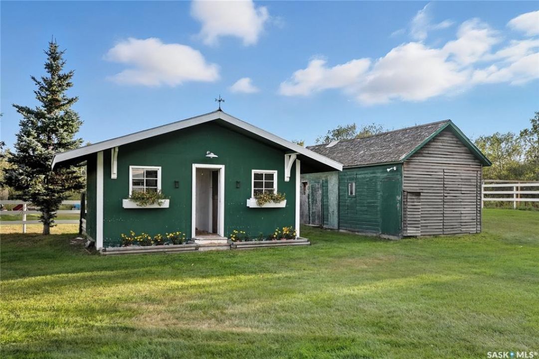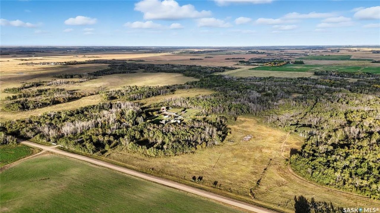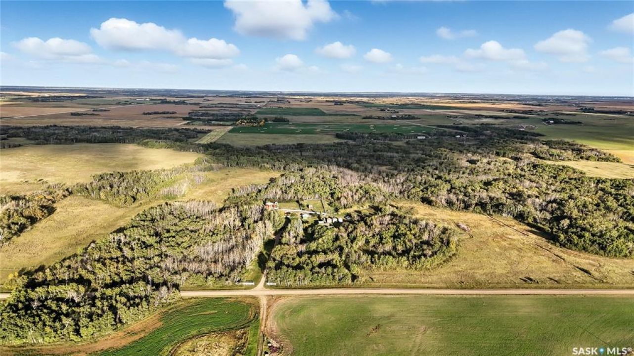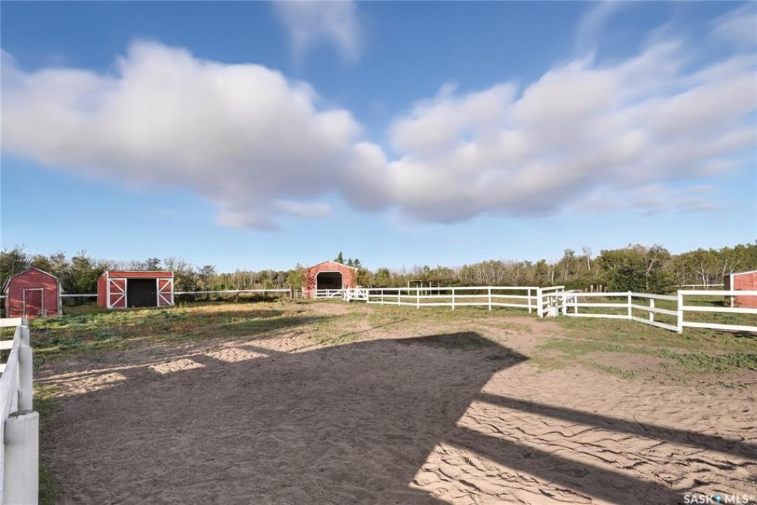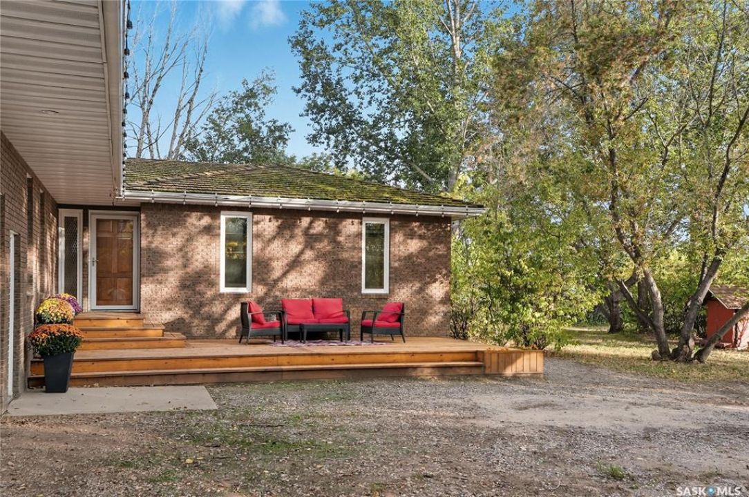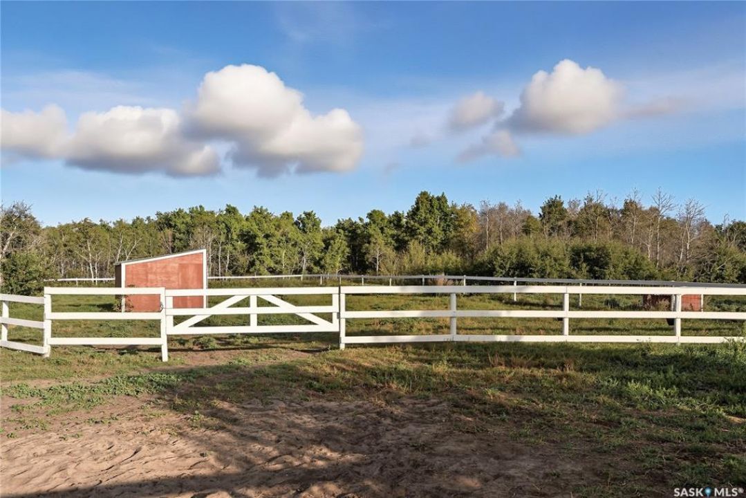 You will feel welcome from the moment you turn into the tree lined driveway, this is truly the acreage dreams are made of! Outside living begins here in this well treed, fenced 80 acres with 2 pens, just 15 minutes north of Saskatoon. The beautiful landscaped yard includes an excellent firepit/ bar area, new deck in back, plus larger deck on front, lush green grass, garden areas, chicken coop, 10x12 horse shelter, 24x 24 hayshed, and workshop. Property has 2 wells, an underground cistern, septic pump out and a newer septic tank. This well built bungalow offers brick exterior, cedar shakes, solid dry preserved wood foundation, and double attached heated garage with direct entry. Inside the main floor offers 4 bedrooms, 3 bathrooms, updated flooring, wood burning fireplace in the family room, main floor laundry & excellent storage. The kitchen is timeless oak with glass inserts on the upper cabinets, stainless steel appliances, plus around the corner is the patio doors to the new deck with natural gas bbq hook up. Primary bedroom does have a 4 piece ensuite and spacious counter. The basement offers 9 ft ceilings and is open for your desired development. Quiet location with close proximity to Saskatoon, school bus services to Dalmeny K-12. Contact your agent today, presentation of offers will be Sept 23, 2025 at 5 pm.