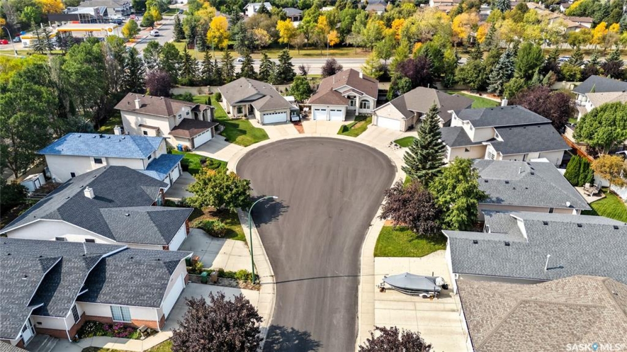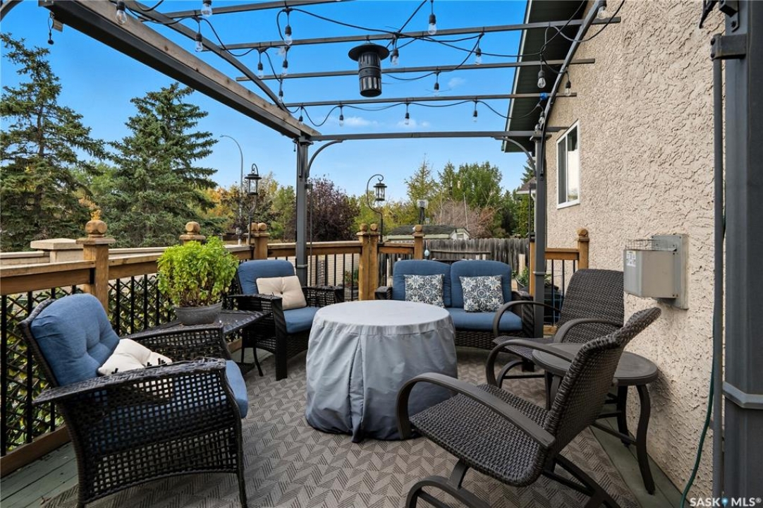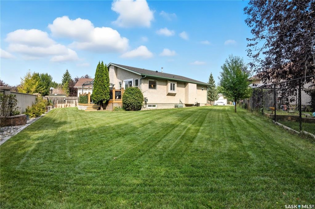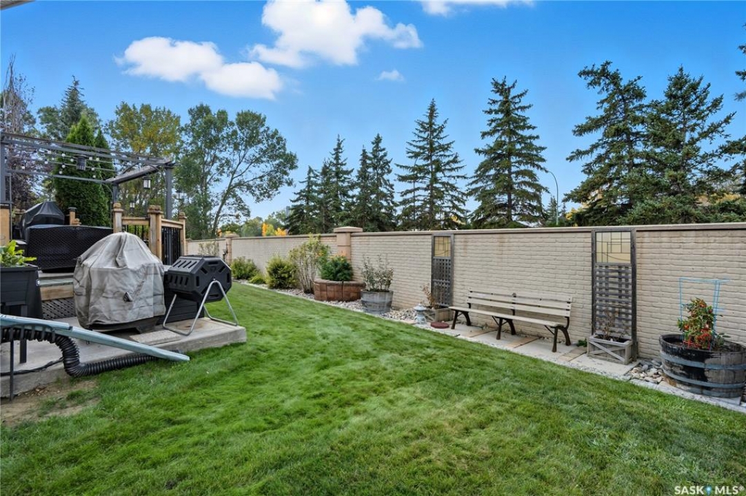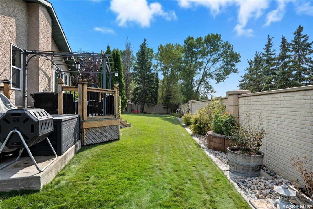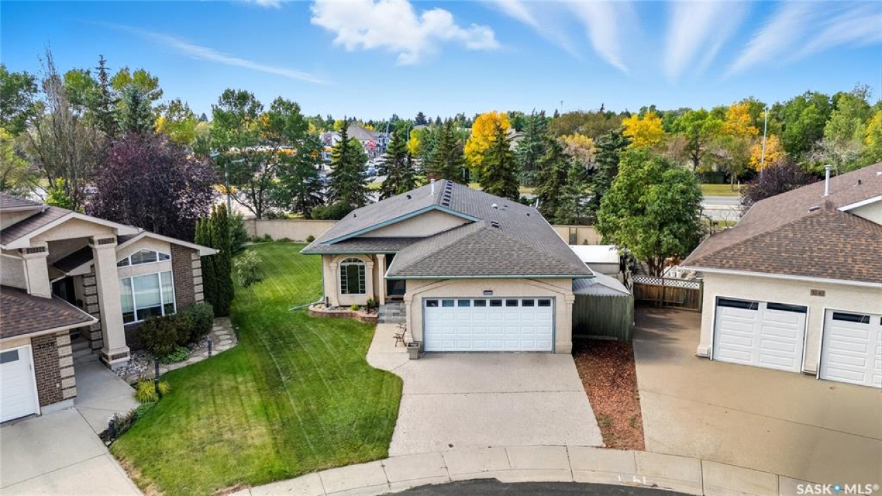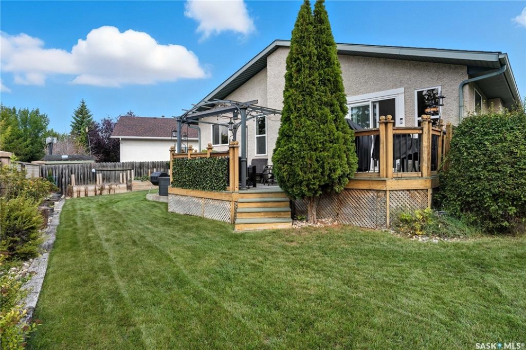 Welcome home to a well maintained bungalow on a large 7,933 sq ft pie-shaped lot in a quiet and kid friendly Windsor Park cul-de-sac. Walking paths, parks, coffee shops, shopping, amenities and Sandra Schmirler Leisure Centre are a short walk away. This location has it all! The main floor offers over 1,300 sq ft with three bedrooms, including a huge primary suite with his-and-hers closets and a fully remodeled ensuite boasting a deep soaker tub, separate glass shower and classic subway-tile surround. Vaulted ceilings showcase the open-concept kitchen, dining and living areas where gleaming hardwood floors, a gas fireplace with built-in entertainment centre, and abundant natural light create a warm family hub. The updated kitchen is a showpiece — granite counters, white-wash cabinetry, walk-in pantry, gas range and an eat-up island that's perfect for casual meals and conversation. The fully developed basement adds flexible space: a fourth bedroom (note: basement bedroom window does not meet egress), a den, a large recreation room, generous storage, separate laundry area and utility room — ideal for family, work-from-home or hobbies. Outside, enjoy morning coffee on the composite deck with pergola and a hot-tub-ready pad (220V and electrical ran; currently disconnected at the main breaker). The double attached garage already has gas and electrical lines roughed in for future heating (attic insulation remains to be completed). Recent and notable updates include kitchen and bath renovations, updated light fixtures, a backflow valve, house insulation top-up, mud jacking to the garage pad, plus custom slate and stone accents. Smart blinds with remotes are included for the front and dining windows. Value-packed and move-in ready, this home blends thoughtful updates with practical family living and a backyard made for entertaining. Don't miss out, contact your agent today to schedule a showing