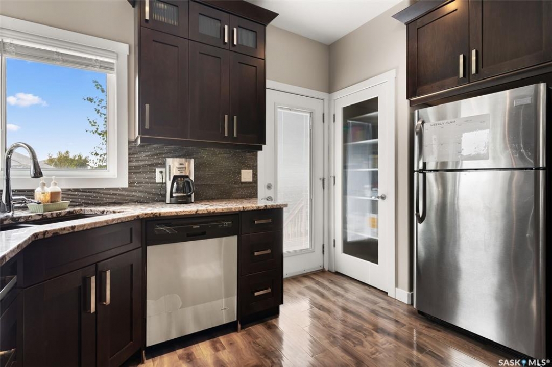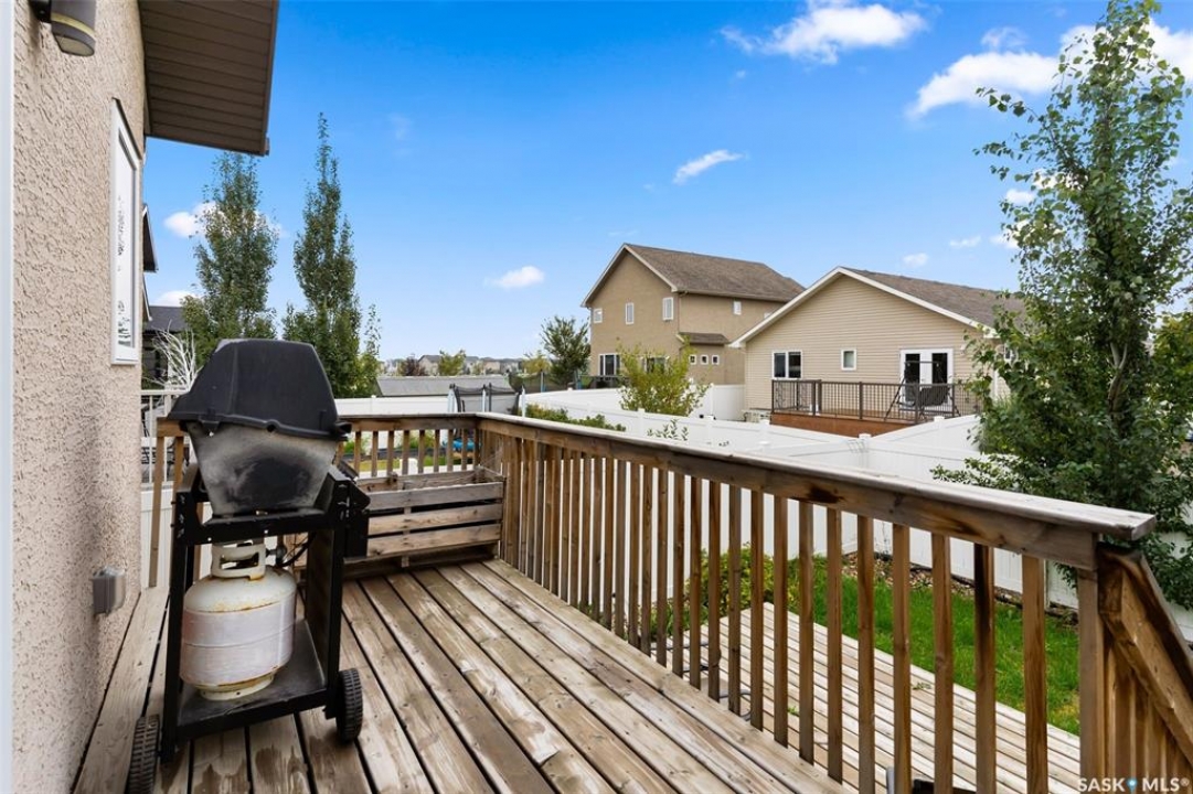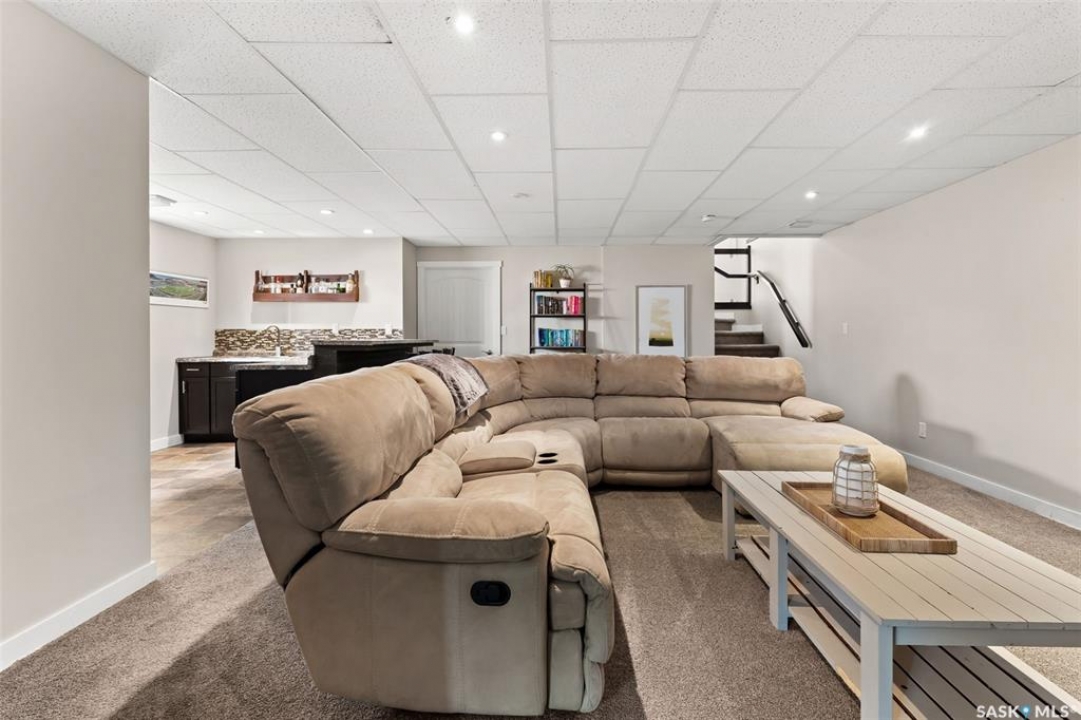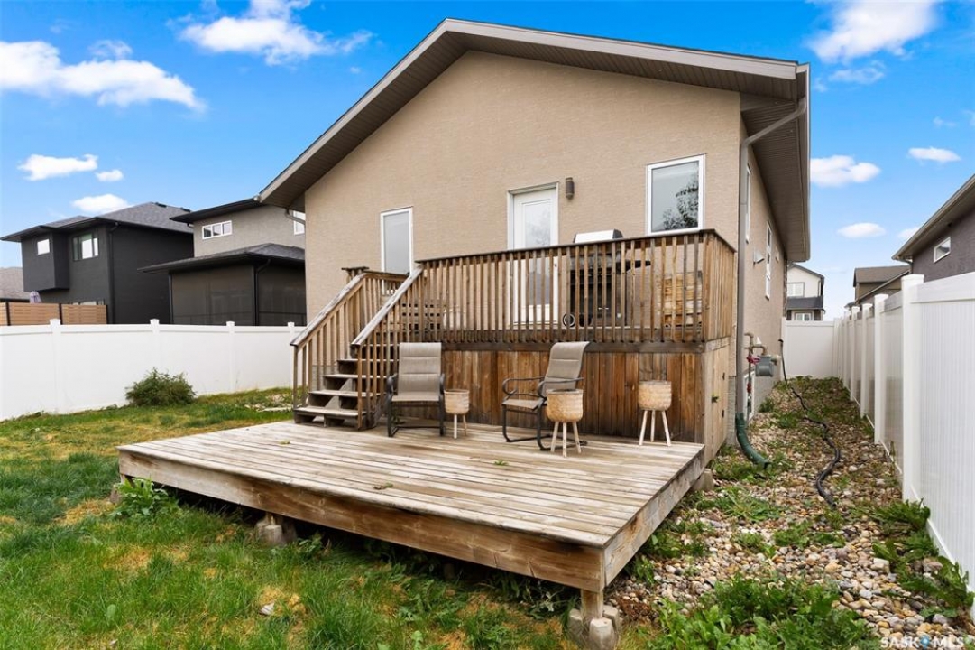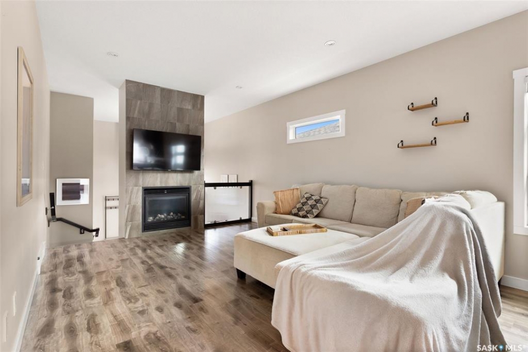 This stunning 5 bed, 3 bath bi-level perfectly blends style, function, and location—nestled on a quiet street just steps from both public and Catholic elementary schools, playgrounds, and the convenience of Acre 21 shopping and dining. From the moment you step inside, the grand tiled foyer makes a statement. A striking feature wall with a gas fireplace sets the tone, while the custom glass-inset railing hints at the thoughtful upgrades throughout. Upstairs, soaring 9' ceilings and warm engineered hardwood floors create an inviting atmosphere. The kitchen is a true centerpiece, featuring rich dark cabinetry, a corner double sink framed by two windows, granite countertops, stainless tiled backsplash, pantry, and a peninsula with seating—perfect for morning coffee or evening conversation. The primary suite is a retreat of its own, complete with a walk-in closet and a 4-piece ensuite. Two additional bedrooms, a 4-piece bath, and the convenience of main-floor laundry round out the upper level. The fully finished basement offers even more living space with a bright rec room, wet bar for entertaining, two large bedrooms, and a 3-piece bath. Every detail has been considered, from the HE furnace, Central A/C, HRV, and tankless water heater to the sump pump and backflow valve. The triple-car garage is insulated and boarded, with a handy side yard access door—perfect for families with multiple vehicles, hobbies, or storage needs. Step outside to the south-facing backyard with a two-tiered deck and durable PVC fencing. Built by Queen City Custom Homes.