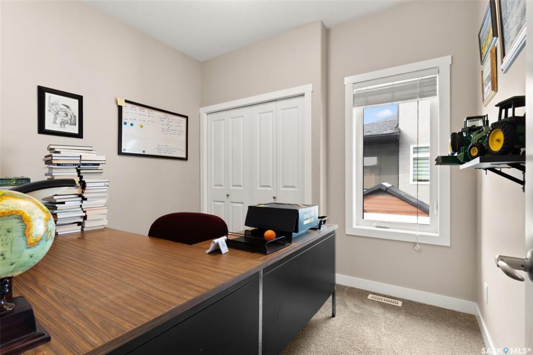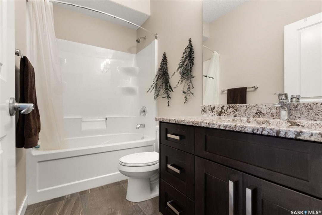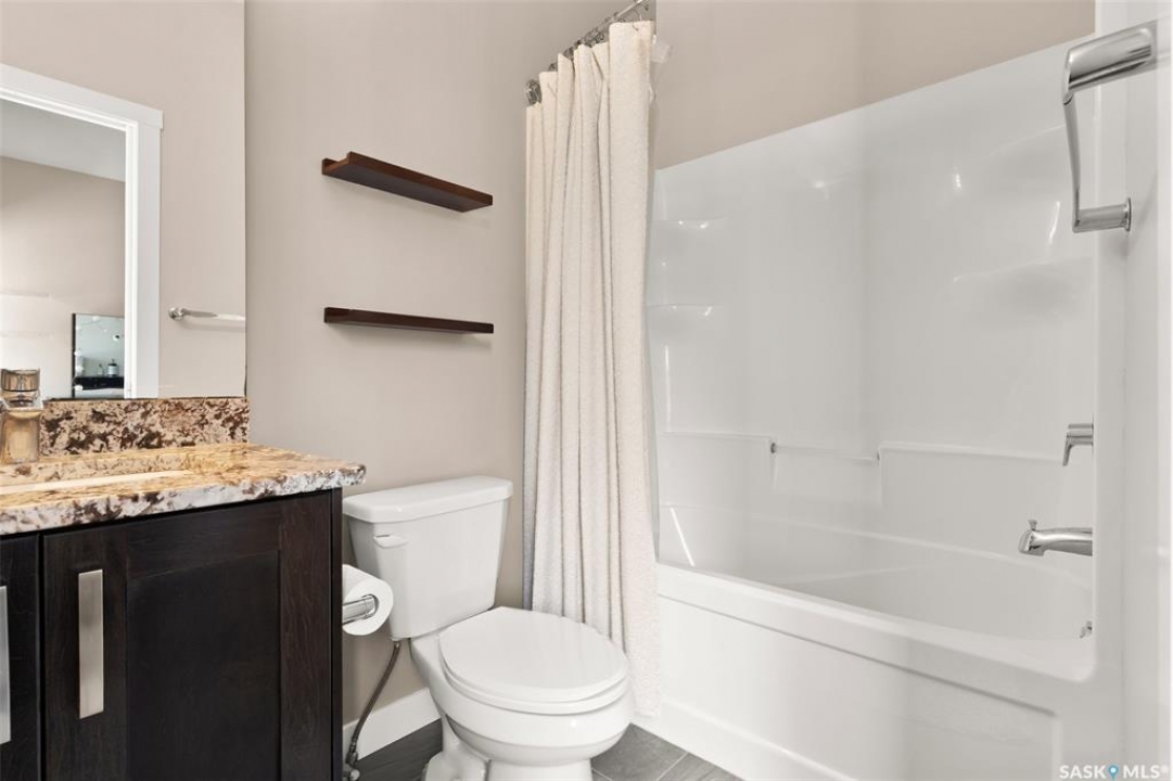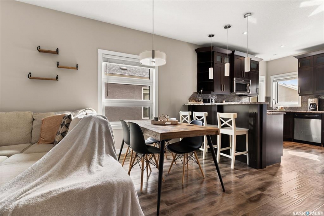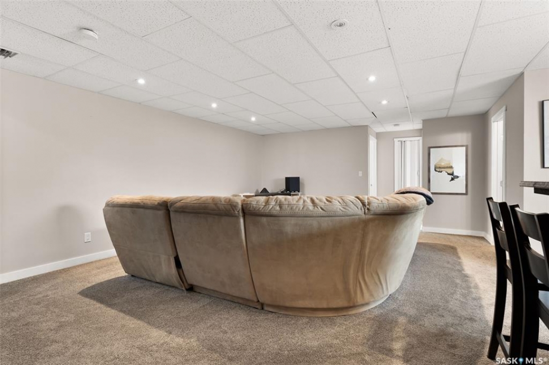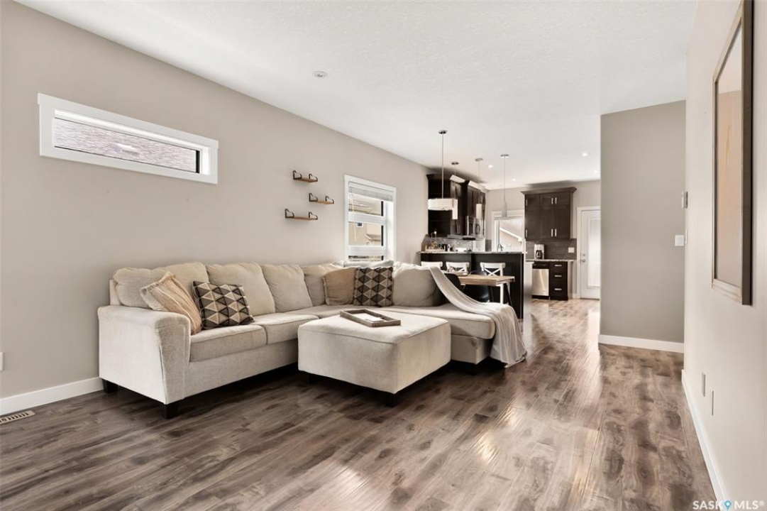 This stunning 5 bed, 3 bath bi-level perfectly blends style, function, and location—nestled on a quiet street just steps from both public and Catholic elementary schools, playgrounds, and the convenience of Acre 21 shopping and dining. From the moment you step inside, the grand tiled foyer makes a statement. A striking feature wall with a gas fireplace sets the tone, while the custom glass-inset railing hints at the thoughtful upgrades throughout. Upstairs, soaring 9' ceilings and warm engineered hardwood floors create an inviting atmosphere. The kitchen is a true centerpiece, featuring rich dark cabinetry, a corner double sink framed by two windows, granite countertops, stainless tiled backsplash, pantry, and a peninsula with seating—perfect for morning coffee or evening conversation. The primary suite is a retreat of its own, complete with a walk-in closet and a 4-piece ensuite. Two additional bedrooms, a 4-piece bath, and the convenience of main-floor laundry round out the upper level. The fully finished basement offers even more living space with a bright rec room, wet bar for entertaining, two large bedrooms, and a 3-piece bath. Every detail has been considered, from the HE furnace, Central A/C, HRV, and tankless water heater to the sump pump and backflow valve. The triple-car garage is insulated and boarded, with a handy side yard access door—perfect for families with multiple vehicles, hobbies, or storage needs. Step outside to the south-facing backyard with a two-tiered deck and durable PVC fencing. Built by Queen City Custom Homes.