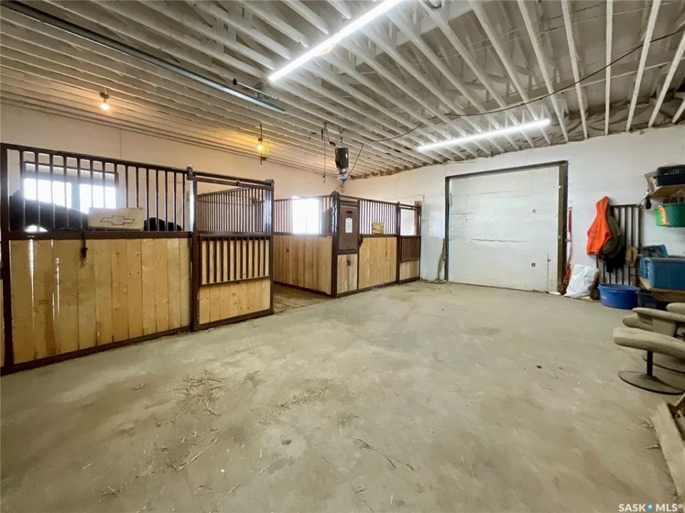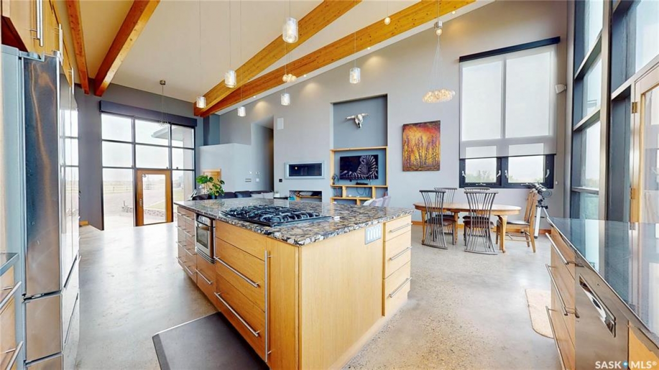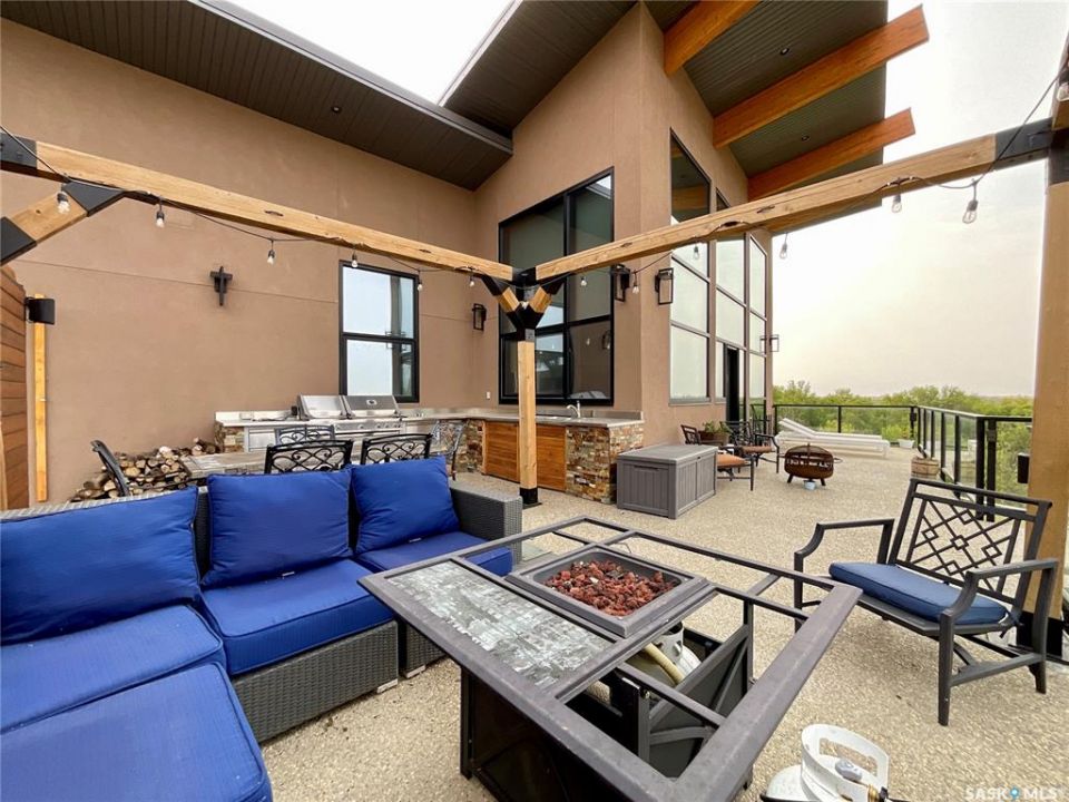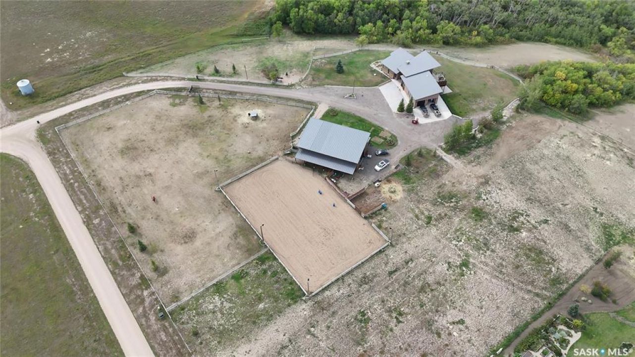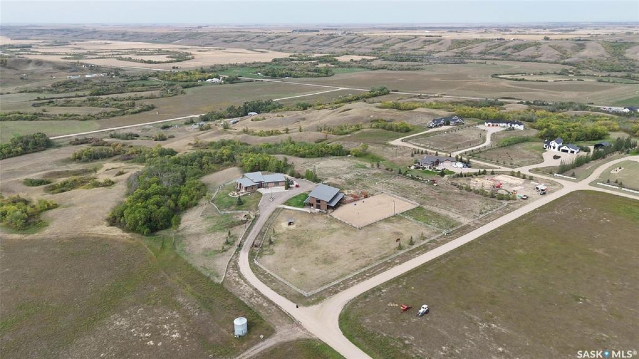 Experience 40 Apollo Drive in the Acreages at Minerva Ridge near Lumsden. From the powered gate and lit lane, this 5-bedroom, 4-bath home offers 2,200 sq. ft. on the main plus a full walkout level, including a private entrance suite for extended family or a caregiver. Floor-to-ceiling curtain wall windows showcase the Wascana and Qu'Appelle valleys, filling the home with light. Built for comfort and efficiency, the home features zoned in-floor hydronic heating, high-efficiency boiler, gas furnace with A/C backup, spray foam insulation, EIFS stucco, triple-pane argon windows, and a 12.6 kW solar system powering both house and barn—keeping costs near net zero. The kitchen includes a built-in gas cooktop, double wall oven, drawer microwave, fridge, dishwasher, and a butler's pantry with upright freezer and extra fridge. A mudroom with built-ins sits just off the garage. Technology upgrades include RA2 automation for blinds, lights, climate, and locks, whole-home audio, five video screens, Ring security, an 8-camera CCTV system, and permanent holiday lights. The lower level adds a wet bar, games area, and gym with overhead door for fresh air workouts. Outside, enjoy a covered patio with built-in BBQ, 8-person hot tub, and heater. A heated 1,080 sq. ft. garage and 35x70 insulated barn/shop provide storage, stalls, tack room, hay loft, and heated workshop. Equine features include a 100x180 LED-lit riding arena, two fenced pastures with solar fencing, and automatic water systems. Extras include a reinforced secure room, 200-amp service, water softener, and custom cold storage. Lumsden's schools and amenities are minutes away, with Regina only a 15-minute drive. Purchasers also have first right of refusal on the adjoining 3-acre parcel. https://youtu.be/mPkNdWGtmeE