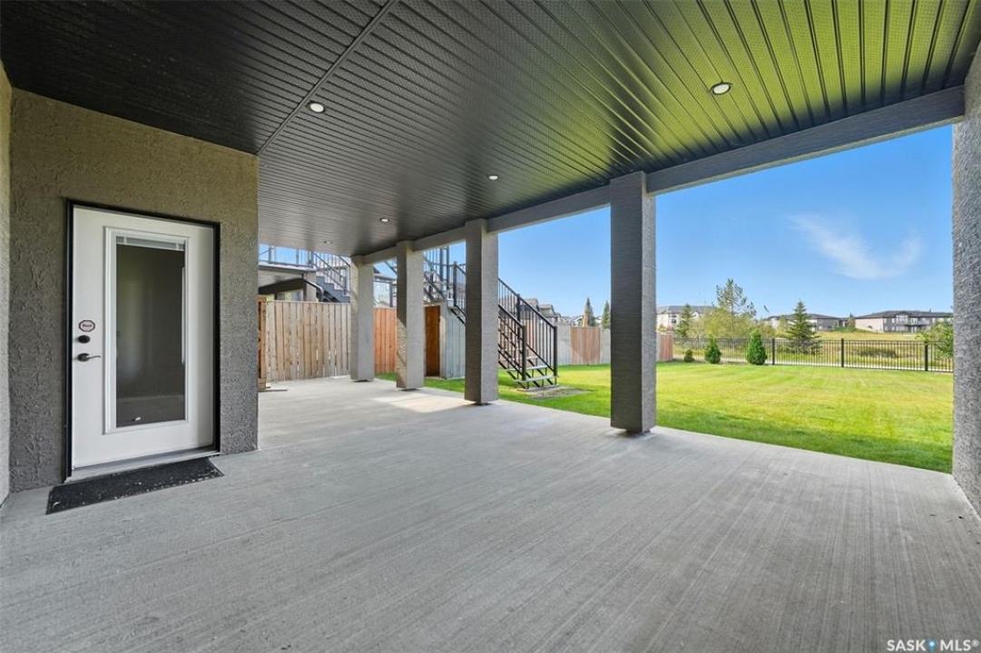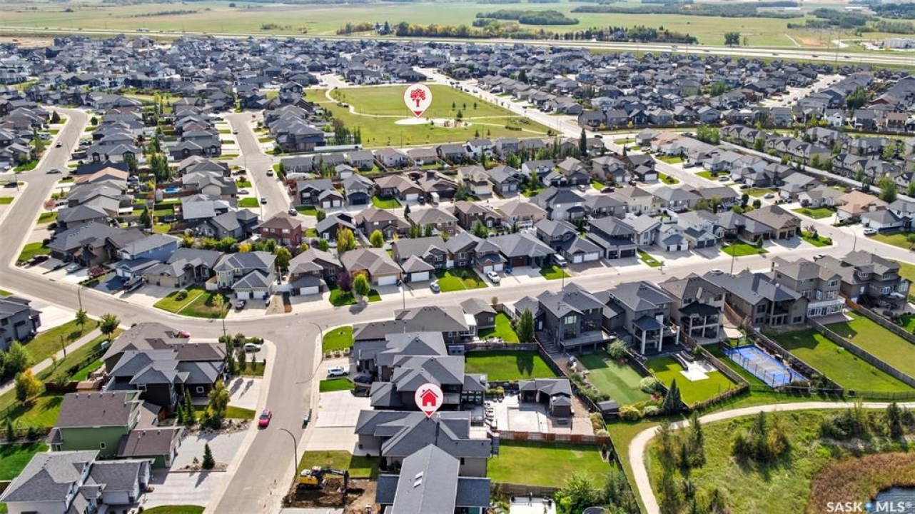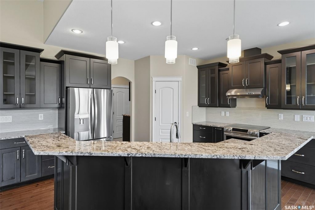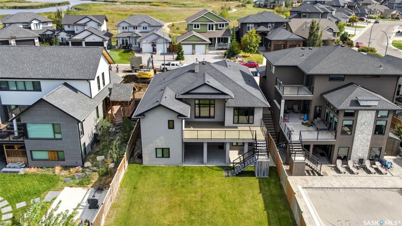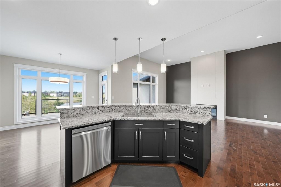 Welcome to 714 Ledingham Place, a rare find in a fantastic cul-de-sac location backing onto Hyde Park with breathtaking water views. Situated on a massive 9,559 sq. ft. lot with a sunny southwest-facing backyard, this D&S–built walkout bungalow offers over 3,600 sq. ft. of luxurious living space with top-quality finishes inside and out. The striking stone and stucco exterior, oversized driveway accommodating up to five vehicles, and impressive curb appeal set the tone. Inside, the main floor boasts soaring 12-ft ceilings, a spacious foyer with tile flooring, open-concept living with a tiled feature wall and gas fireplace, and a chef's dream kitchen with abundant maple cabinetry, granite countertops, tiled backsplash, corner pantry, and a generous dining area overlooking the park and pond. Hardwood flooring flows throughout, complementing three large bedrooms, including a primary suite with walk-in closet and spa-like ensuite featuring dual sinks and a tiled shower. Main floor laundry adds convenience. The bright walkout basement expands the living space with a large games room, family room, office, two additional bedrooms with walk-in closets, a 5-piece bath with jetted tub, and durable laminate flooring. Outdoor living shines with a composite deck, glass railing, and stairs leading to the park-like yard with underground sprinklers on a timer. Additional upgrades include triple-pane windows, central vac, HRV, new central A/C (2025), dishwasher (2023), and fridge (2021). Close to schools, shopping, and all amenities, this home truly shows 10/10.