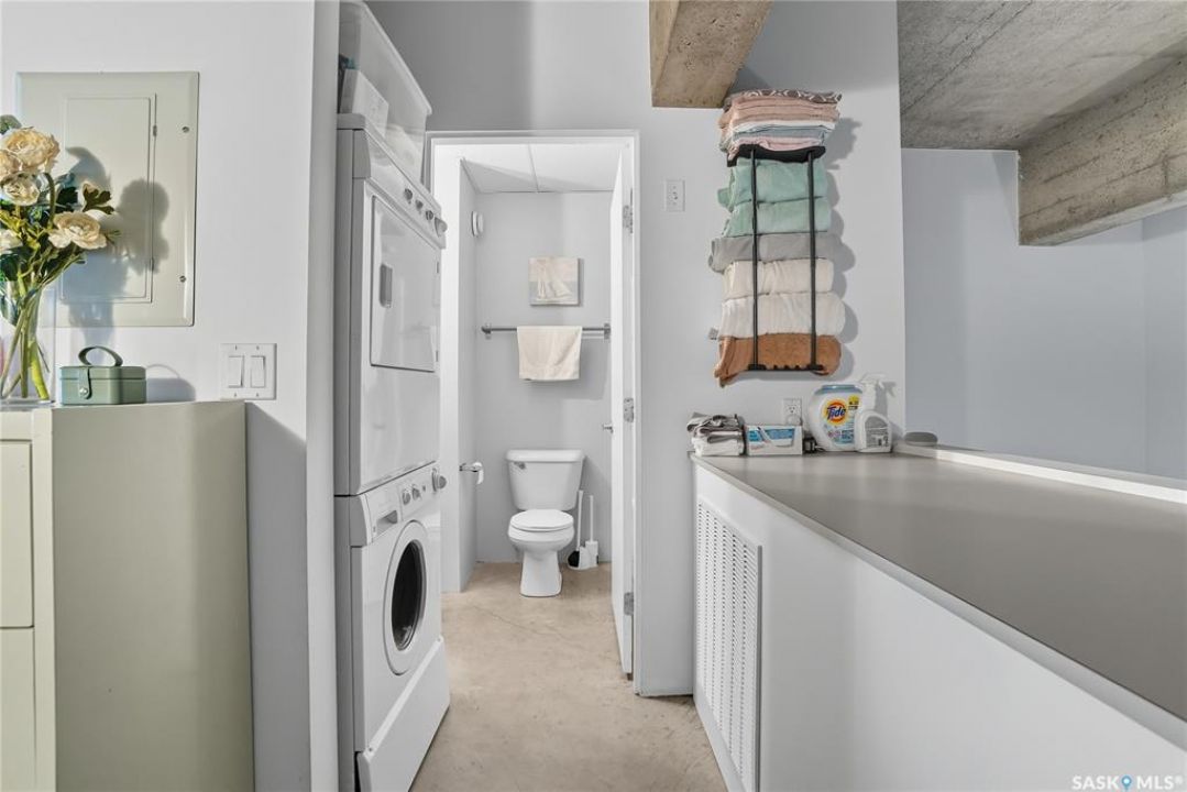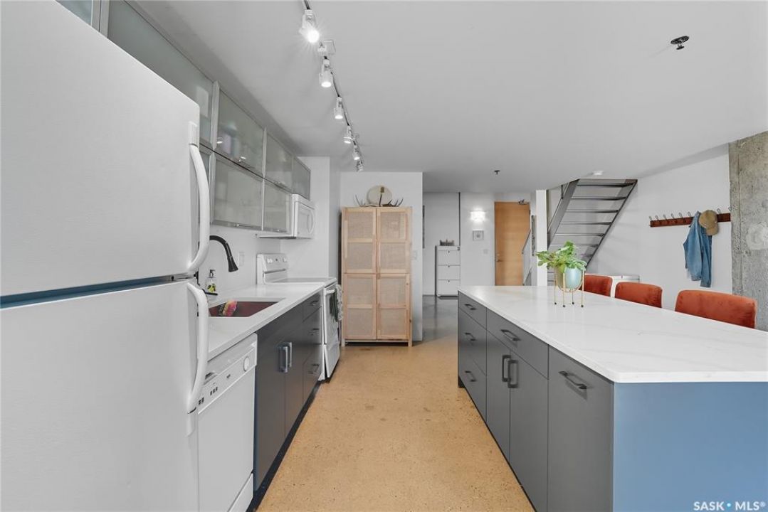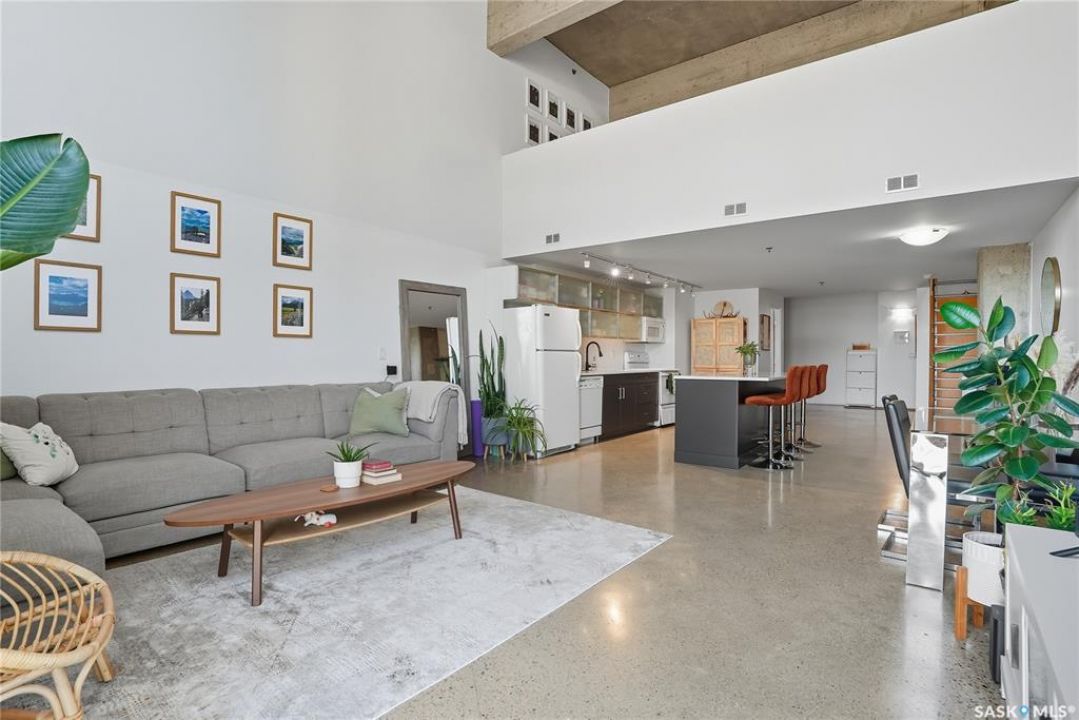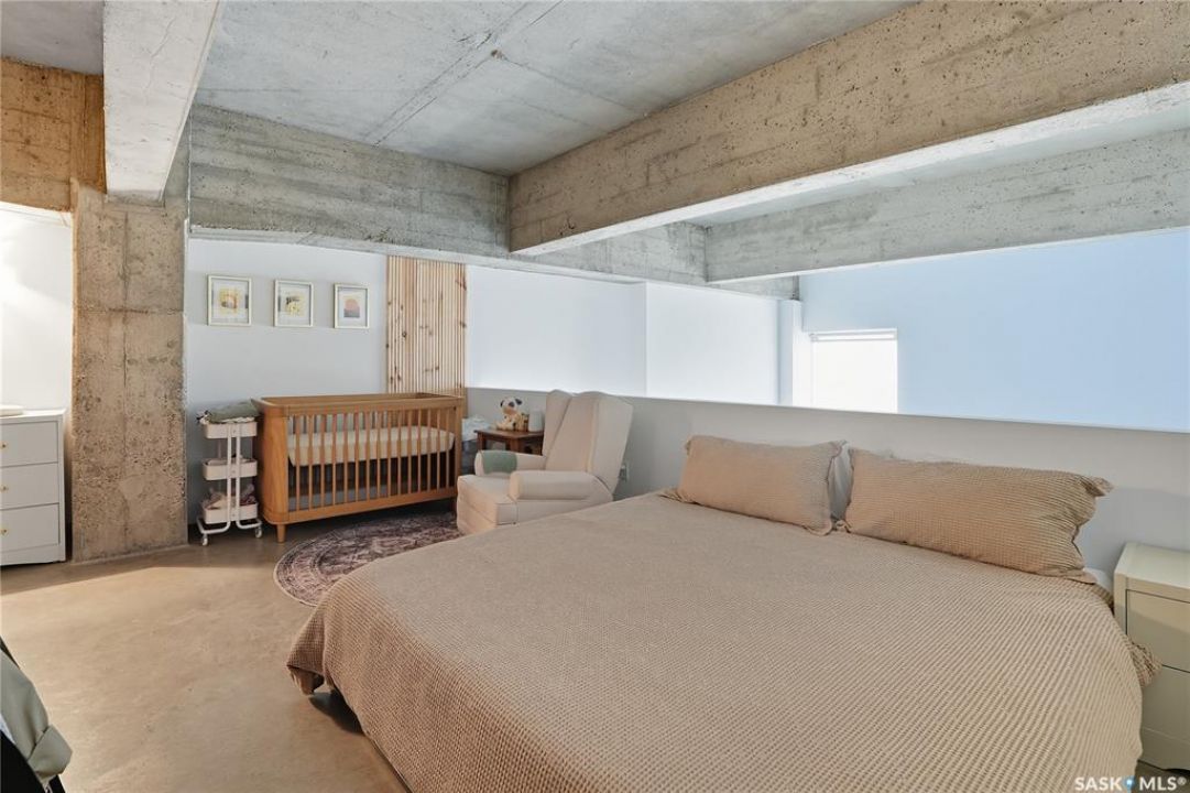 Welcome to this stunning East-facing loft located in the heart of Saskatoon's Central Business District. With 1,100 square feet of free-flowing living space, this 1-bedroom, 1.5-bath unit combines industrial charm with modern finishes, offering the perfect balance of comfort, style, and urban convenience. Soaring ceilings and a large window flood the space with natural light, enhancing the airy, open-concept layout. The kitchen has been beautifully upgraded with new quartz countertops and an oversized island—ideal for both entertaining and everyday living. The spacious living and dining areas flow effortlessly, creating a versatile space for relaxing or hosting. The large bedroom features a 4-piece ensuite, while a separate half-bath adds convenience for guests. Located directly across from the buildings fitness centre and rooftop terrace access, this unit offers unmatched access to some of the building's best amenities. The building itself is a standout in downtown living, with a modern lobby, rooftop terrace complete with a pergola-covered BBQ area, fitness centre, elevator, and heated underground parking. Live just steps from some of Saskatoon's best restaurants, coffee shops, shopping, nightlife, and the riverbank. Whether you're a professional looking for a stylish downtown home or an investor seeking a high-demand location, this loft offers exceptional value and a lifestyle that's hard to beat.