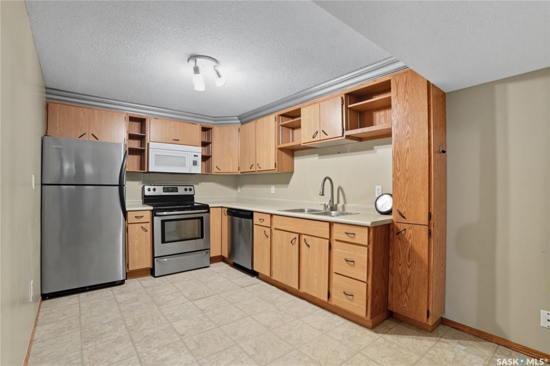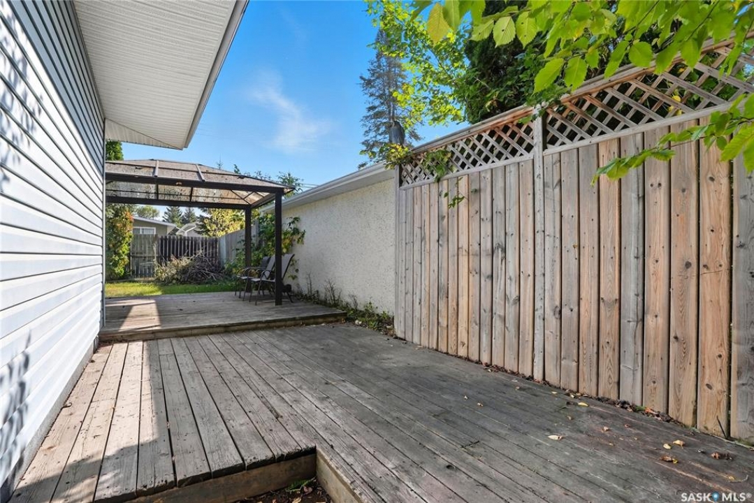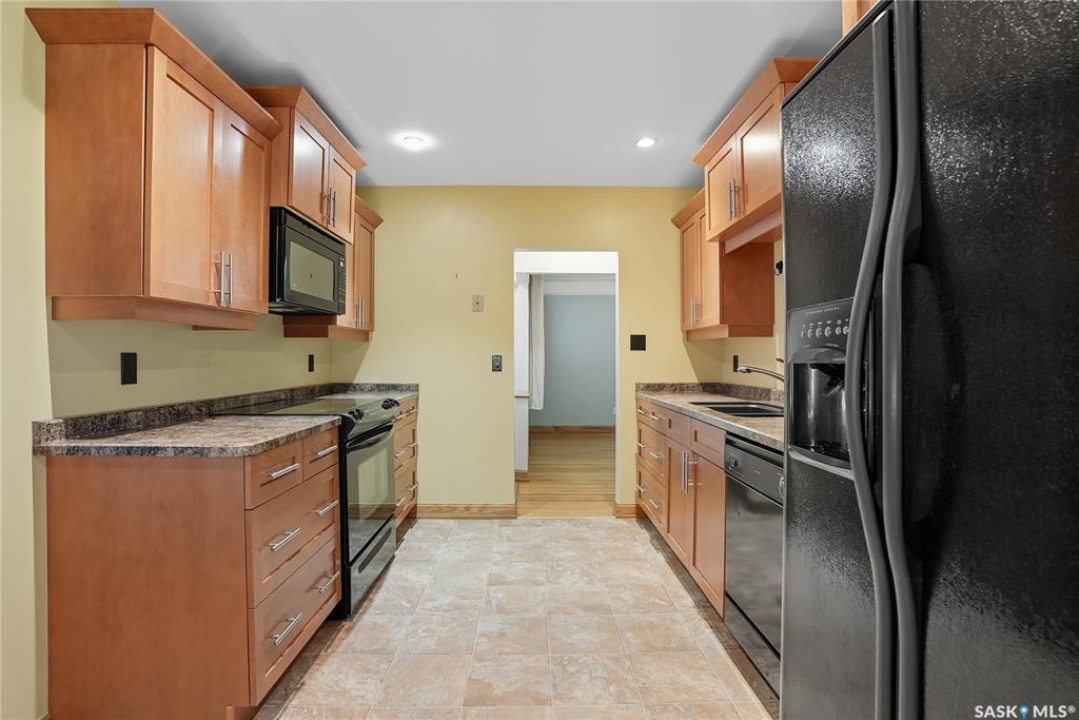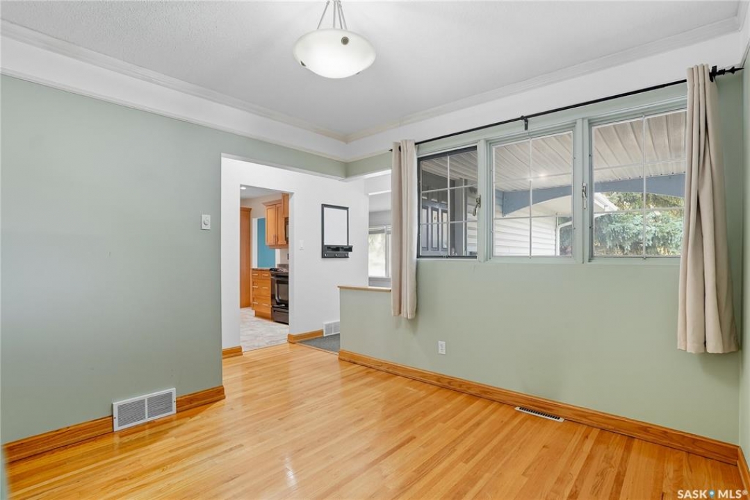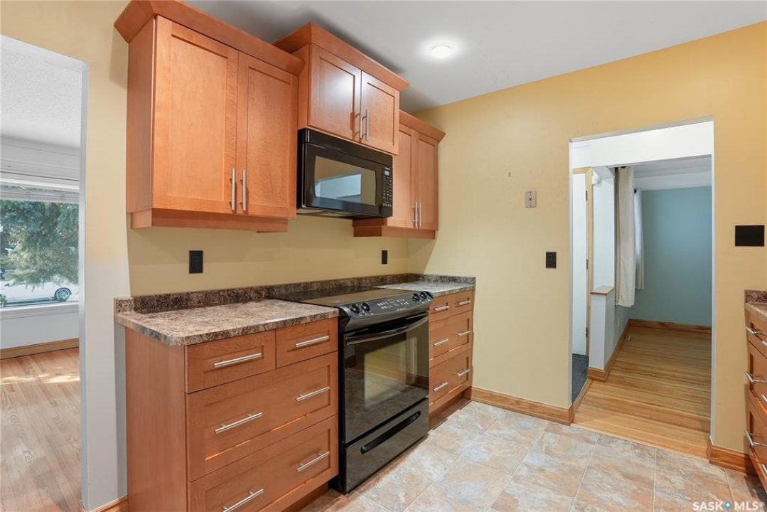 Charming Revenue Property in Sutherland – Updated & Move-In Ready! This beautifully maintained 1,034 sq ft revenue home is ideally located in the sought-after Sutherland neighborhood, offering excellent investment potential or a comfortable family home with a mortgage helper. Step inside to a bright and spacious living room at the front of the house, featuring large windows that flood the space with natural light. You'll love the warmth and character of the oak hardwood floors flowing through the living room, dining area, and both upstairs bedrooms. The remodeled kitchen includes a convenient breakfast bar with views out a large window—perfect for morning coffee or casual dining. The formal dining room could easily be converted into a third main-floor bedroom if desired. Downstairs, the large non-conforming suite with a separate entrance offers significant revenue potential. It includes a generous bedroom with a walk-in closet and a modern bathroom for added comfort. This home comes with important recent upgrades, including a newer furnace and water heater, giving you peace of mind and improved energy efficiency. Exterior features include vinyl siding, metal soffits and fascia, and back lane access with space for RV parking or a future additional garage. There's also a large storage shed attached to the garage for extra convenience. Located just minutes from the University of Saskatchewan, this home offers easy access to campus, public transit, parks, and local amenities.