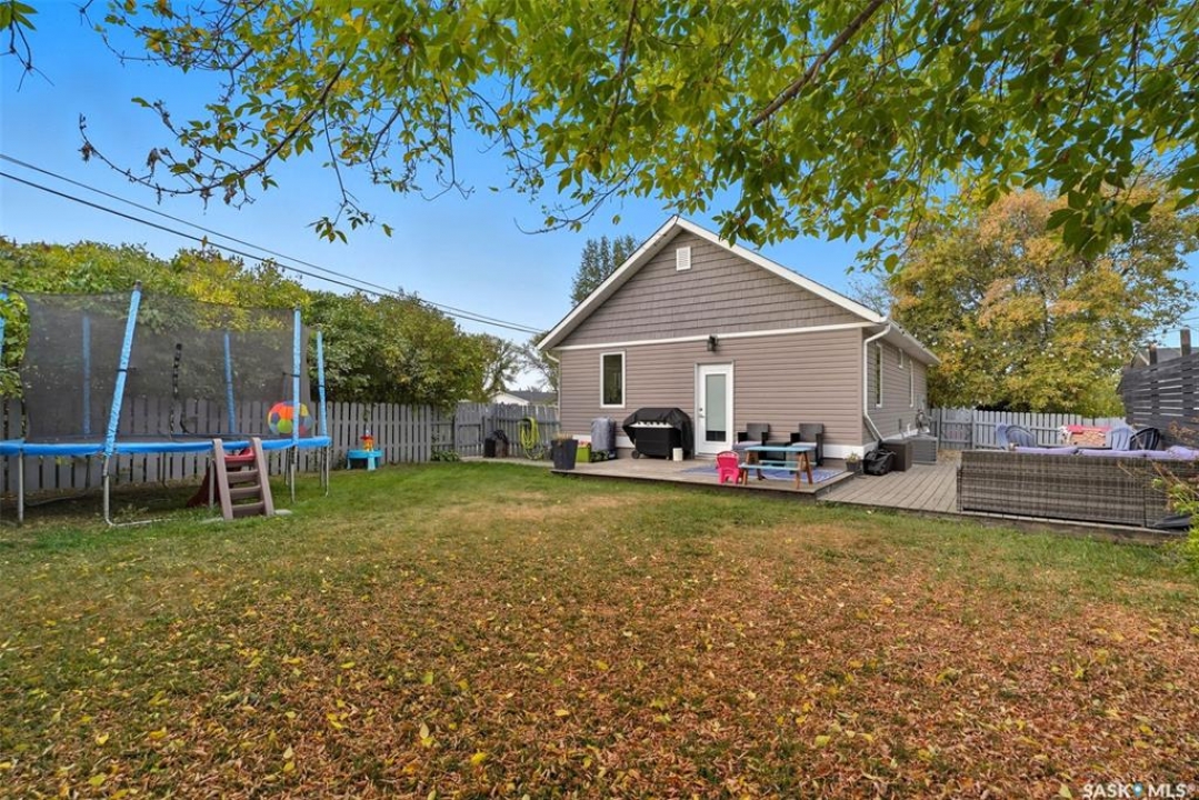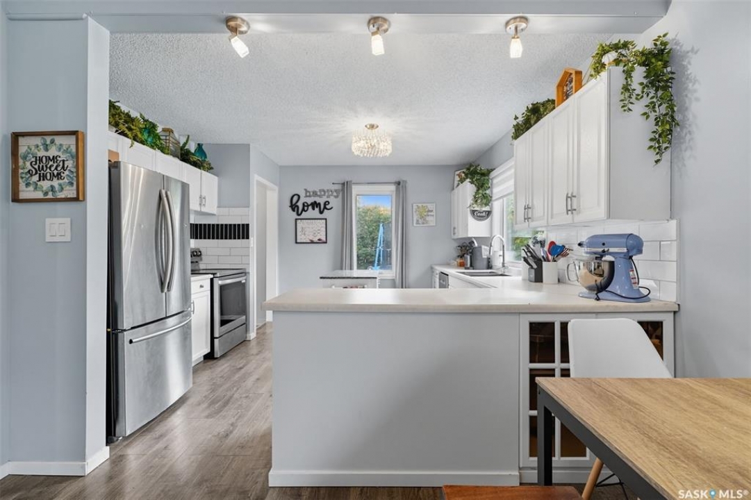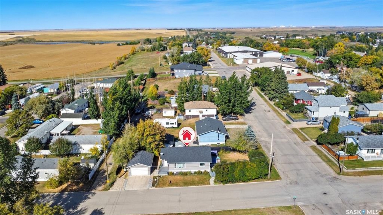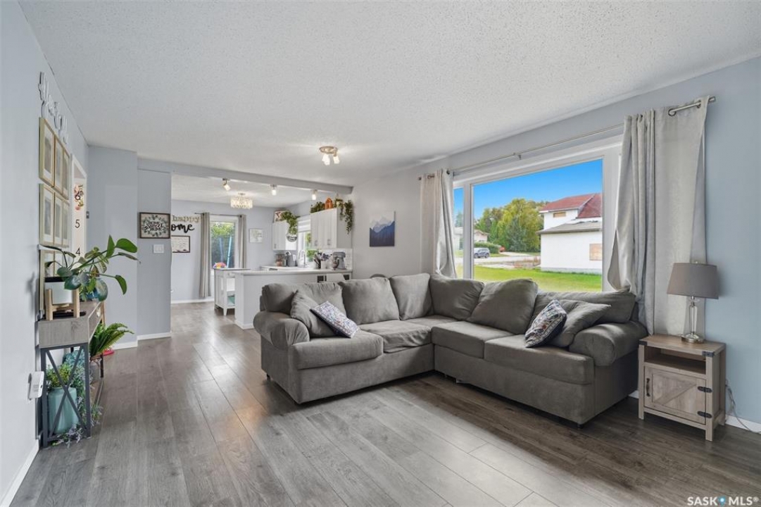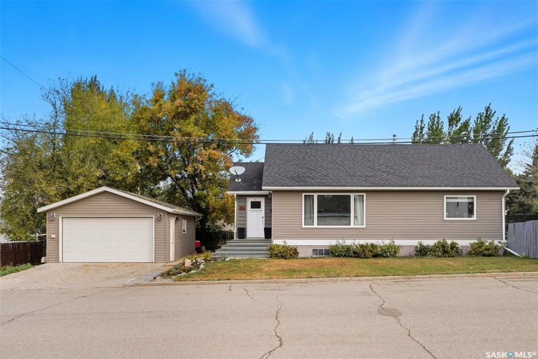 Situated on a large corner lot in Delisle, this 934 square foot home blends comfort, updates, and small-town charm. The front entry offers a practical drop zone and plenty of closet space, setting the tone for an organized and welcoming home. The main floor features an open-concept layout that connects the living room, dining area, and kitchen. Bright white cabinetry, a brand-new stove and dishwasher, and a refreshed sink and backsplash (2025) make the kitchen both cheerful and functional. The primary bedroom includes its own two-piece ensuite, while a second bedroom and a full four-piece bathroom complete the main level. The fully finished basement, completed in 2024, adds valuable living space and includes a new bathroom finished in 2025. Modern comforts like central air conditioning and a heated detached garage ensure year-round convenience. Outdoors, a large back deck with privacy fencing overlooks established perennial gardens, making it an ideal spot for both relaxing and entertaining. With the splash park, ball diamonds, and the golf course all just a short walk away, this property offers the perfect balance of quiet living and community connection. Contact your realtor today to arrange a private viewing