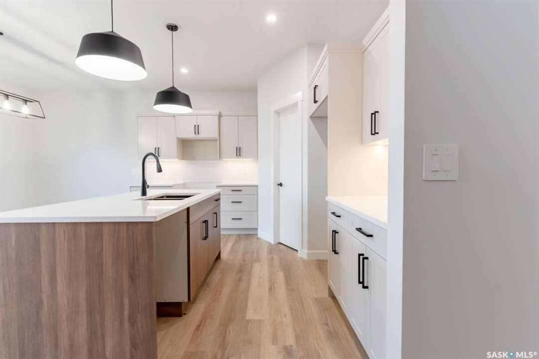 Welcome to The Escada! This beautifully designed 1,848 sq. ft. Step inside from the fully insulated garage into a convenient mudroom that leads directly to the walk-through pantry. The modern kitchen features custom cabinetry, quartz countertops, a stylish backsplash, and a spacious island. An oversized patio door in the dining area and large living room windows fill the space with natural light, while the fireplace creates a cozy atmosphere for winter evenings. Upstairs, a bonus room at the front of the home offers additional living space. The primary bedroom, located at the back, boasts a spacious walk-in closet and a 5' custom tiled shower in the ensuite, complete with dual sinks and extra vanity storage. Two additional bedrooms, a laundry area with a cabinet and sink, and a well-appointed main bath complete the second floor. Outside, the home includes a concrete driveway and front landscaping. Built by Edgewater Homes, this property is covered under the Sask New Home Warranty for peace of mind. Please note: Photos may not be exact representations of the home and are for reference only. Errors and omissions excluded. Prices, plans, and specifications are subject to change without notice. PST & GST included with rebate to builder.