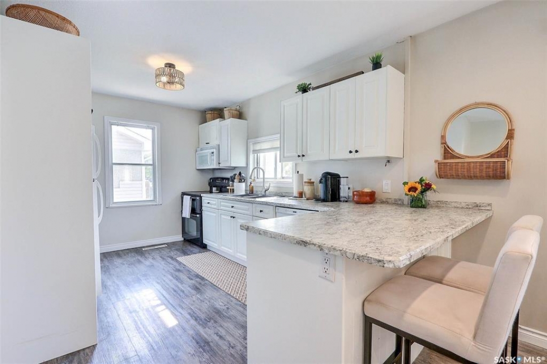 Impeccably maintained 796 sq/ft bungalow crafted in 1952, offering 3 bedrooms and 2 bathrooms. This residence has been extensively updated, showcasing newer flooring, countertops, and complete bathroom renovations, including ceramic tile backsplash and a luxurious soaker tub. Boasting a newly installed forced air natural gas furnace from 2021, along with central air conditioning, this property ensures year-round comfort. The beautifully landscaped yard is partially fenced and includes a two-tier deck plus a 432 sq/ft detached garage, which is heated and hosts a newer overhead door. Meticulously cared for, this home is turnkey with the perfect blend of modern amenities and timeless charm