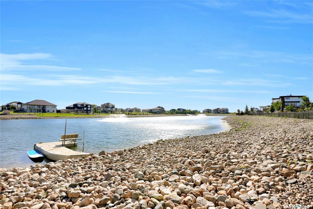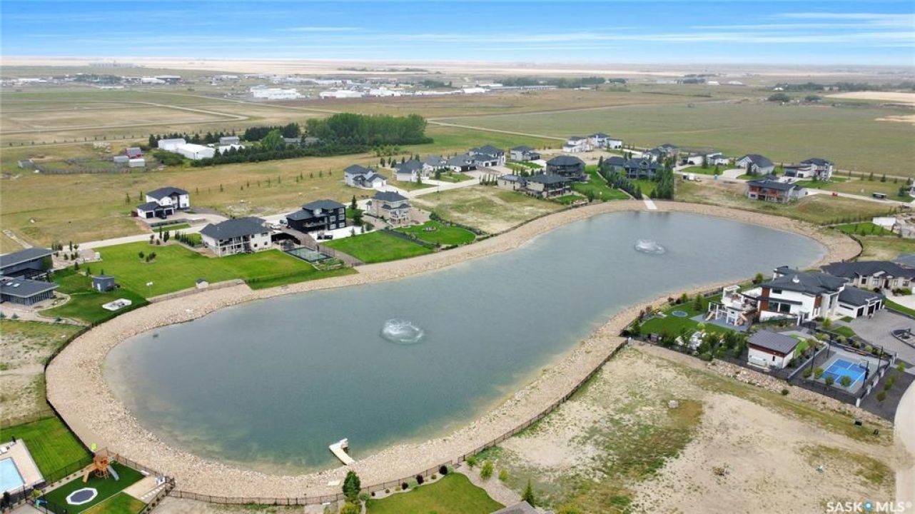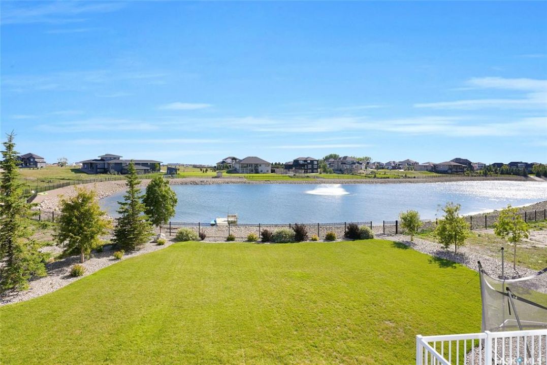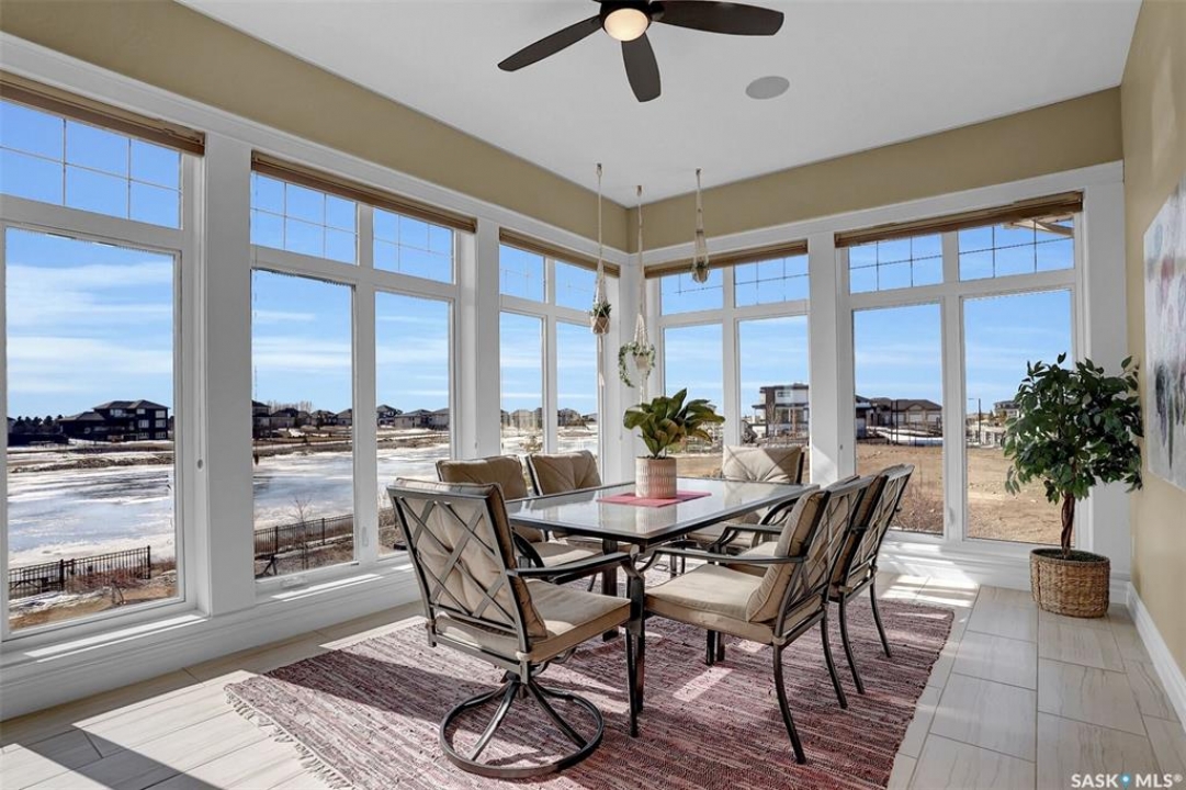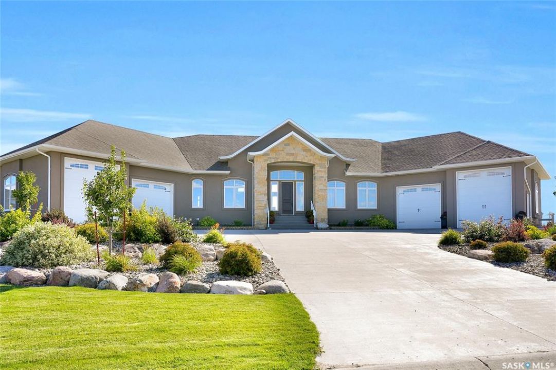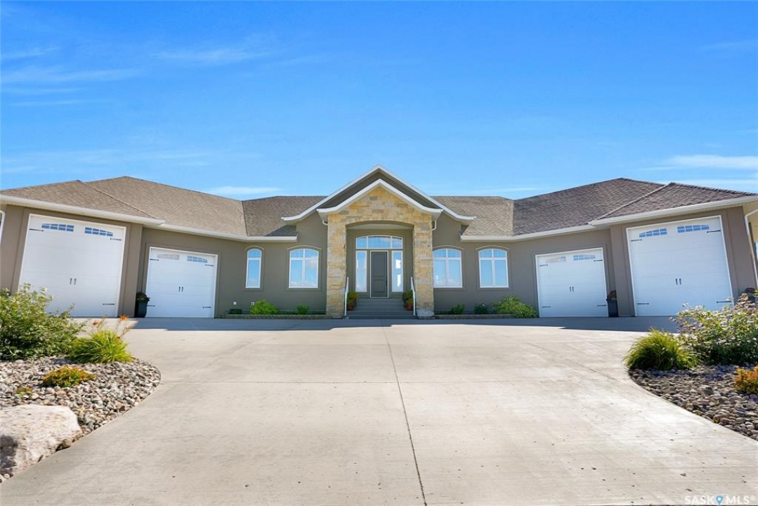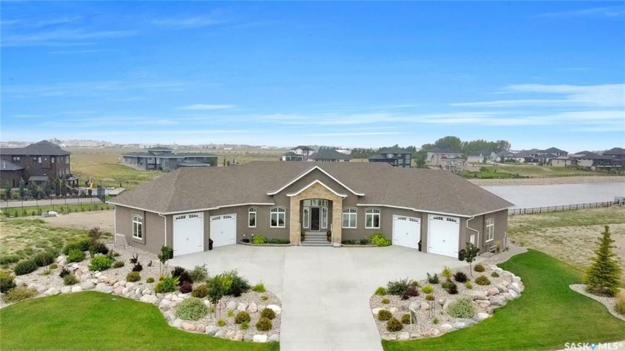 This extraordinary custom built walkout bungalow in Spruce Creek Estates has 6,096 sq' of living space, including a 2,926 sq' walkout basement & 244 sq' 3-season sunroom. The grand foyer features herringbone pattern tile and leads to the great room with 19' vaulted ceiling, Tyndall stone gas fireplace and huge southwest-facing windows that showcase stunning views of the professionally landscaped yard and community lake. Hickory hardwoods lead into the dream kitchen with a coffered ceiling, loads of cabinetry, quartz countertops, and a sit-around island with prep sink. Home chefs will adore the Wolf dual fuel 6 burner range and steam oven, Sub-Zero fridge and freezer drawers, 2 Bosch dishwashers, pot filler, & huge walk-in pantry. The sunroom is perfect for relaxing and is connected to the covered deck. The master suite is a private getaway with a separate covered deck, lake view and a spa-like ensuite. The walk-in closet features an island and is conveniently located next to the laundry room. Completing the main level are 2 more bedrooms, a 4-piece bath, a � bath (all baths with in-floor heat), a large mudroom with custom lockers and a music room. The walkout level is bright with continuation of the 10' ceilings from upstairs, large windows, in-floor heat, and a gas fireplace. Watch a game while enjoying the walk-up wet bar and beautiful wine room. You'll enjoy doing work in the office with built-in cabinetry and more lake views. When your gym workout is done you can exit directly to the covered patio with space for a future hot tub. Two large bedrooms, a 4-piece bath, play room, and more complete this amazing walkout level. Garage enthusiasts will love the two 28x32' garages with large overhead doors perfect for boat/RV storage, in-floor heat, hot & cold water, and drain pits to the outside. Also featured throughout the home are Hunter Douglas blinds and Savant home automation. Your oasis awaits, and it's only 22 minutes from downtown Regina.