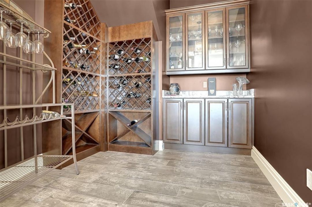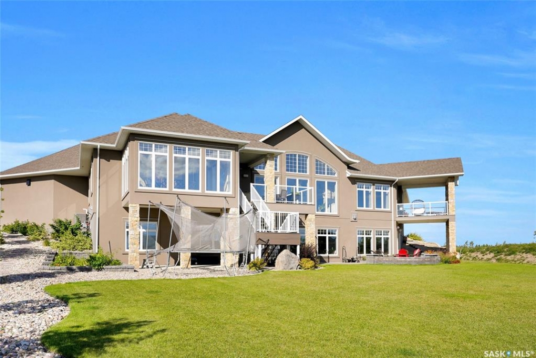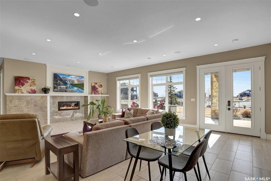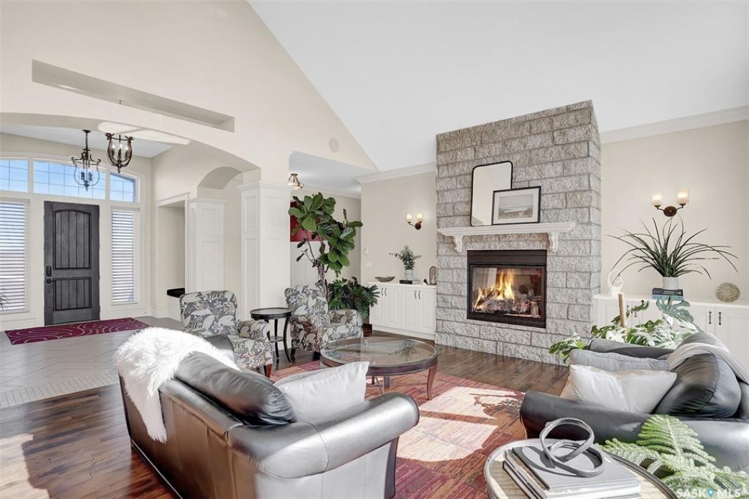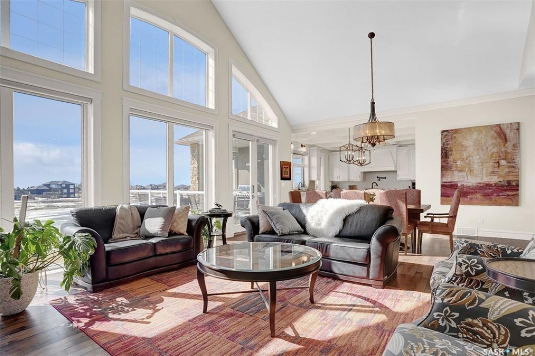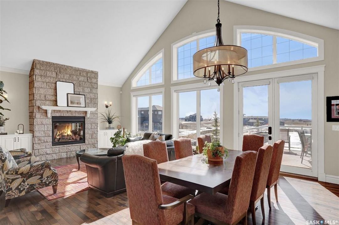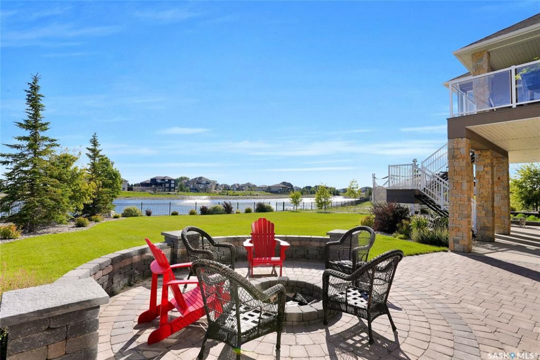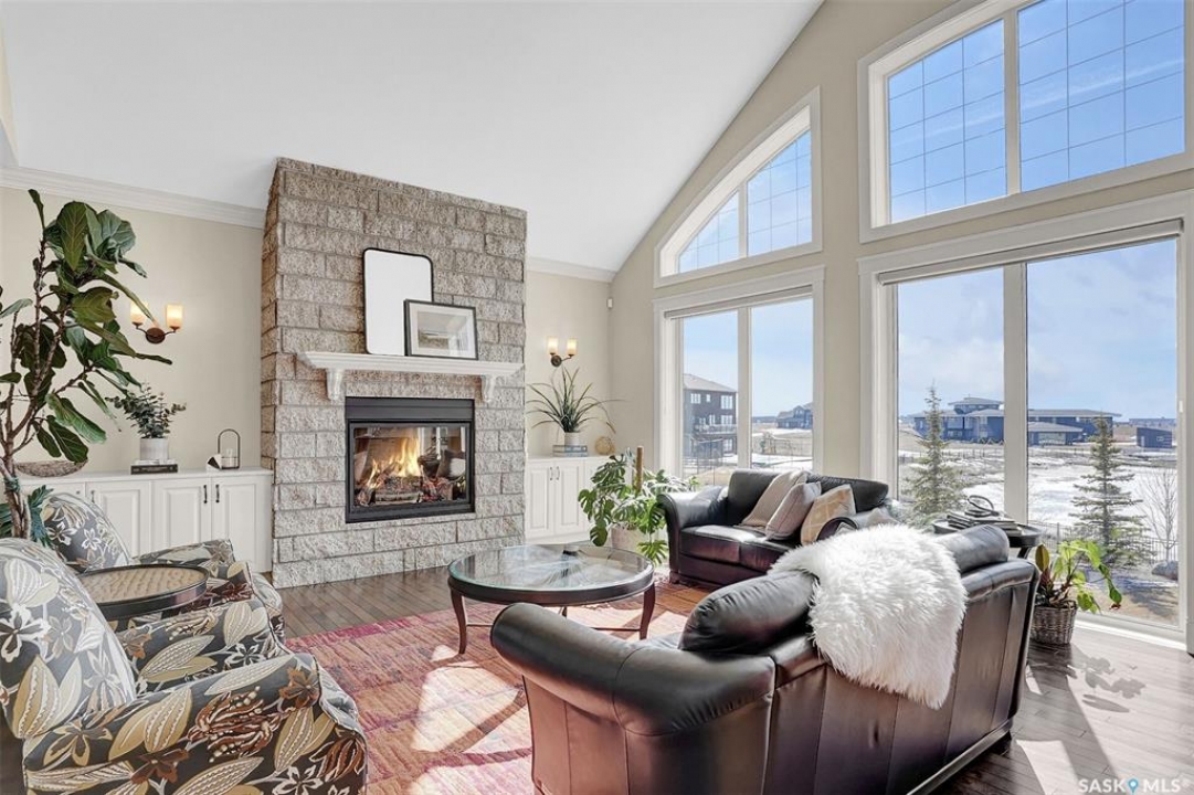 This extraordinary custom built walkout bungalow in Spruce Creek Estates has 6,096 sq' of living space, including a 2,926 sq' walkout basement & 244 sq' 3-season sunroom. The grand foyer features herringbone pattern tile and leads to the great room with 19' vaulted ceiling, Tyndall stone gas fireplace and huge southwest-facing windows that showcase stunning views of the professionally landscaped yard and community lake. Hickory hardwoods lead into the dream kitchen with a coffered ceiling, loads of cabinetry, quartz countertops, and a sit-around island with prep sink. Home chefs will adore the Wolf dual fuel 6 burner range and steam oven, Sub-Zero fridge and freezer drawers, 2 Bosch dishwashers, pot filler, & huge walk-in pantry. The sunroom is perfect for relaxing and is connected to the covered deck. The master suite is a private getaway with a separate covered deck, lake view and a spa-like ensuite. The walk-in closet features an island and is conveniently located next to the laundry room. Completing the main level are 2 more bedrooms, a 4-piece bath, a � bath (all baths with in-floor heat), a large mudroom with custom lockers and a music room. The walkout level is bright with continuation of the 10' ceilings from upstairs, large windows, in-floor heat, and a gas fireplace. Watch a game while enjoying the walk-up wet bar and beautiful wine room. You'll enjoy doing work in the office with built-in cabinetry and more lake views. When your gym workout is done you can exit directly to the covered patio with space for a future hot tub. Two large bedrooms, a 4-piece bath, play room, and more complete this amazing walkout level. Garage enthusiasts will love the two 28x32' garages with large overhead doors perfect for boat/RV storage, in-floor heat, hot & cold water, and drain pits to the outside. Also featured throughout the home are Hunter Douglas blinds and Savant home automation. Your oasis awaits, and it's only 22 minutes from downtown Regina.