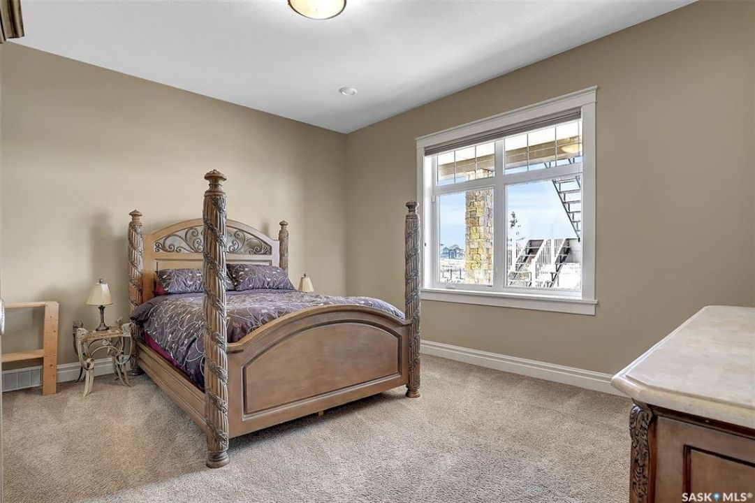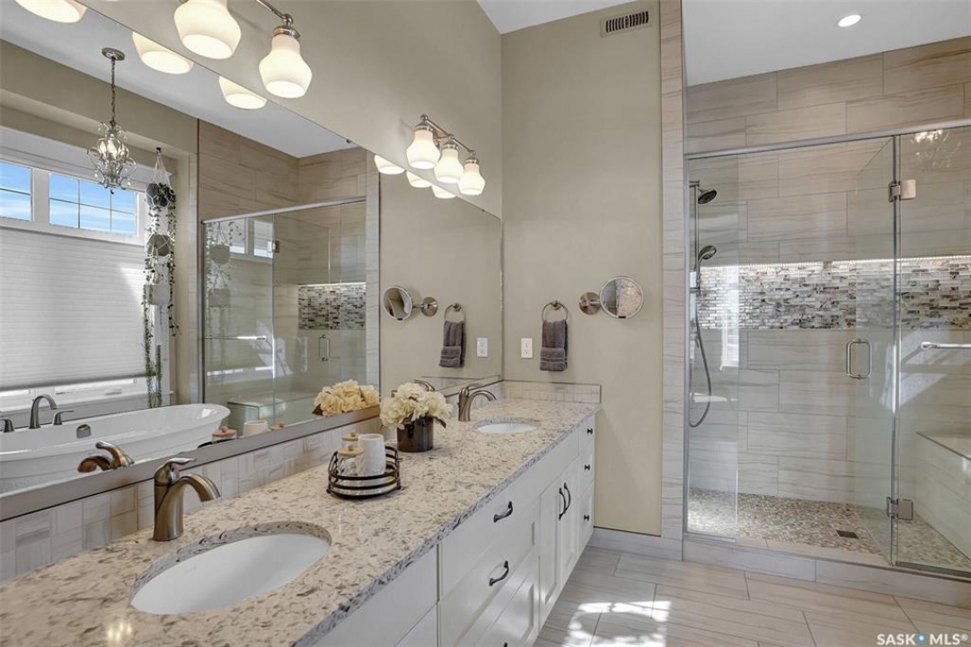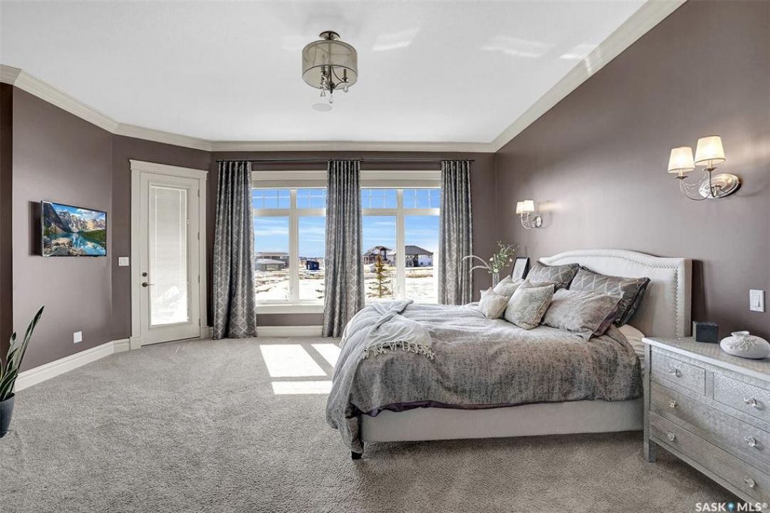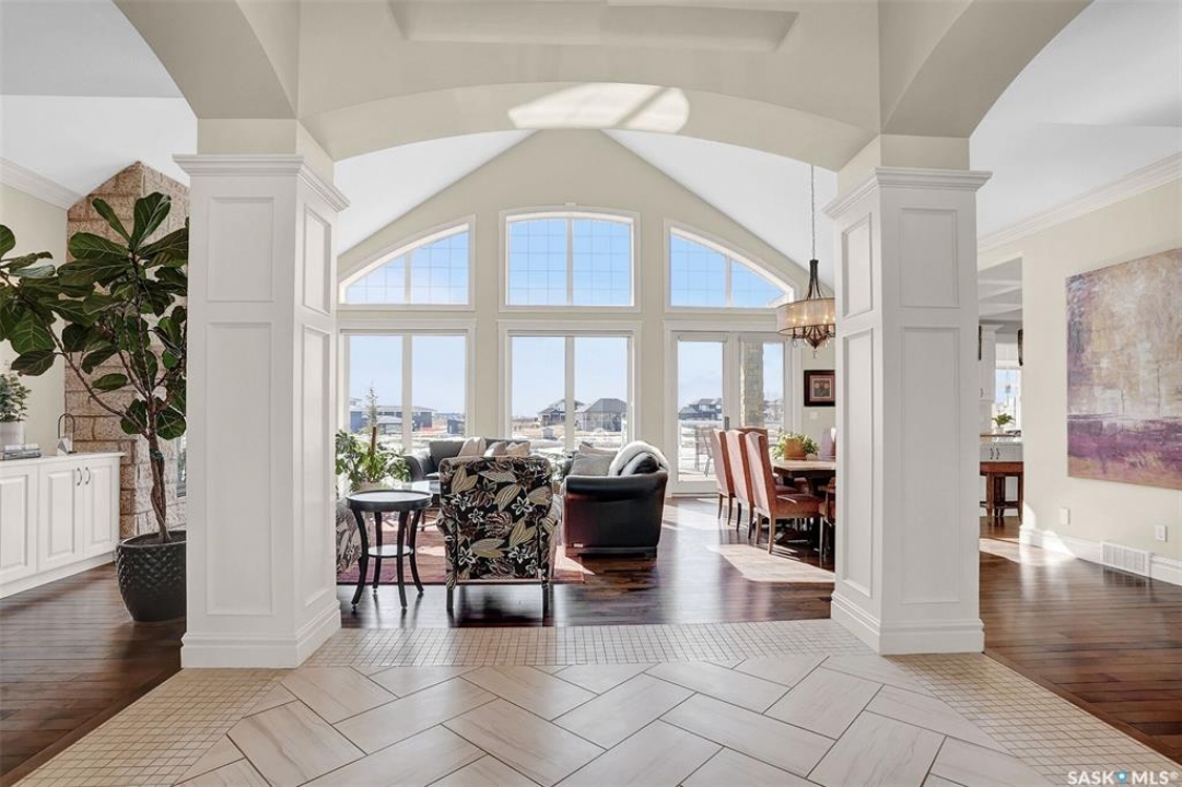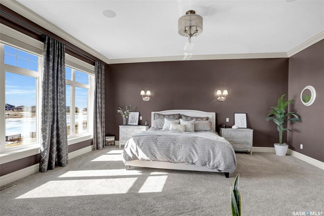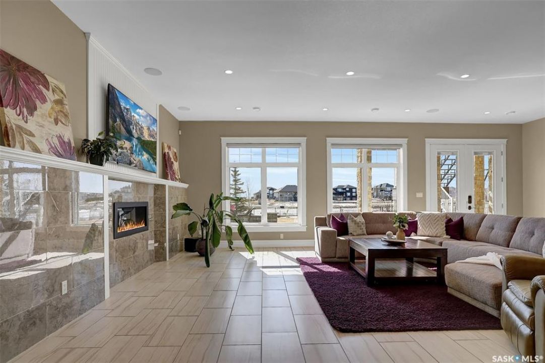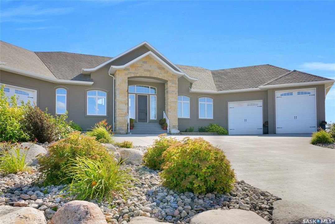 This extraordinary custom built walkout bungalow in Spruce Creek Estates has 6,096 sq' of living space, including a 2,926 sq' walkout basement & 244 sq' 3-season sunroom. The grand foyer features herringbone pattern tile and leads to the great room with 19' vaulted ceiling, Tyndall stone gas fireplace and huge southwest-facing windows that showcase stunning views of the professionally landscaped yard and community lake. Hickory hardwoods lead into the dream kitchen with a coffered ceiling, loads of cabinetry, quartz countertops, and a sit-around island with prep sink. Home chefs will adore the Wolf dual fuel 6 burner range and steam oven, Sub-Zero fridge and freezer drawers, 2 Bosch dishwashers, pot filler, & huge walk-in pantry. The sunroom is perfect for relaxing and is connected to the covered deck. The master suite is a private getaway with a separate covered deck, lake view and a spa-like ensuite. The walk-in closet features an island and is conveniently located next to the laundry room. Completing the main level are 2 more bedrooms, a 4-piece bath, a � bath (all baths with in-floor heat), a large mudroom with custom lockers and a music room. The walkout level is bright with continuation of the 10' ceilings from upstairs, large windows, in-floor heat, and a gas fireplace. Watch a game while enjoying the walk-up wet bar and beautiful wine room. You'll enjoy doing work in the office with built-in cabinetry and more lake views. When your gym workout is done you can exit directly to the covered patio with space for a future hot tub. Two large bedrooms, a 4-piece bath, play room, and more complete this amazing walkout level. Garage enthusiasts will love the two 28x32' garages with large overhead doors perfect for boat/RV storage, in-floor heat, hot & cold water, and drain pits to the outside. Also featured throughout the home are Hunter Douglas blinds and Savant home automation. Your oasis awaits, and it's only 22 minutes from downtown Regina.