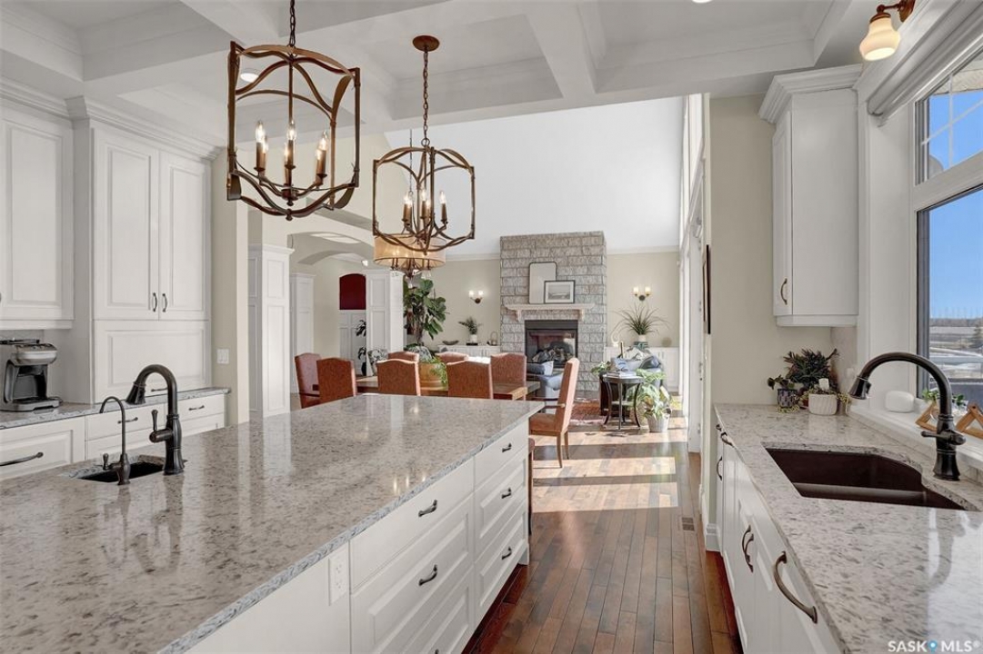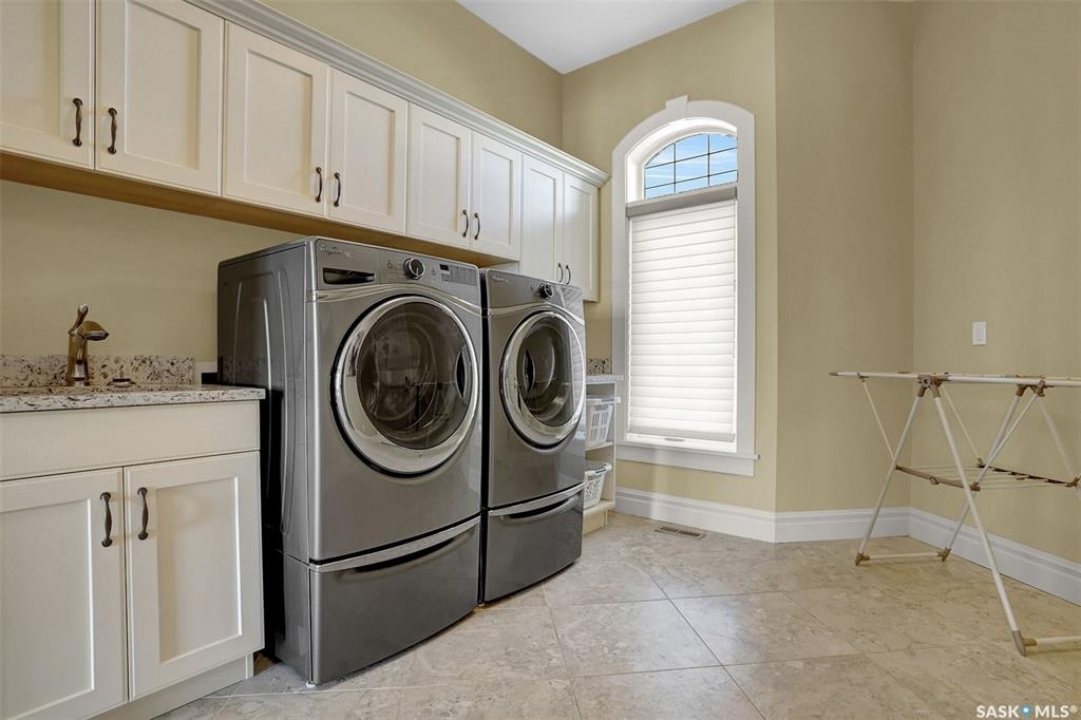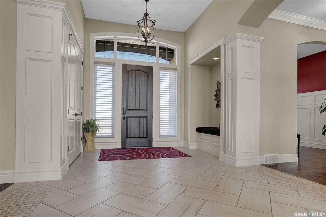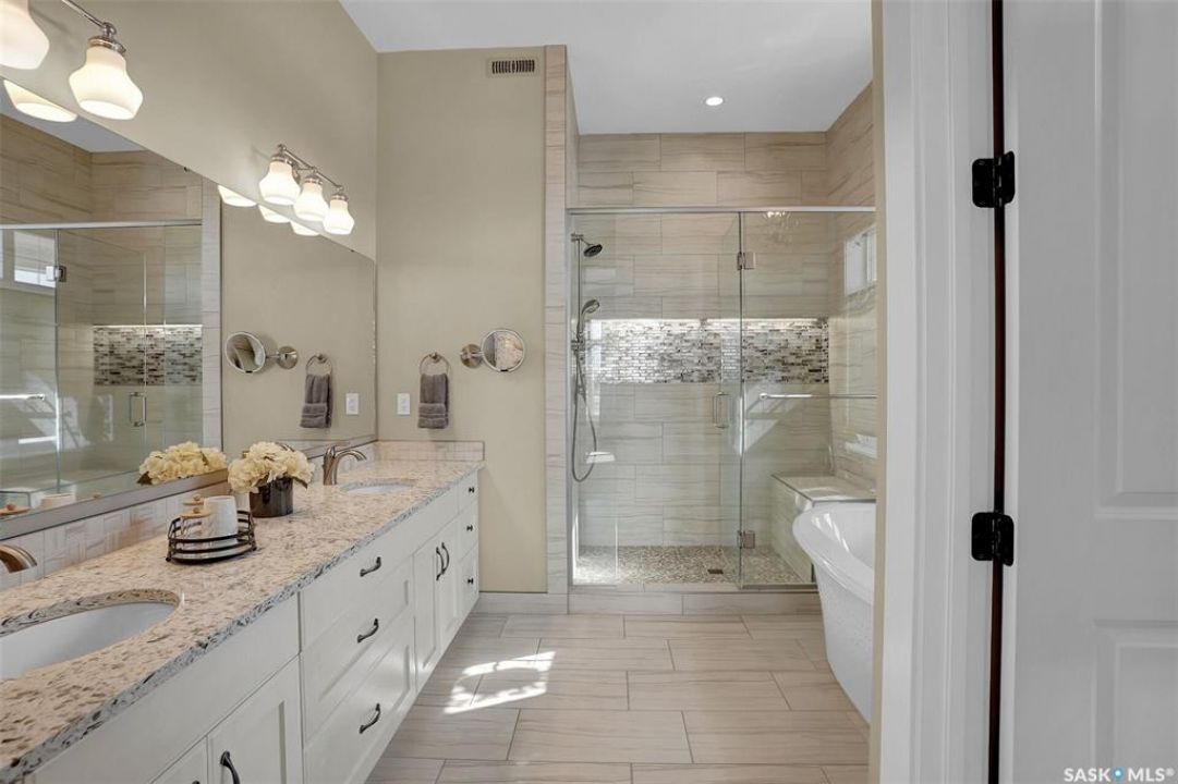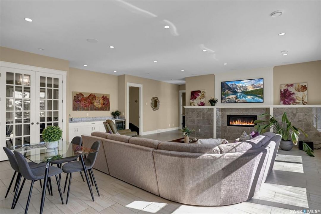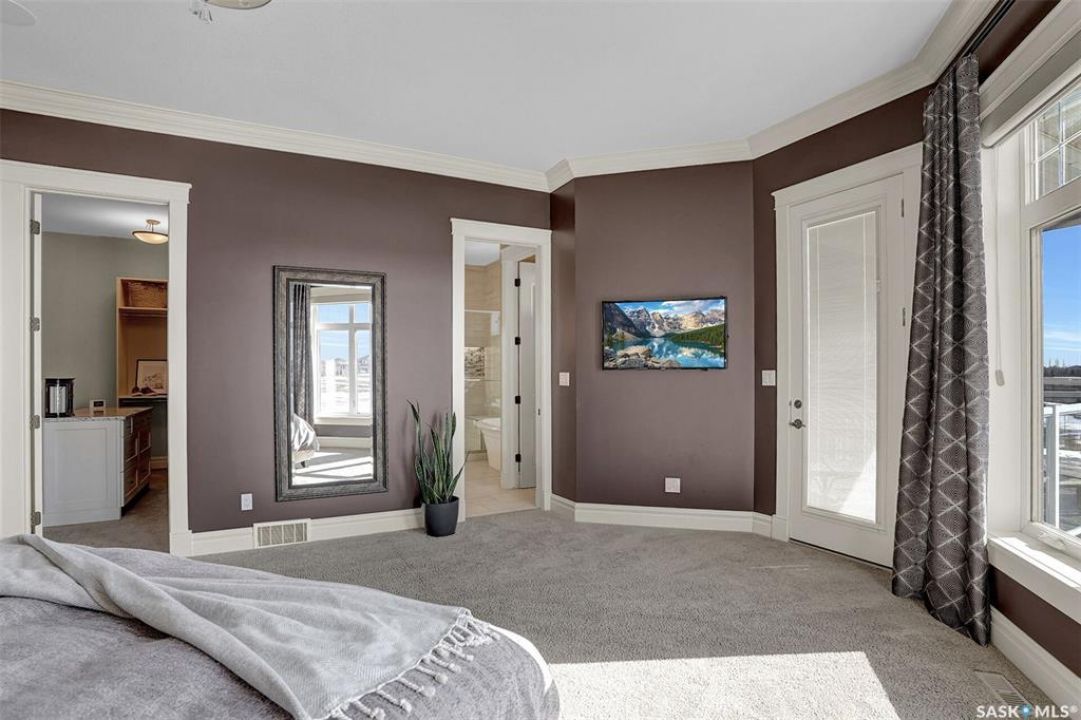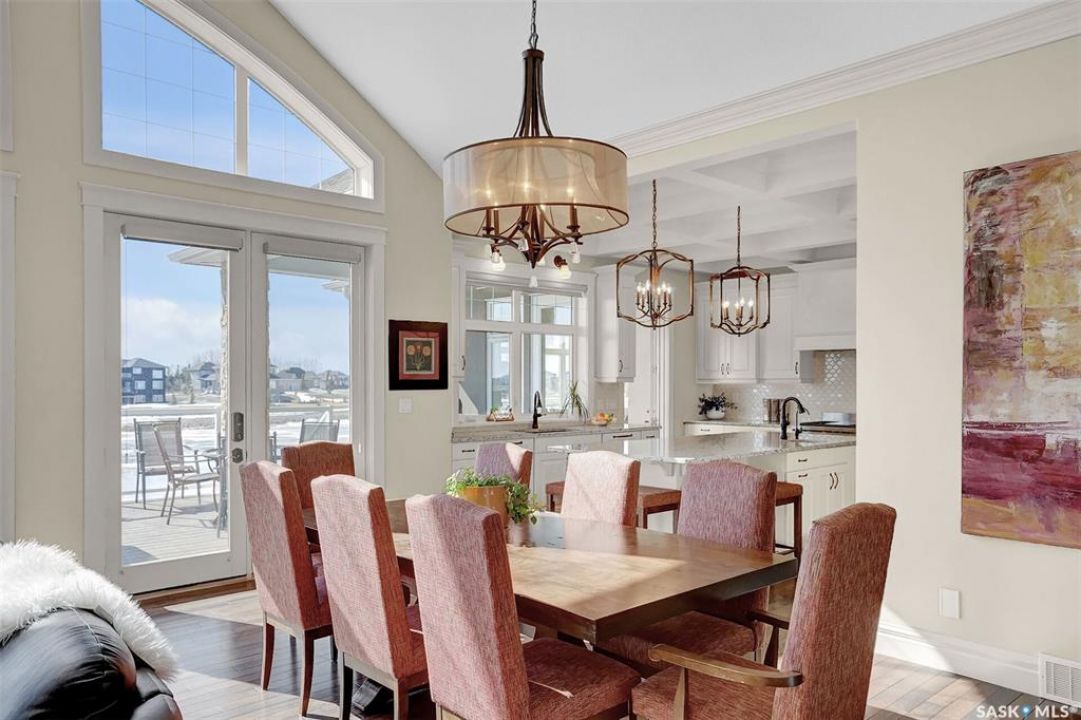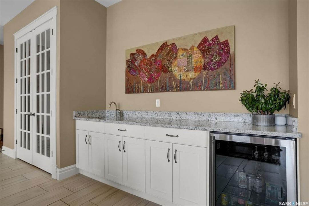 This extraordinary custom built walkout bungalow in Spruce Creek Estates has 6,096 sq' of living space, including a 2,926 sq' walkout basement & 244 sq' 3-season sunroom. The grand foyer features herringbone pattern tile and leads to the great room with 19' vaulted ceiling, Tyndall stone gas fireplace and huge southwest-facing windows that showcase stunning views of the professionally landscaped yard and community lake. Hickory hardwoods lead into the dream kitchen with a coffered ceiling, loads of cabinetry, quartz countertops, and a sit-around island with prep sink. Home chefs will adore the Wolf dual fuel 6 burner range and steam oven, Sub-Zero fridge and freezer drawers, 2 Bosch dishwashers, pot filler, & huge walk-in pantry. The sunroom is perfect for relaxing and is connected to the covered deck. The master suite is a private getaway with a separate covered deck, lake view and a spa-like ensuite. The walk-in closet features an island and is conveniently located next to the laundry room. Completing the main level are 2 more bedrooms, a 4-piece bath, a � bath (all baths with in-floor heat), a large mudroom with custom lockers and a music room. The walkout level is bright with continuation of the 10' ceilings from upstairs, large windows, in-floor heat, and a gas fireplace. Watch a game while enjoying the walk-up wet bar and beautiful wine room. You'll enjoy doing work in the office with built-in cabinetry and more lake views. When your gym workout is done you can exit directly to the covered patio with space for a future hot tub. Two large bedrooms, a 4-piece bath, play room, and more complete this amazing walkout level. Garage enthusiasts will love the two 28x32' garages with large overhead doors perfect for boat/RV storage, in-floor heat, hot & cold water, and drain pits to the outside. Also featured throughout the home are Hunter Douglas blinds and Savant home automation. Your oasis awaits, and it's only 22 minutes from downtown Regina.