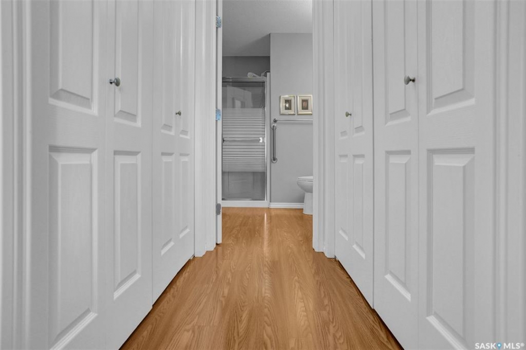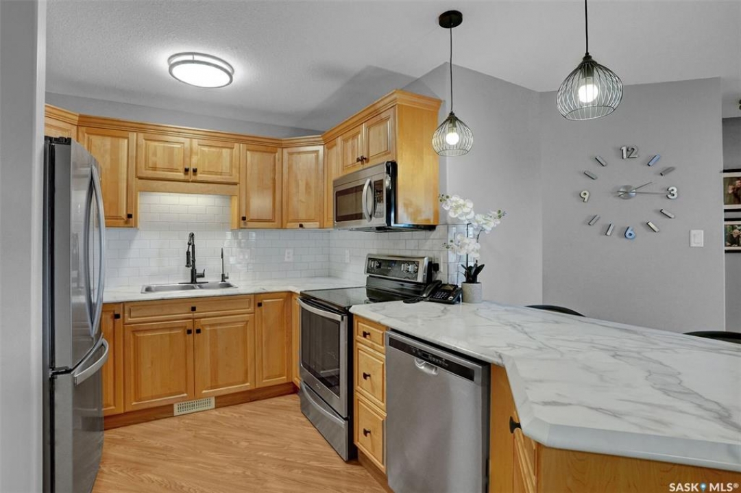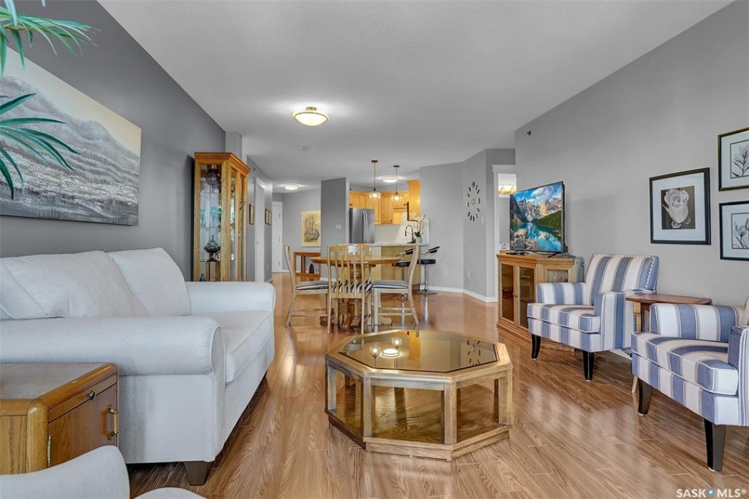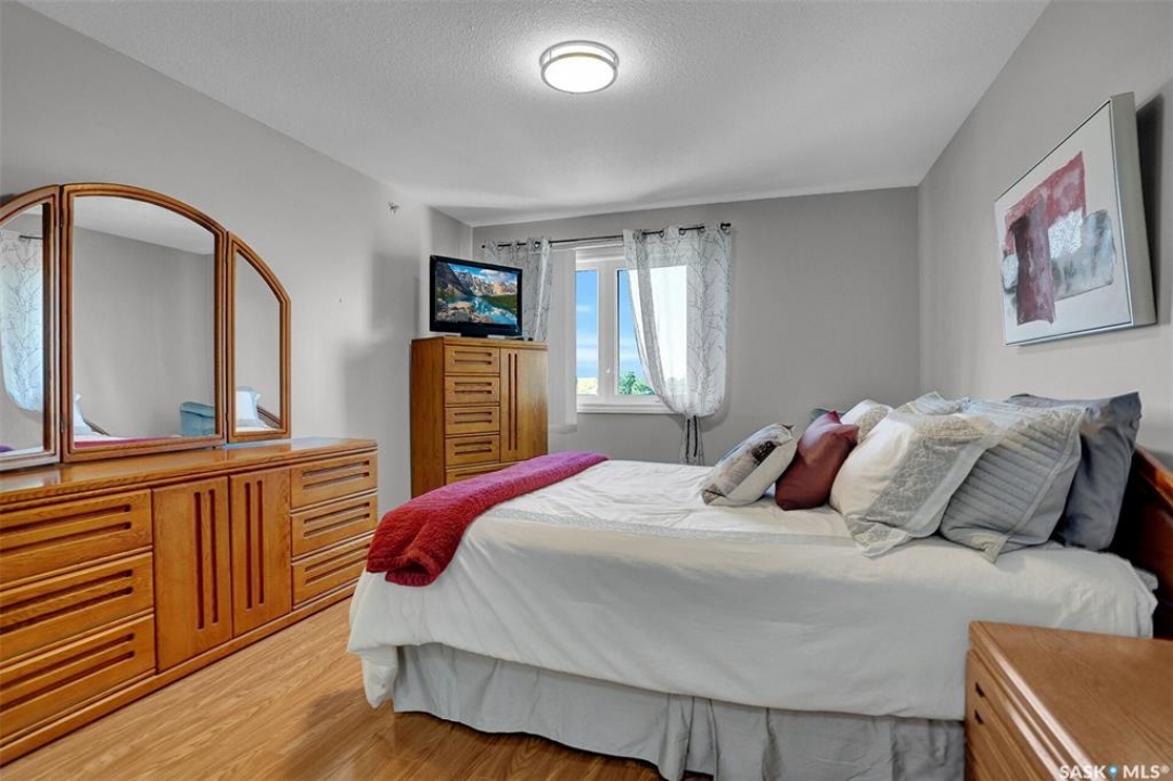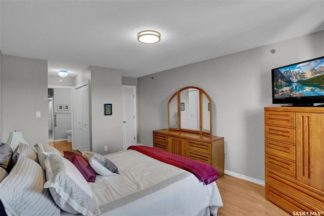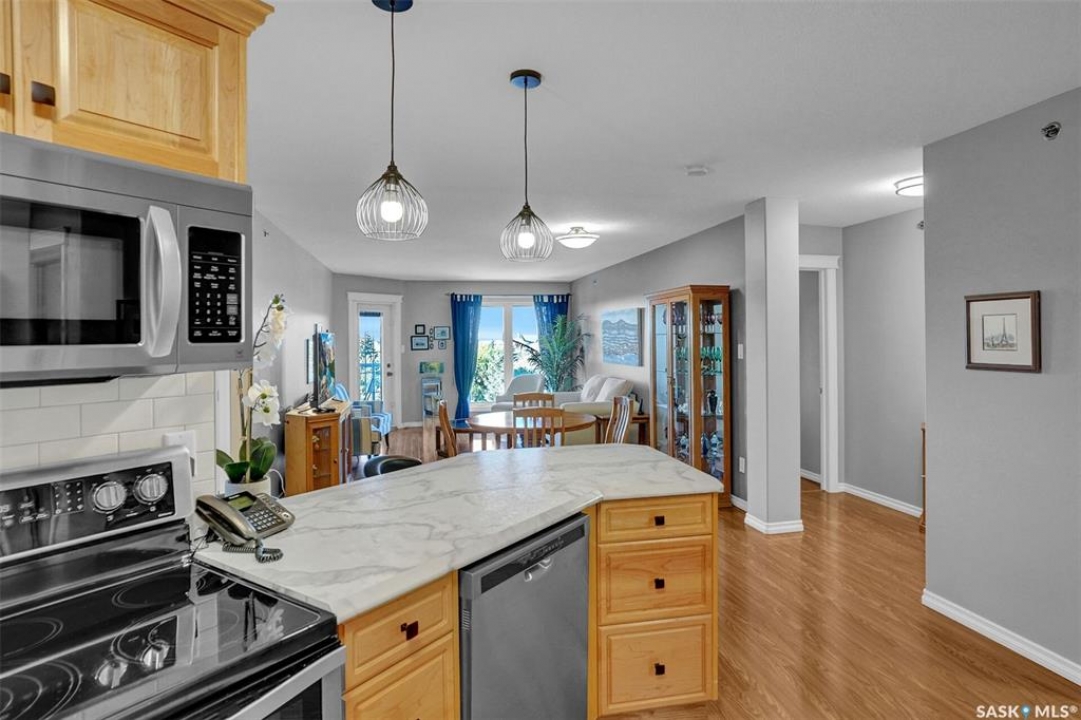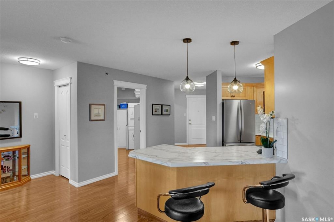 This condo has what so many people ask for! Top floor: facing west: with lots of natural light. Welcome to suite 409! Come inside to the foyer that has plenty of space to display furniture, artwork and even a bench. Lovely colored easy care laminate throughout. As you look forward from the foyer hallway there is a lovely view from the livingroom window. The main living area offers plenty of space for you to arrange the furniture based on your personal lifestyle. Whether you choose to have a dining area or a more casual style with the kitchen eating bar. Or both! The kitchen work space is well designed with lots of cupboards and counter space. Attractive backsplash and cabinet knobs. Fridge, stove, microwave hood fan and dishwasher replaced within the last 4 years. The spacious master bedroom provides two closets and a 3 piece ensuite. The shower has a seat, sliding glass door and grab bars. On the other side of the living room is the very large second bedroom providing plenty of space for chairs and/or a desk. Conveniently located main bathroom. A garden door off the living room opens to the west facing covered deck. Now to the elevator that is a short distance to the elevator. The parking spot in the heated parkade has 2 storage lockers in front. The building offers an amenities room (2nd floor), guest suite and craft room (3rd floor), exercise room, storage room (4th floor), hobby shop with tools, car wash bay in parkade with hose,brushes and shop vac. Lots of outside visitor parking. Condo fees of $490.04 per month include water, sewer, common area maintenance and insurance, exterior building maintenance, garbage, centralized water heater and water softner, lawn care, snow removal and reserve fund. Pets are not allowed. The building location is perfect for access to many amenities, shopping and dining. You will want to check this out!