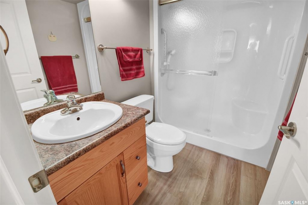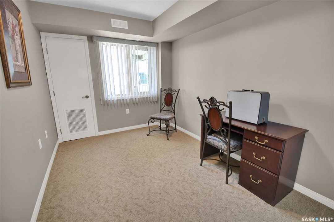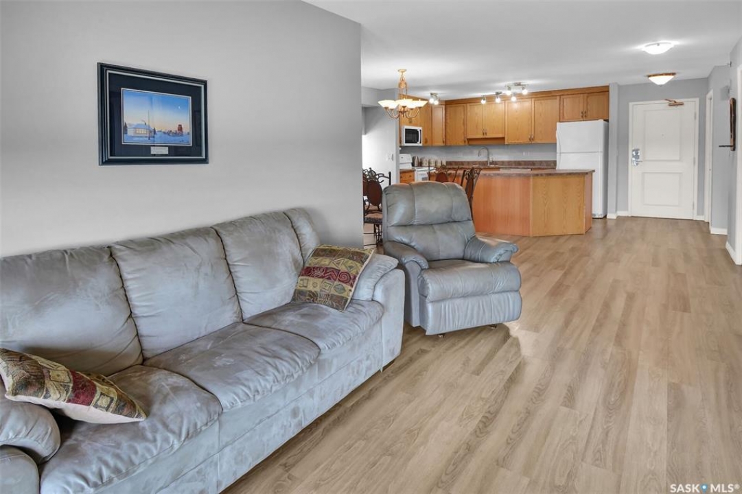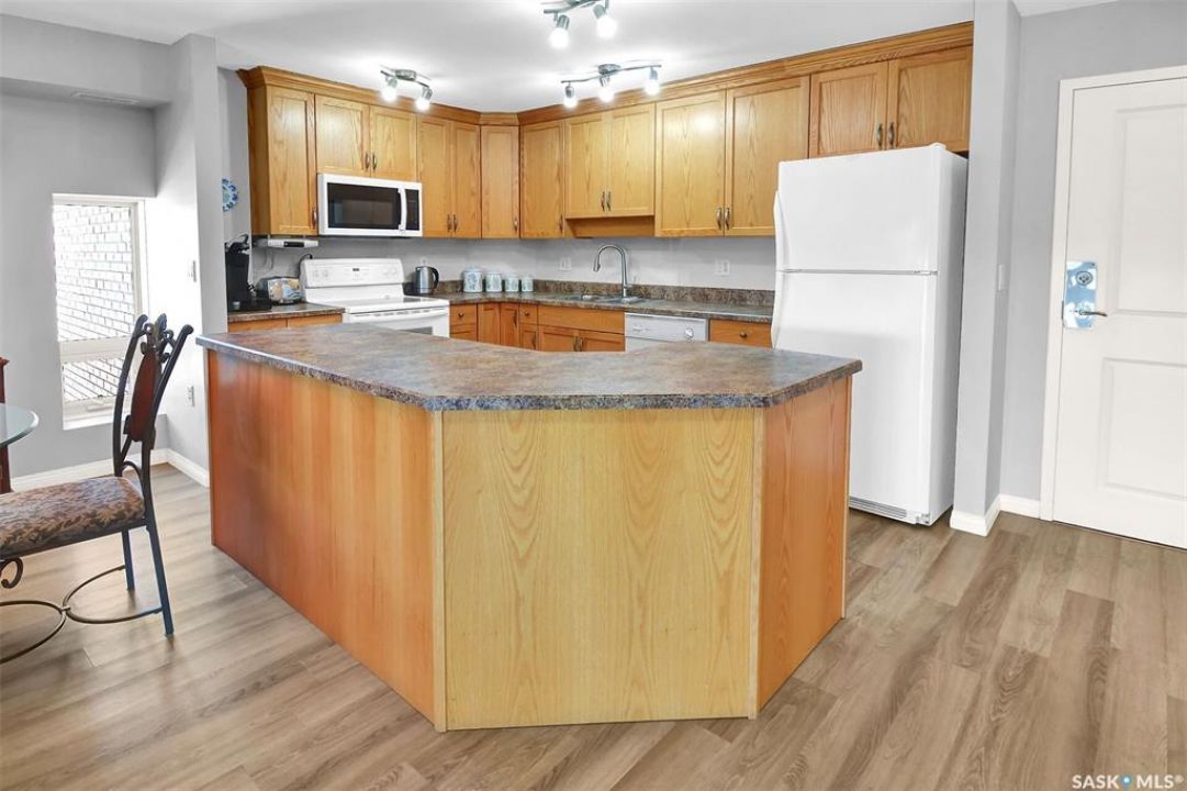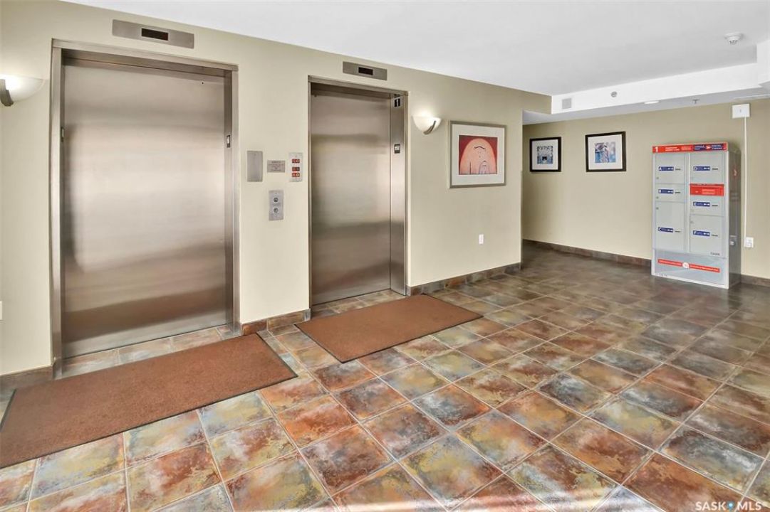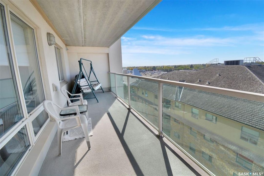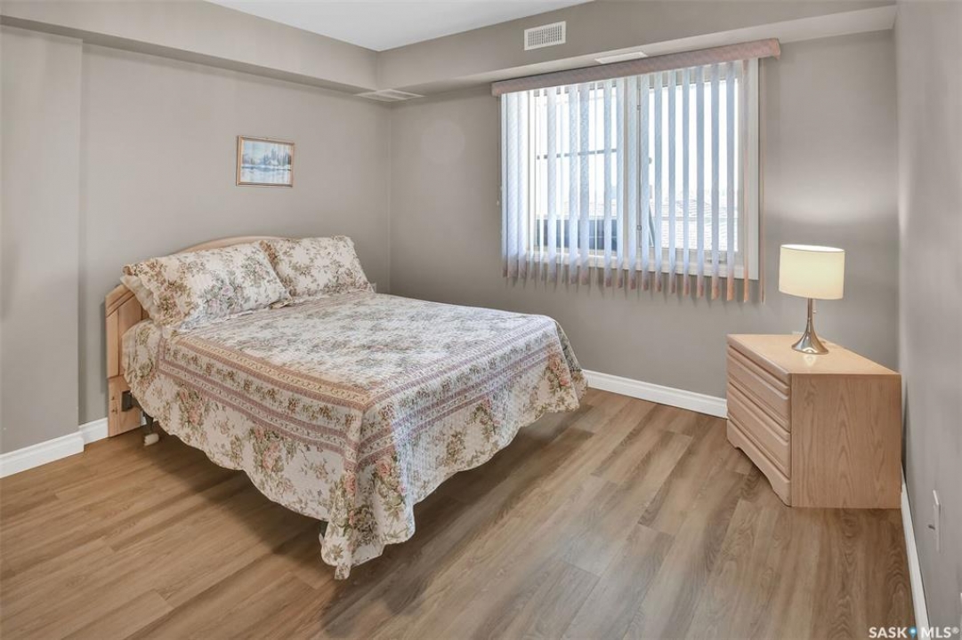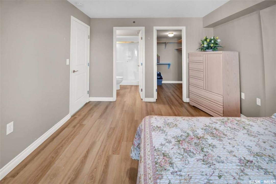 This bright, west facing, move-in ready corner unit condo boasts and exceptional view of the city, which can be enjoyed from the large balcony. Fremai Tower is a concrete building across from Market Mall. 1098 sq ft open concept with large kitchen with oak cabinets, large island, appliances, lots of pot drawers and cabinets to the ceiling. Overlooking the dining area and living room opens to the balcony. The primary bedroom offers room for a king bed and has a large walk-in closet and 3-piece ensuite. Vinyl plank flooring is throughout except for the one bedroom. Spacious laundry area has lots of storage. This condo includes a storage unit on the 12th floor and one underground parking stall, which is close to the elevator. Common areas include an amenities room and an exercise room. Ideal for socializing, this prime location within the complex is truly exceptional- offering a private, quiet, and secure west direction.
