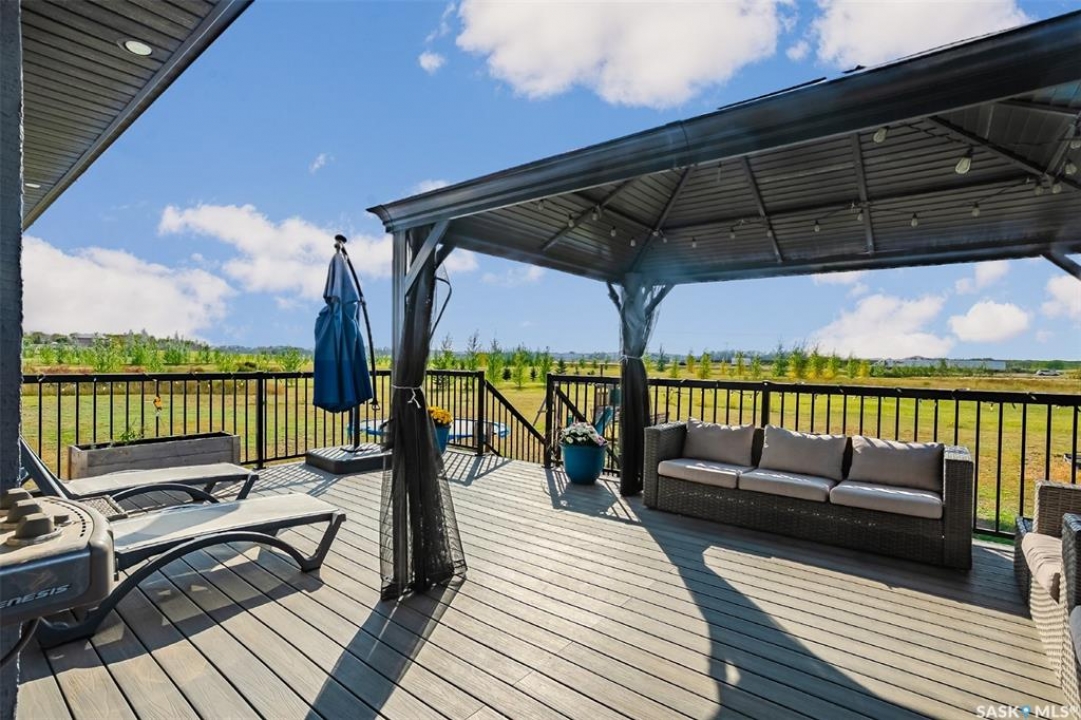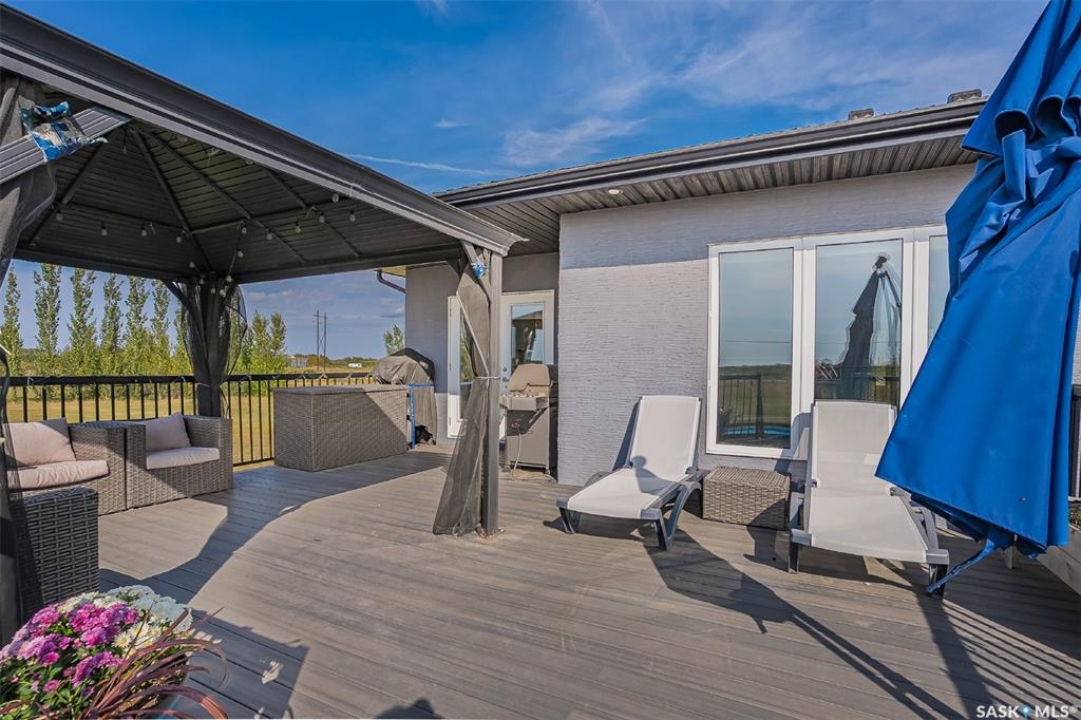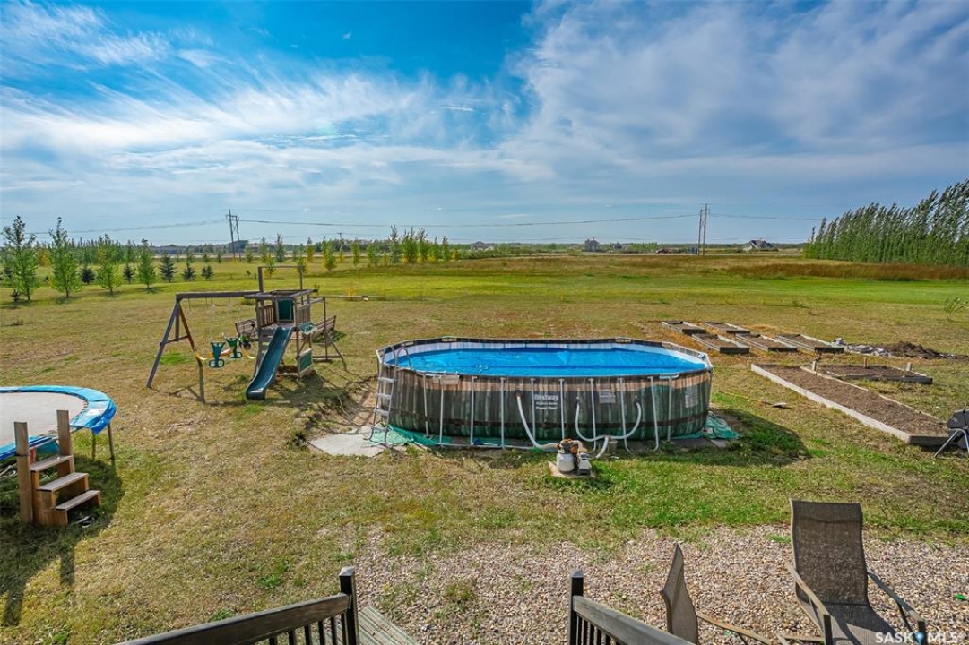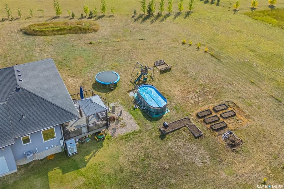 Welcome to this South Country Estates acreage, just 10 minutes south of Saskatoon off HWY 11 in the RM of Dundurn. This 1,348sqft custom bungalow blends modern comfort with country charm. The main floor boasts an open layout with a bright living room, cozy fireplace, and stylish kitchen featuring granite counters, island, and walk-in pantry. The dining area leads to a west-facing deck with gazebo and natural gas hookup—ideal for entertaining. The primary suite includes a walk-in closet and 4-pc ensuite, with two more bedrooms completing the main floor. The basement offers excellent potential, with a family room, games area, 4-pc bath, laundry, den, and 4th bedroom awaiting your finishing touches to the ceiling. A heated 24x26 garage with 8-ft door provides ample storage. Outdoors, enjoy the above-ground pool, play structure, garden beds, and wide-open space. Fibre internet, natural gas, and public water line add convenience, while Clavet School bus pickup is right at the driveway. Perfect for a growing family seeking a peaceful acreage lifestyle with an easy commute to the city.