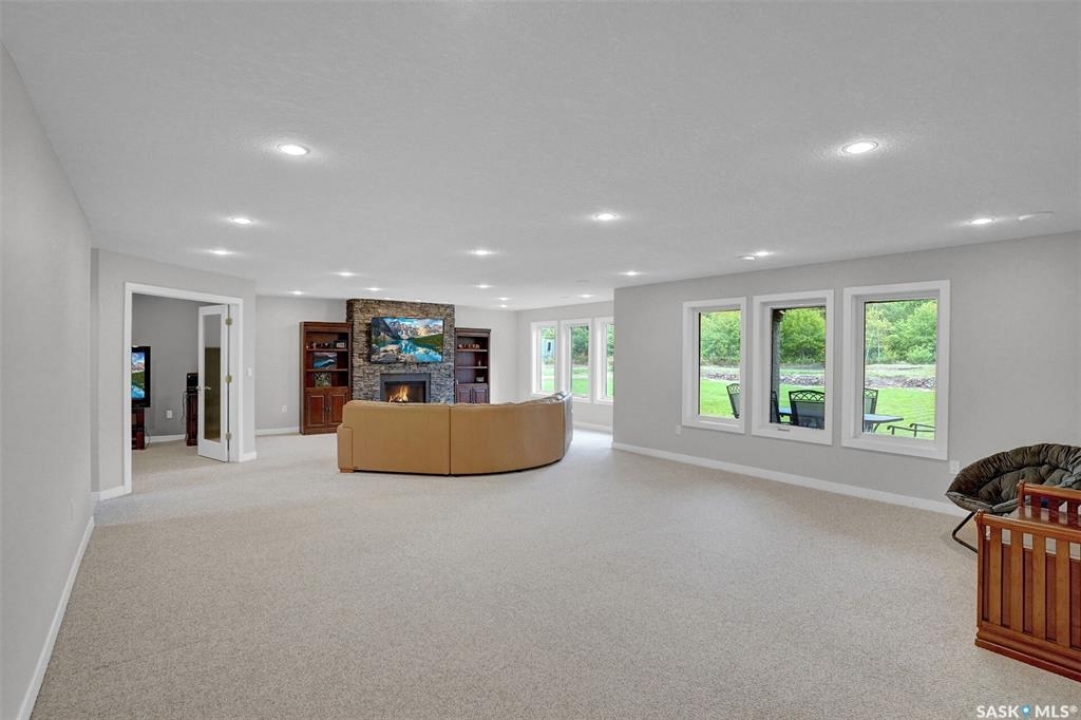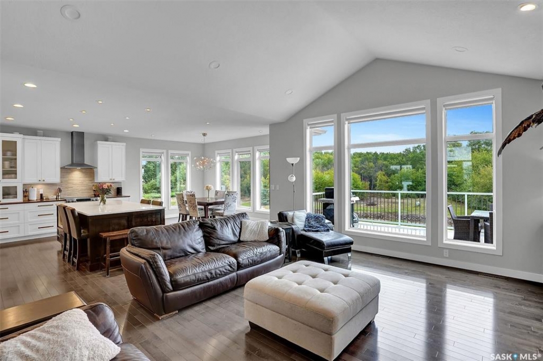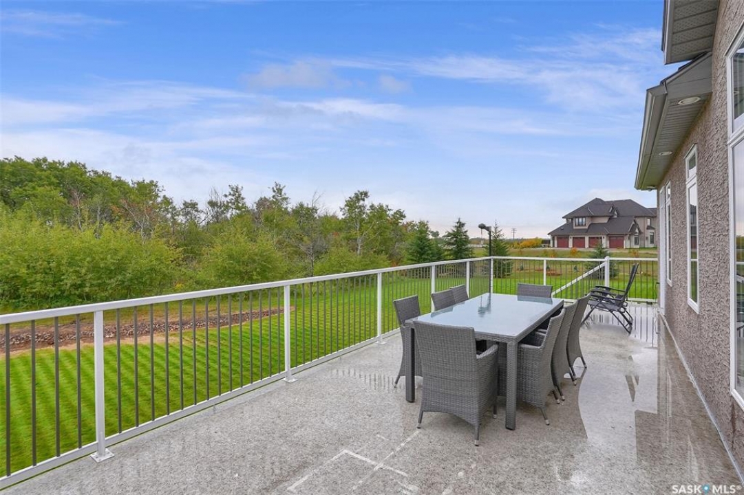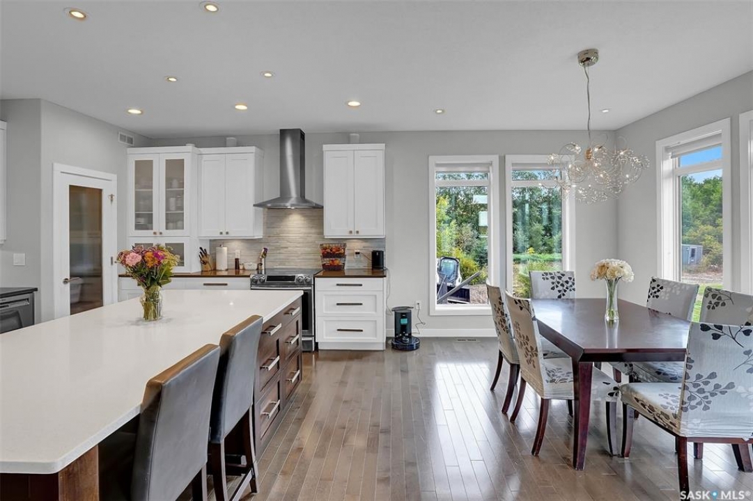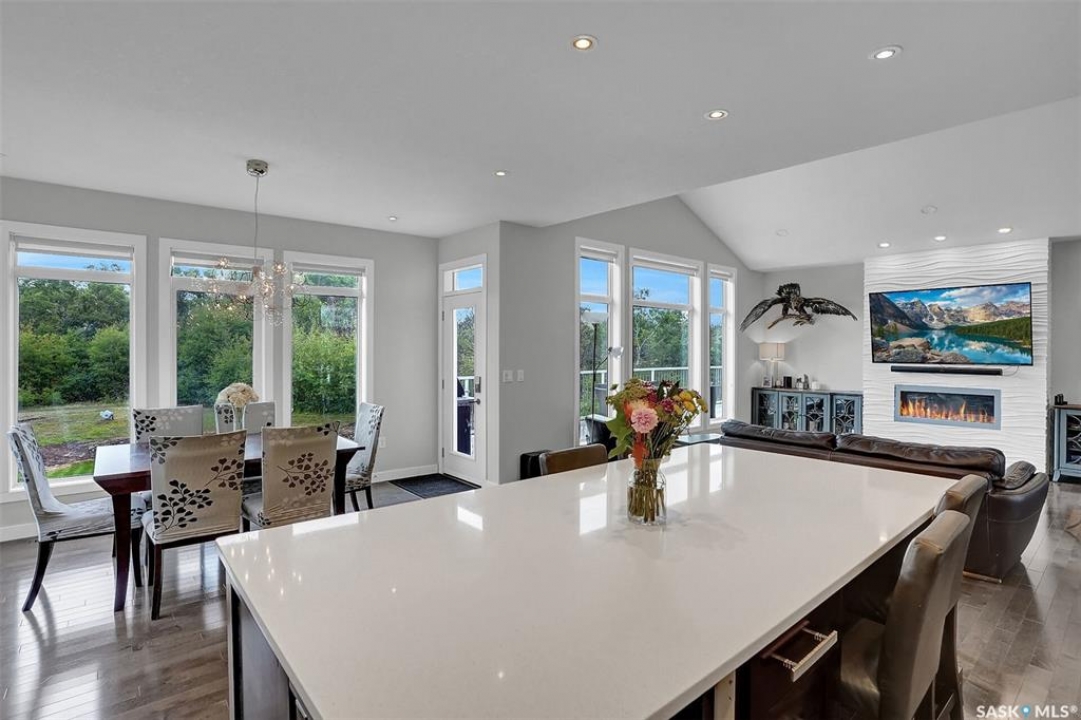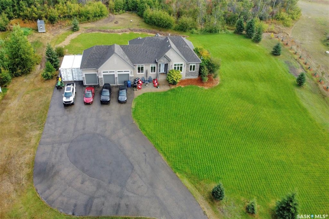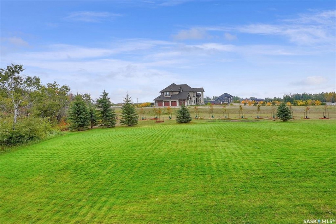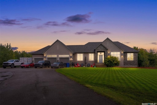 Don't miss this stunning walkout bungalow nestled on a prime 4.9-acre lot, highlighted by over 2 acres of mature trees complete with private walking and biking paths, a rare retreat just minutes from the city and walking distance to White Butte trails. This 1840 sq ft bungalow offers over 3,600 sq ft of beautifully developed living space with 5 bedrooms, a den, and 3 bathrooms, designed for both family living and entertaining. The exterior showcases stucco and stone finishes with a triple attached heated garage, with gemstone lighting, in ground sprinklers attached to well. A fully paved driveway provides ample parking for guests, trailers, and toys. Step inside to a bright, open foyer with tile floors that lead into the expansive main level. The living room features vaulted ceilings, hardwood flooring, and a striking floor to ceiling fireplace, with large windows that flood the space with natural light and frame picturesque views of your private acreage. The kitchen is both stylish and functional, complete with quartz countertops, a large island, stainless steel appliances, and abundant cabinetry. A convenient walk-through pantry connects to the laundry/mudroom with direct access to the heated garage. The dining area, surrounded by windows, opens onto a wrap-around deck with a gas BBQ hookup, the perfect spot for summer entertaining. The main floor offers 3 bedrooms, including a spacious primary suite with a walk-in closet and a 3-pc ensuite. A garden door off the ensuite leads to the deck, offering a private outdoor escape. A full bathroom with a tiled soaker tub serves the additional bedrooms. The fully developed walkout basement extends your living space with a large recreation room featuring a second fireplace, French doors to a versatile den, 2 additional bedrooms, and a 3-pc bathroom. Walkout access opens onto a covered aggregate patio featuring gemstone lighting and the beautifully landscaped backyard, where the treed acreage and private trails await.