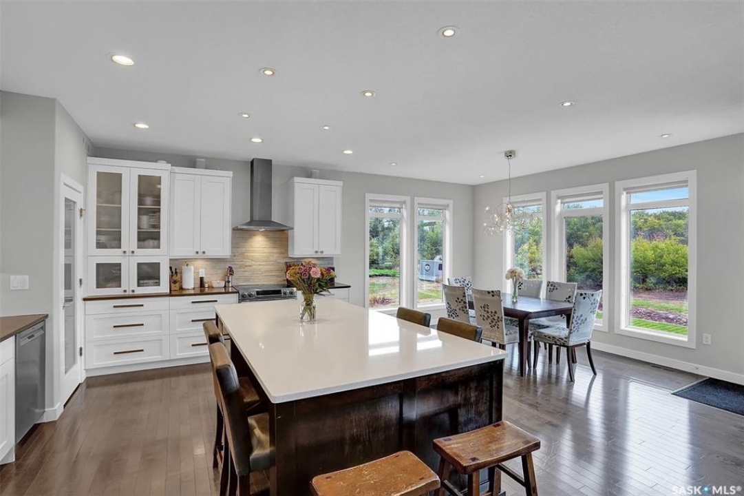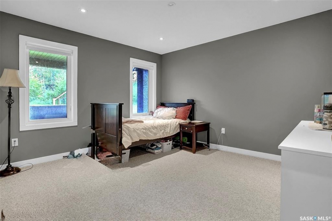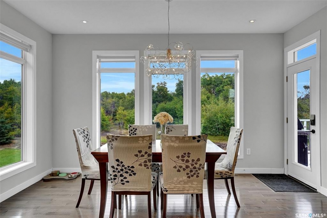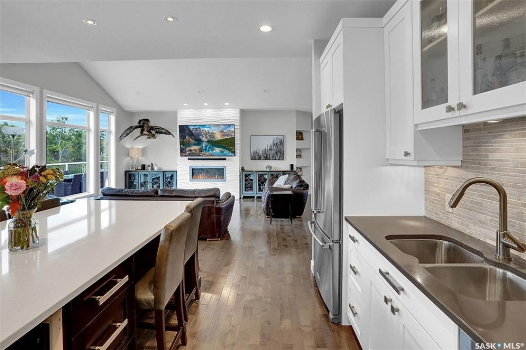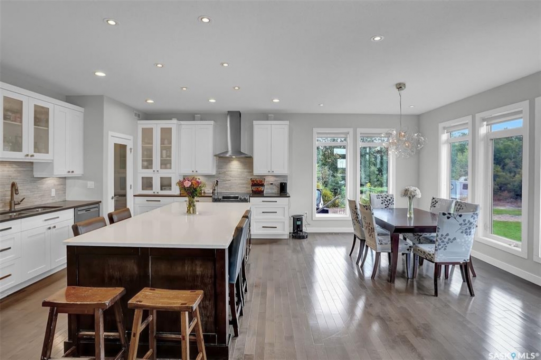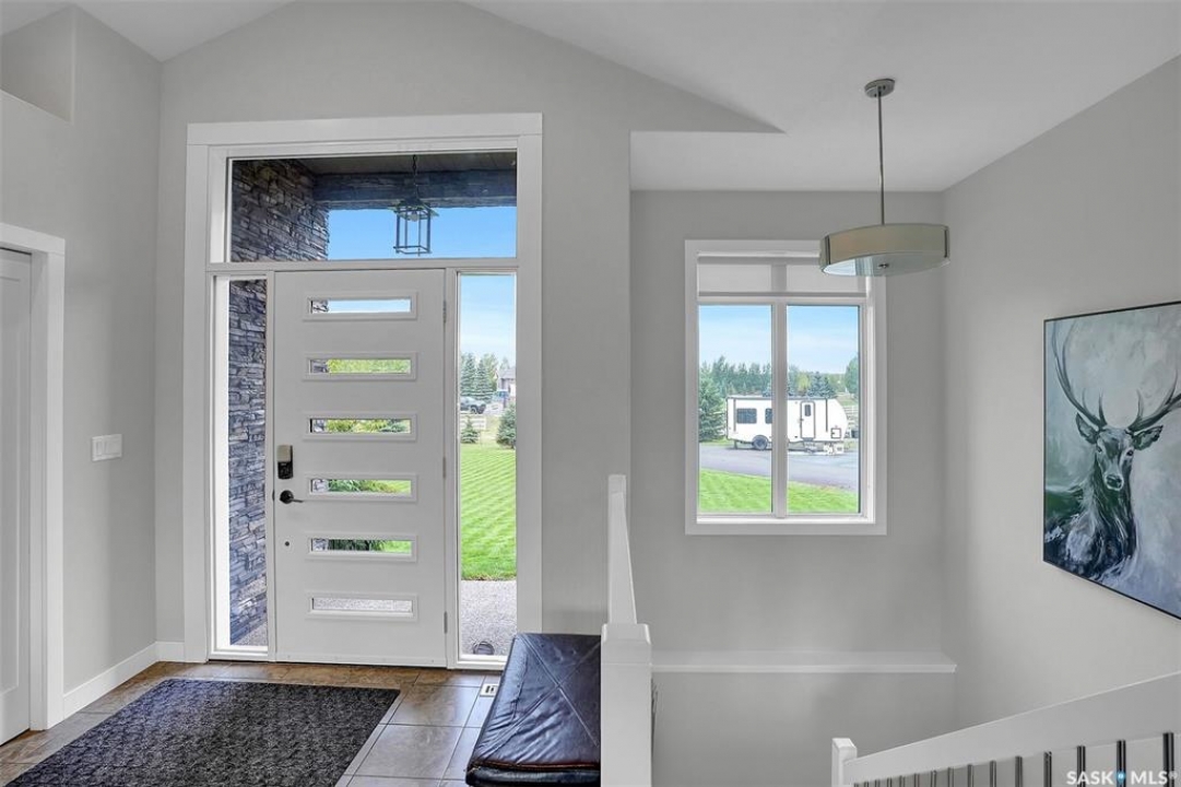 Don't miss this stunning walkout bungalow nestled on a prime 4.9-acre lot, highlighted by over 2 acres of mature trees complete with private walking and biking paths, a rare retreat just minutes from the city and walking distance to White Butte trails. This 1840 sq ft bungalow offers over 3,600 sq ft of beautifully developed living space with 5 bedrooms, a den, and 3 bathrooms, designed for both family living and entertaining. The exterior showcases stucco and stone finishes with a triple attached heated garage, with gemstone lighting, in ground sprinklers attached to well. A fully paved driveway provides ample parking for guests, trailers, and toys. Step inside to a bright, open foyer with tile floors that lead into the expansive main level. The living room features vaulted ceilings, hardwood flooring, and a striking floor to ceiling fireplace, with large windows that flood the space with natural light and frame picturesque views of your private acreage. The kitchen is both stylish and functional, complete with quartz countertops, a large island, stainless steel appliances, and abundant cabinetry. A convenient walk-through pantry connects to the laundry/mudroom with direct access to the heated garage. The dining area, surrounded by windows, opens onto a wrap-around deck with a gas BBQ hookup, the perfect spot for summer entertaining. The main floor offers 3 bedrooms, including a spacious primary suite with a walk-in closet and a 3-pc ensuite. A garden door off the ensuite leads to the deck, offering a private outdoor escape. A full bathroom with a tiled soaker tub serves the additional bedrooms. The fully developed walkout basement extends your living space with a large recreation room featuring a second fireplace, French doors to a versatile den, 2 additional bedrooms, and a 3-pc bathroom. Walkout access opens onto a covered aggregate patio featuring gemstone lighting and the beautifully landscaped backyard, where the treed acreage and private trails await.