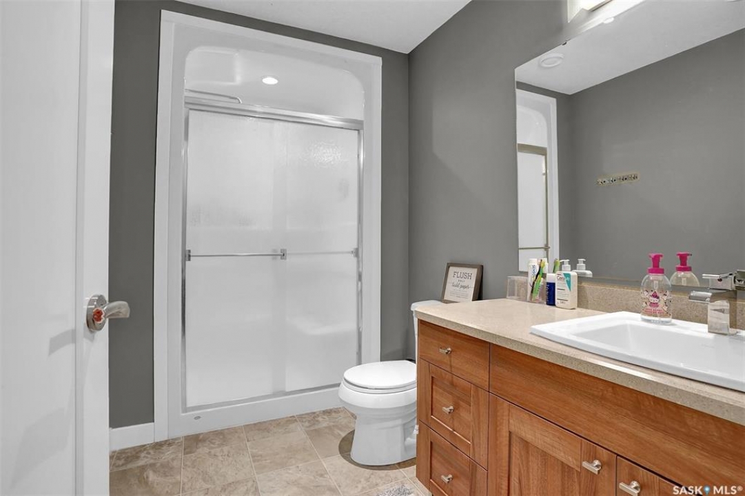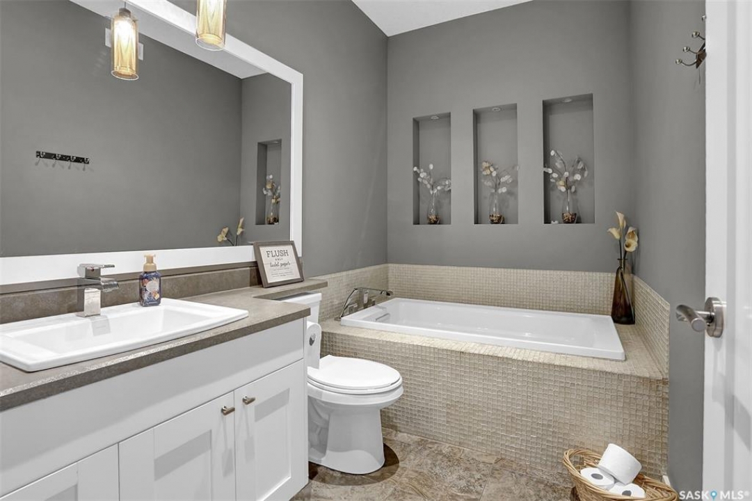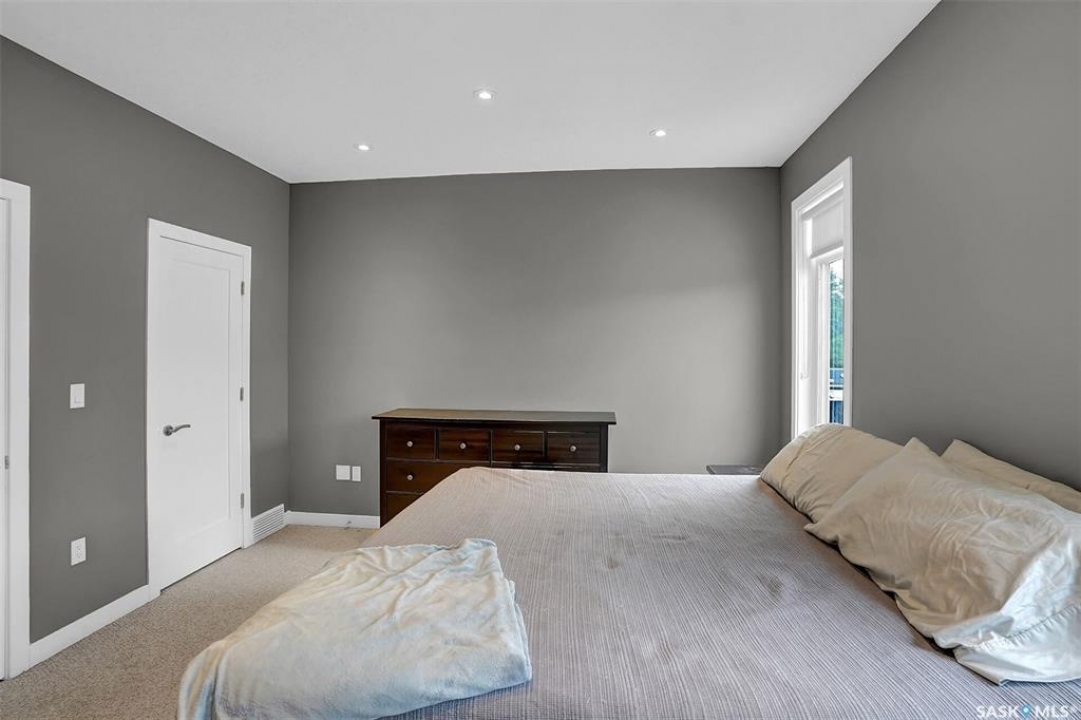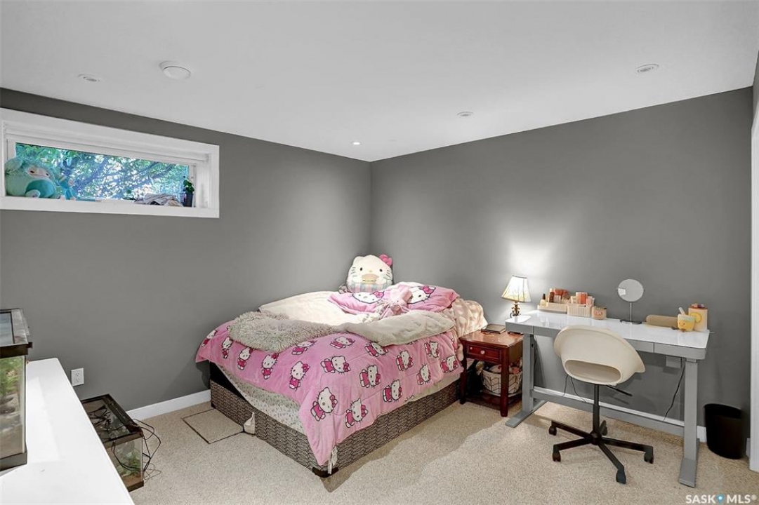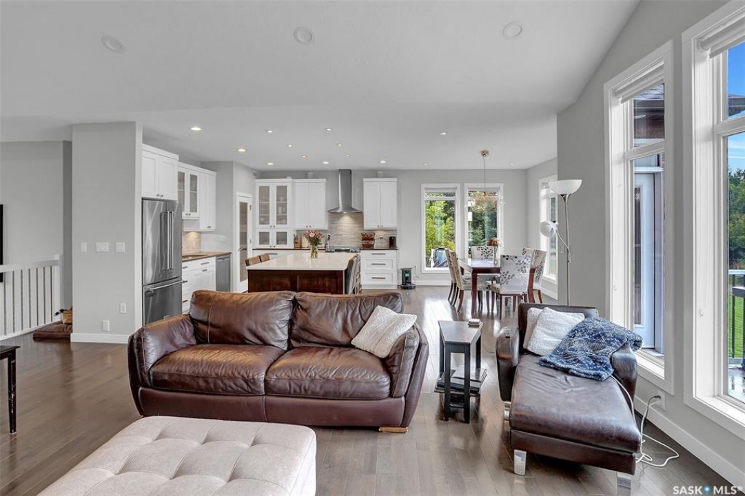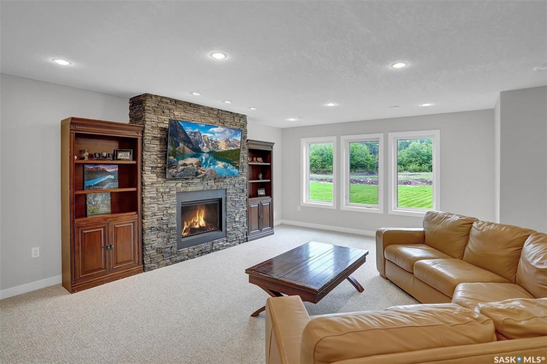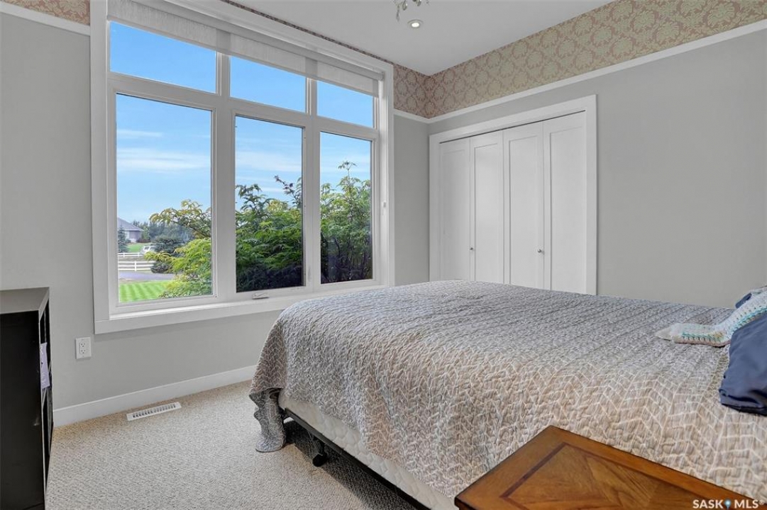 Don't miss this stunning walkout bungalow nestled on a prime 4.9-acre lot, highlighted by over 2 acres of mature trees complete with private walking and biking paths, a rare retreat just minutes from the city and walking distance to White Butte trails. This 1840 sq ft bungalow offers over 3,600 sq ft of beautifully developed living space with 5 bedrooms, a den, and 3 bathrooms, designed for both family living and entertaining. The exterior showcases stucco and stone finishes with a triple attached heated garage, with gemstone lighting, in ground sprinklers attached to well. A fully paved driveway provides ample parking for guests, trailers, and toys. Step inside to a bright, open foyer with tile floors that lead into the expansive main level. The living room features vaulted ceilings, hardwood flooring, and a striking floor to ceiling fireplace, with large windows that flood the space with natural light and frame picturesque views of your private acreage. The kitchen is both stylish and functional, complete with quartz countertops, a large island, stainless steel appliances, and abundant cabinetry. A convenient walk-through pantry connects to the laundry/mudroom with direct access to the heated garage. The dining area, surrounded by windows, opens onto a wrap-around deck with a gas BBQ hookup, the perfect spot for summer entertaining. The main floor offers 3 bedrooms, including a spacious primary suite with a walk-in closet and a 3-pc ensuite. A garden door off the ensuite leads to the deck, offering a private outdoor escape. A full bathroom with a tiled soaker tub serves the additional bedrooms. The fully developed walkout basement extends your living space with a large recreation room featuring a second fireplace, French doors to a versatile den, 2 additional bedrooms, and a 3-pc bathroom. Walkout access opens onto a covered aggregate patio featuring gemstone lighting and the beautifully landscaped backyard, where the treed acreage and private trails await.
