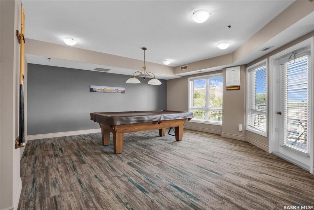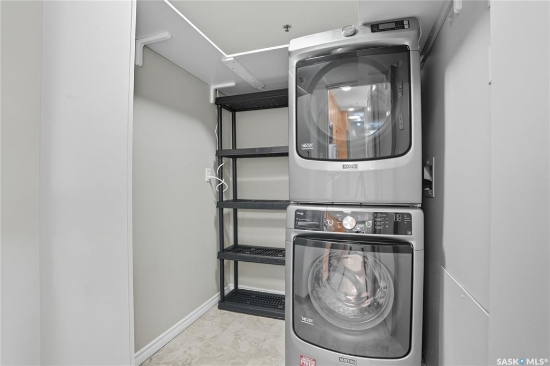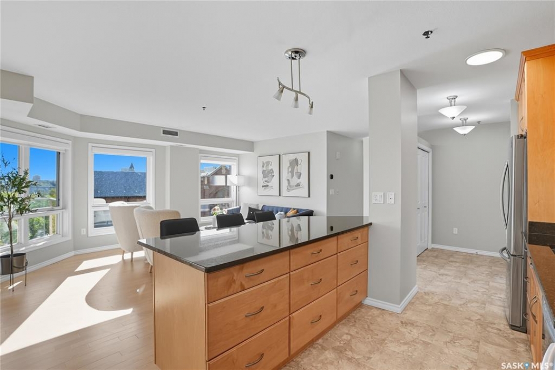 This beautifully maintained downtown condo offers one of the most desirable views in the building, overlooking the scenic river from its south-facing position. Perfectly situated to avoid harsh winds, it sits high enough to offer a stunning perspective above the treetops while remaining closely connected to the vibrant riverbank atmosphere. From your oversized balcony, enjoy a front-row seat to community events like runs, walk-a-thons, and fireworks, and soak in the sounds of live music during the Jazz Festival. Just under 1,200 square feet, the layout includes two spacious bedrooms and two full bathrooms. The bright, open-concept living space is ideal for both everyday comfort and entertaining, anchored by a large kitchen that features granite countertops, a tiled backsplash, and a massive island with additional seating. The adjoining dining area is bright and airy, while the expansive living room benefits from abundant natural light pouring in through the many windows. The generous primary bedroom includes a walk-in closet and a four-piece ensuite, while a second bedroom and additional four-piece bathroom provide ample space for guests or family. The laundry room adds convenience and the independent heating and central air personalized comfort year-round. Step outside your front door and onto the Meewasin River Trail, with direct access to walking and biking paths. Within walking distance of the University of Saskatchewan, Royal University Hospital, City Hospital, and Jim Pattison Children's Hospital. Living downtown means you're surrounded by some of the city's best restaurants, shops, entertainment, and cultural venues—all just steps away. One heated underground parking stall and a heated storage locker are included. Residents also enjoy access to a large amenities room complete with a kitchenette, pool table, lounge area, and a deck with BBQ. Exercise room is included in the condo fees, and for visiting friends or family, guest suites are available to rent.