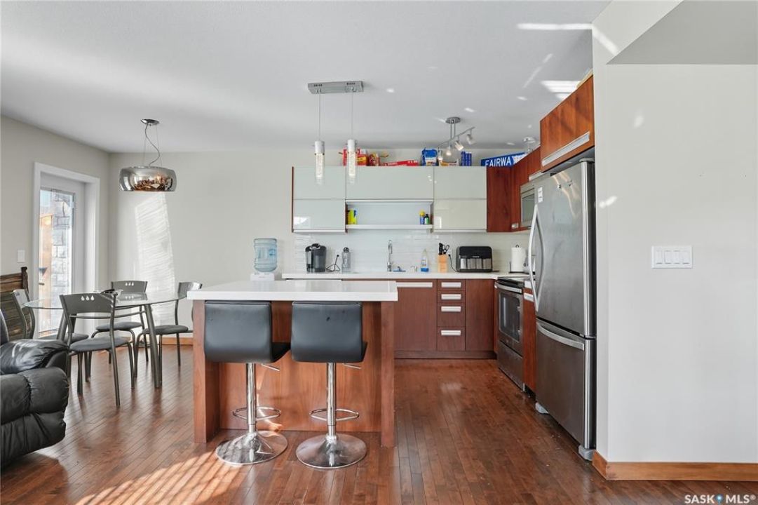 Bright days with additional windows and a little extra room thanks to being an end unit. The main floor features open-concept living with hardwood floors, a spacious living room and dining area, and a two-piece bath for guests. All three bathrooms have tiled floors, and the bedrooms and basement are carpeted. The kitchen includes stainless steel appliances, quartz counters, a white glass tiled backsplash, soft-close cabinetry, and plenty of storage. Upstairs has three bedrooms and a full bath, while the basement is finished with a large family room, a three-piece bathroom, and laundry. Extras include central air, central vac, a private patio, and a single attached garage with direct entry. Visitor parking is nearby, and the location puts you close to schools, shopping, amenities, and parks.
