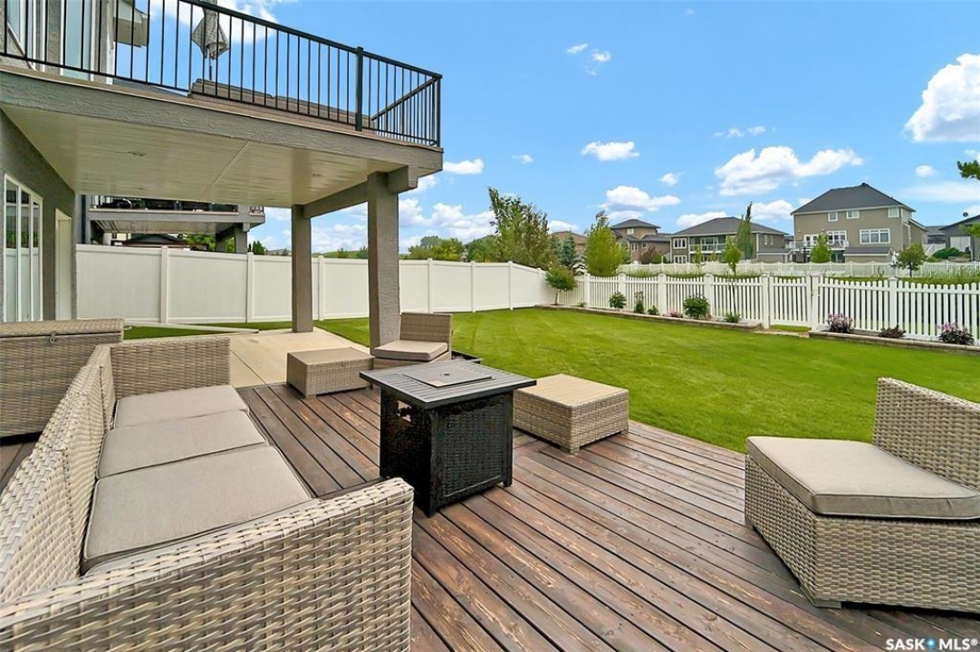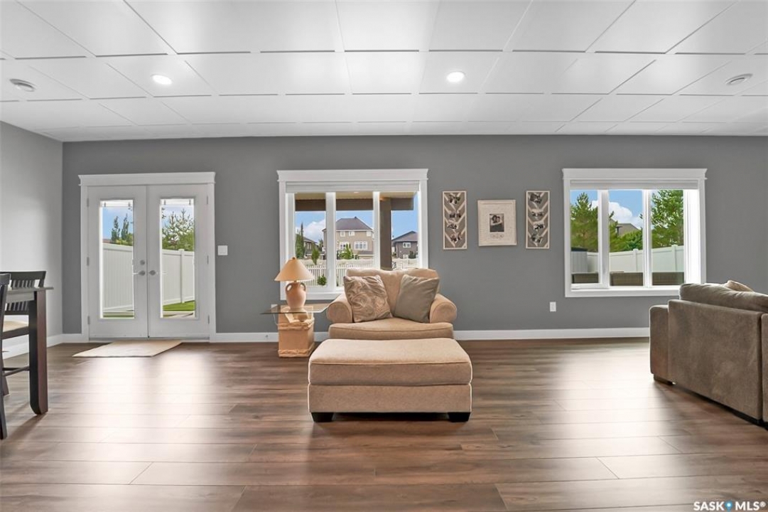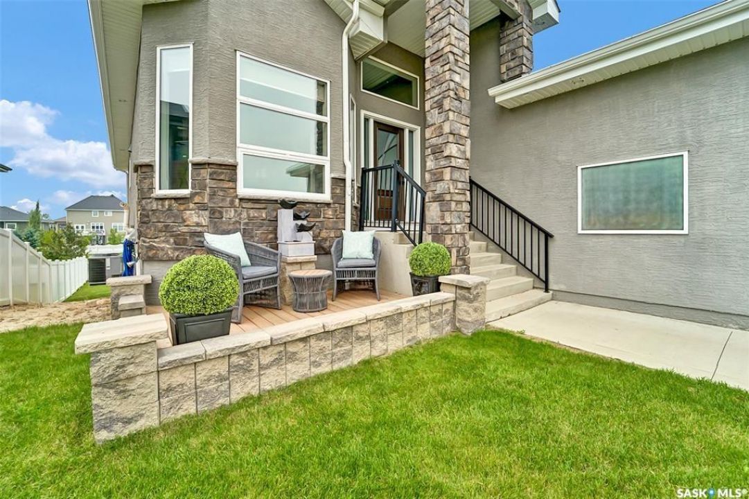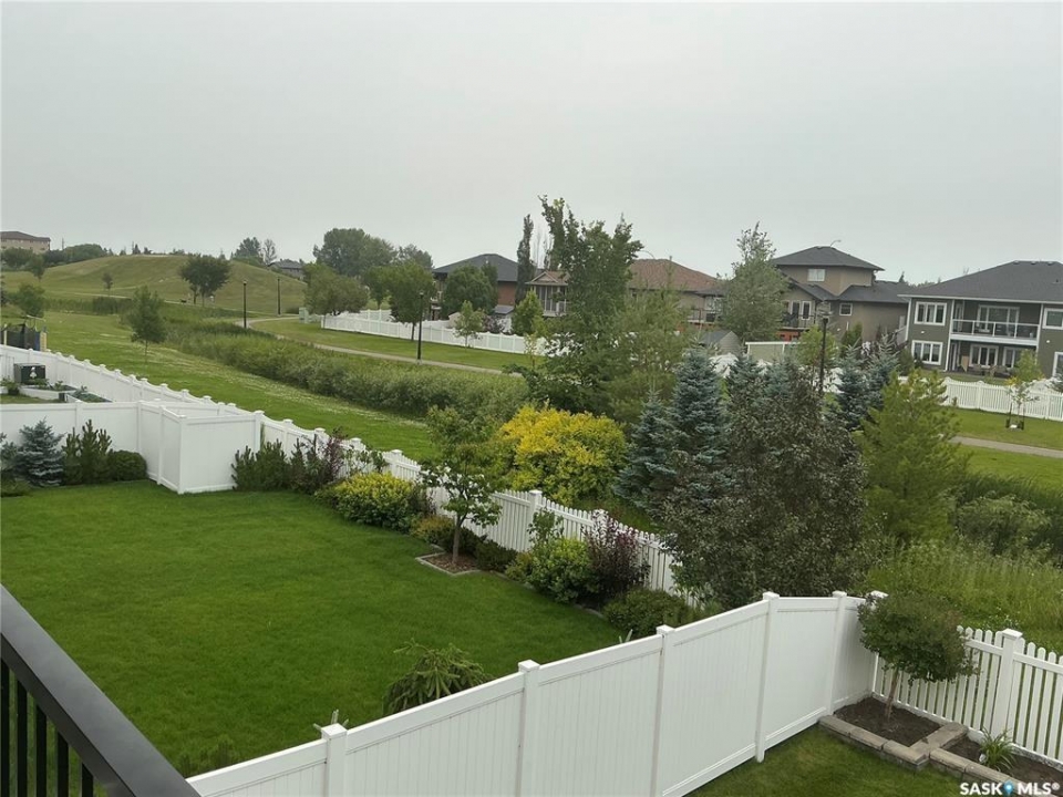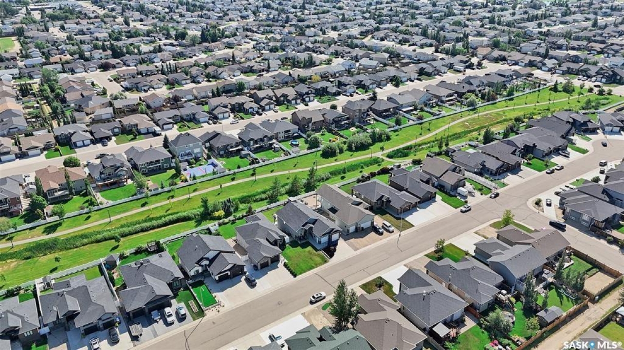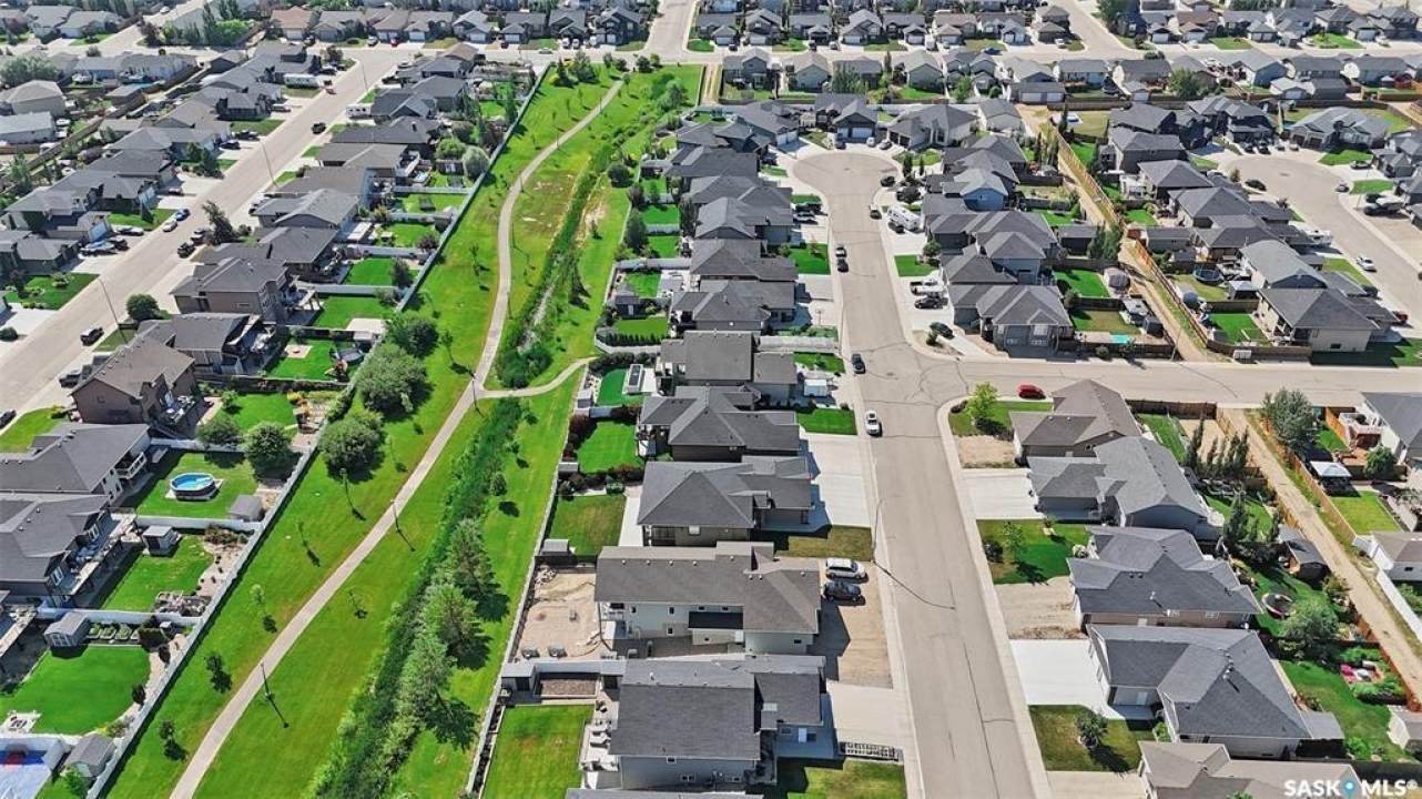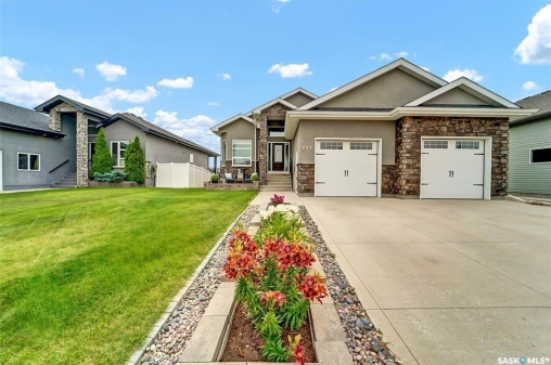 Welcome to this stunning walkout bungalow backing onto the park in Warman, where over $60,000 in recent upgrades have elevated this home into something truly special. From the moment you step inside, you'll be impressed by the spacious layout, elegant finishes, and natural light throughout. The main floor features a grand front entrance, a high-end kitchen with an oversized island, and a warm, inviting living room with a gas fireplace. The large primary bedroom includes a luxurious five-piece ensuite, while a second bedroom, dedicated office space, main floor laundry, and a breathtaking deck overlooking the park complete the level. The walkout basement offers a spacious family room, games area with a bar, two generous bedrooms, and a full bathroom. The beautifully landscaped backyard includes a lower patio, stonework, and two storage sheds. A heated double garage with 10-foot ceilings adds practicality to the home's charm. Upgrades include luxury vinyl plank flooring in the basement, new upgraded carpet on the main floor, solar-block tinted windows in the main floor living room,right side patio door as well as the basement family room right side, a custom front door, refreshed master bath with new taps and paint, front and lower decks, brick flowerbeds, and custom blinds in the basement. With its thoughtful design, serene park views, and turn-key updates, this home is the perfect blend of comfort and elegance ready for you to enjoy. This beautiful home is close to the schools, Warman community centre, and all other amenities.