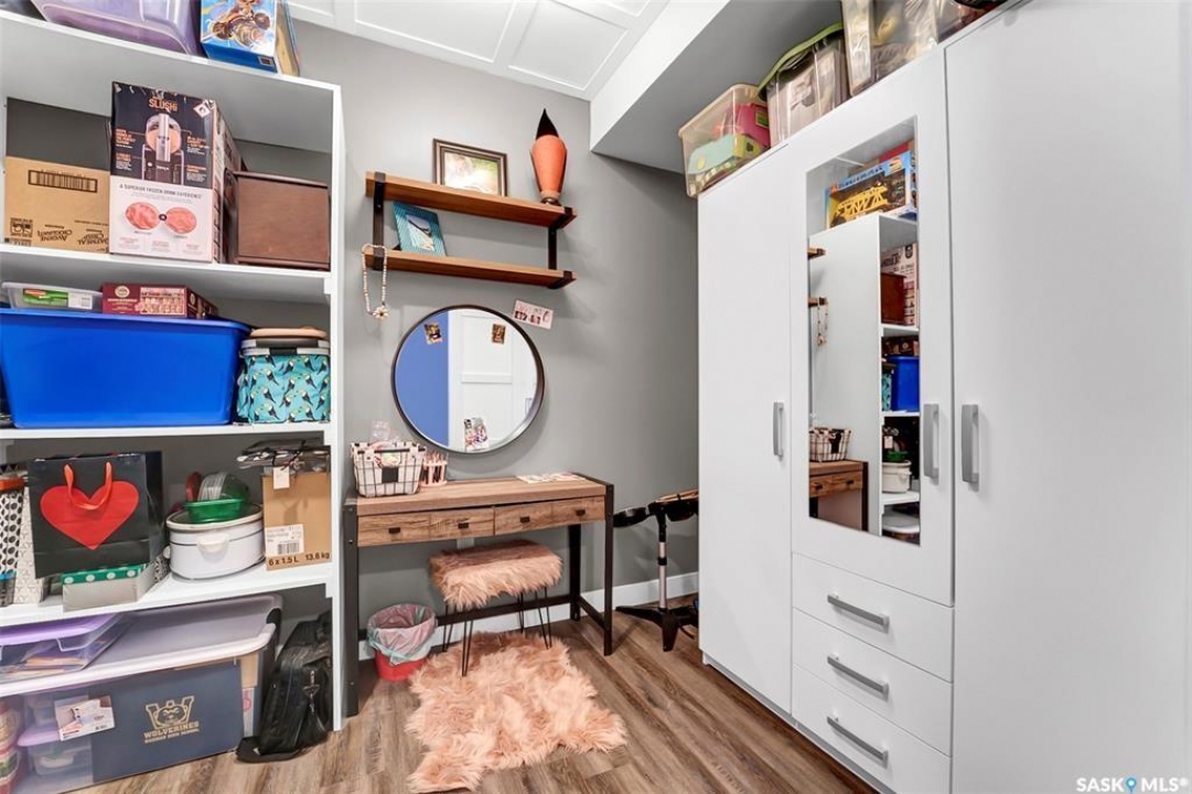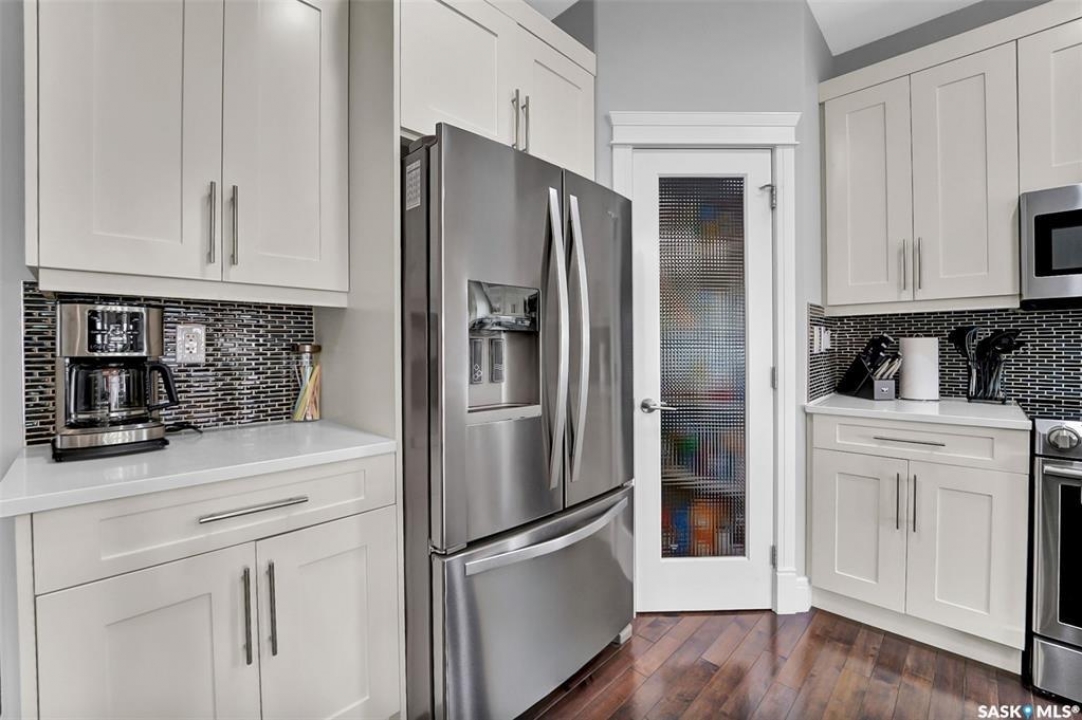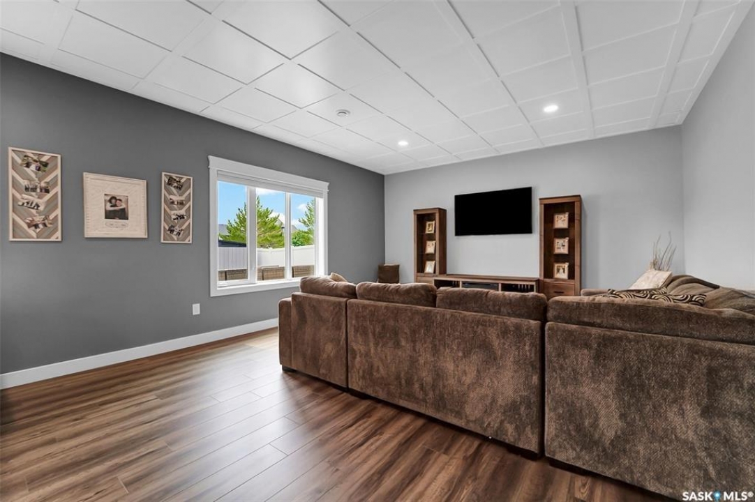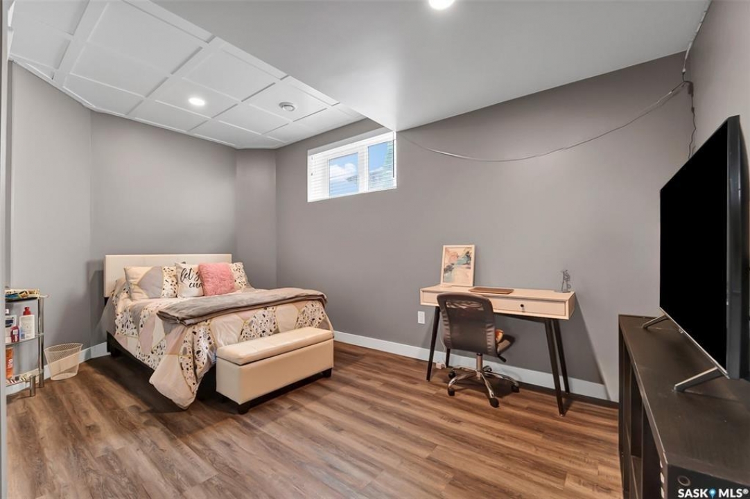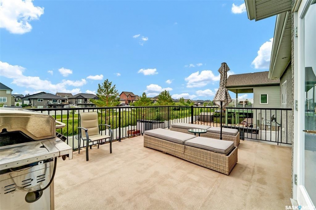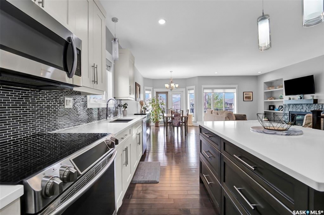 Welcome to this stunning walkout bungalow backing onto the park in Warman, where over $60,000 in recent upgrades have elevated this home into something truly special. From the moment you step inside, you'll be impressed by the spacious layout, elegant finishes, and natural light throughout. The main floor features a grand front entrance, a high-end kitchen with an oversized island, and a warm, inviting living room with a gas fireplace. The large primary bedroom includes a luxurious five-piece ensuite, while a second bedroom, dedicated office space, main floor laundry, and a breathtaking deck overlooking the park complete the level. The walkout basement offers a spacious family room, games area with a bar, two generous bedrooms, and a full bathroom. The beautifully landscaped backyard includes a lower patio, stonework, and two storage sheds. A heated double garage with 10-foot ceilings adds practicality to the home's charm. Upgrades include luxury vinyl plank flooring in the basement, new upgraded carpet on the main floor, solar-block tinted windows in the main floor living room,right side patio door as well as the basement family room right side, a custom front door, refreshed master bath with new taps and paint, front and lower decks, brick flowerbeds, and custom blinds in the basement. With its thoughtful design, serene park views, and turn-key updates, this home is the perfect blend of comfort and elegance ready for you to enjoy. This beautiful home is close to the schools, Warman community centre, and all other amenities.
