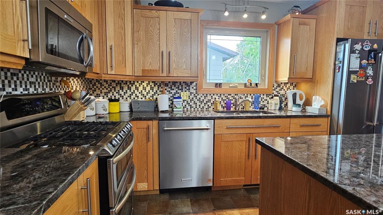 Located in a highly desirable area of Humboldt, this well-maintained bungalow offers 1,432 sq. ft. of living space with numerous updates throughout. The main floor features three bedrooms, including a primary suite with a three-piece ensuite, and a total of three bathrooms in the house. The updated kitchen is equipped with an island and stainless steel appliances and opens to a dining area and family room. A sunken living room with a wood-burning fireplace adds warmth and character to the main level. The lower level includes a spacious family room, two additional bedrooms, another 3 piece bathroom and ample storage. Additional features include hardwood floors, a single attached garage, central air conditioning, natural gas BBQ hook-up and a composite deck. The property is situated on a 68-foot lot with a beautifully landscaped yard. This home has been meticulously cared for and is move-in ready.