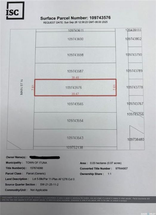 Fantastic opportunity to build your business in Ituna. High profile location on main street. 5 lots consisting of 16,250 sqft with great exposure and access. Lots 5-9 are being sold as one package deal.