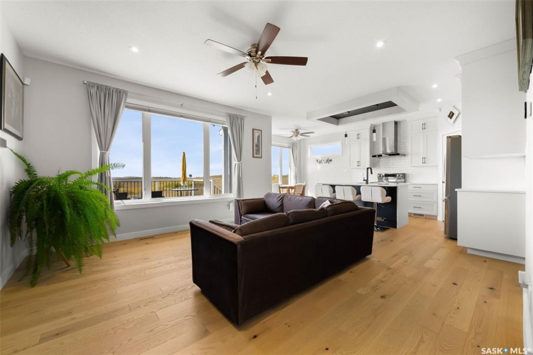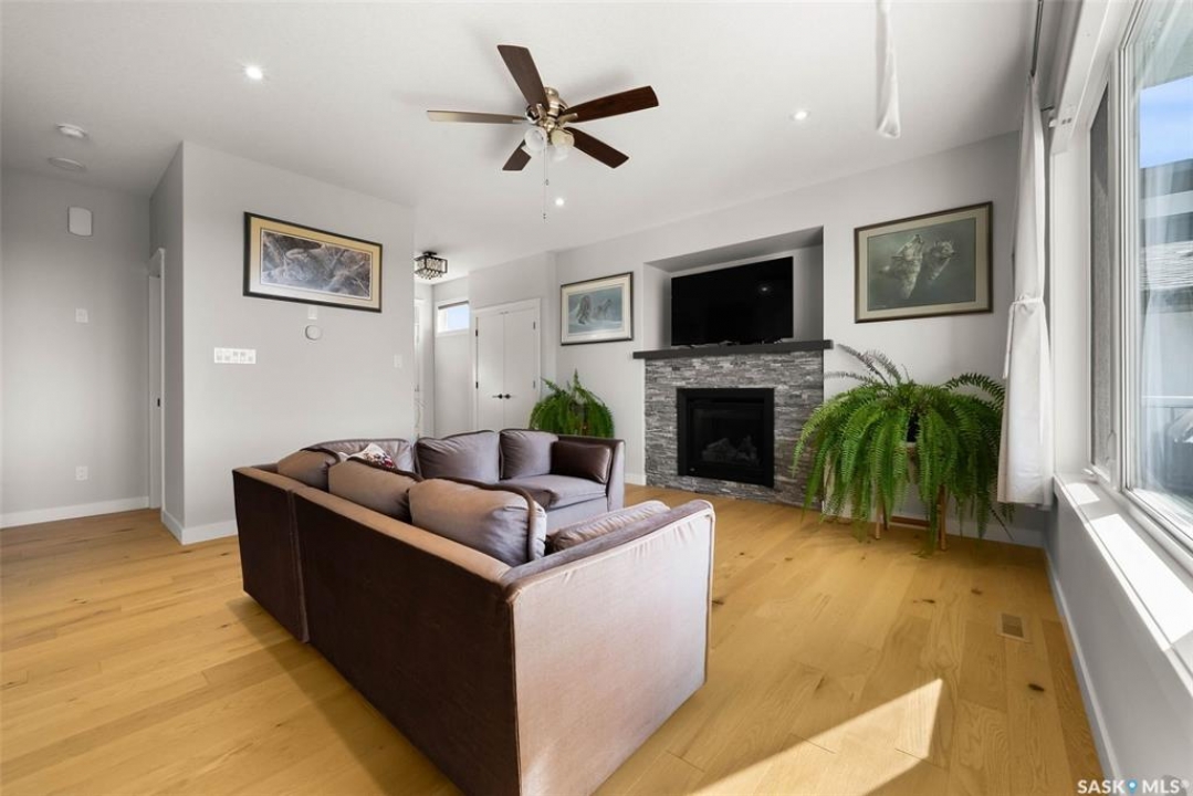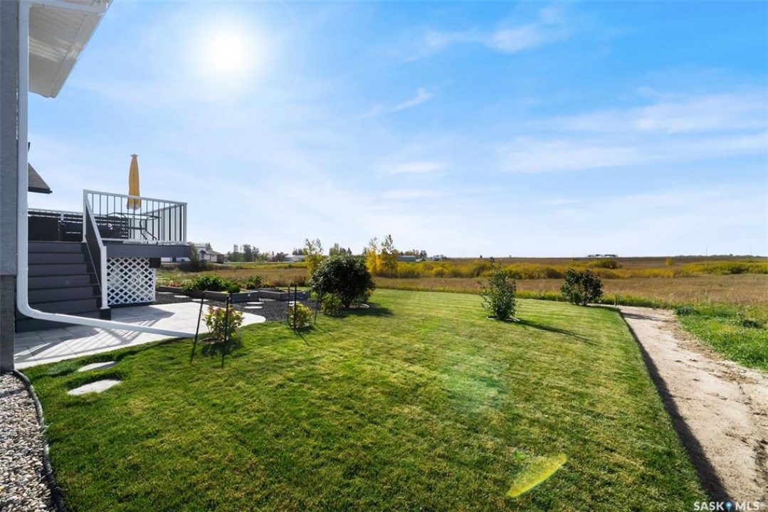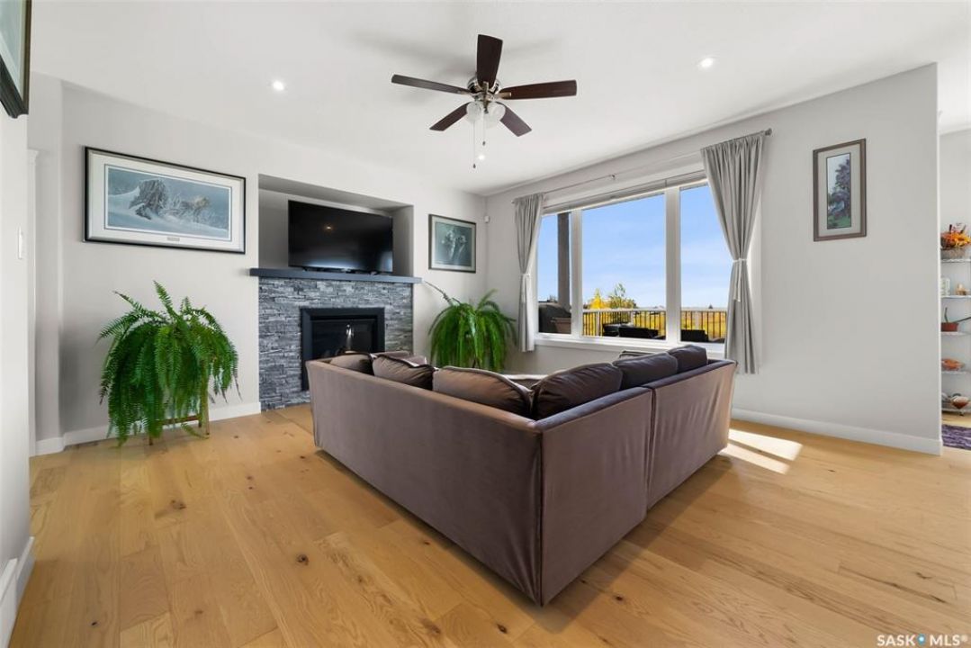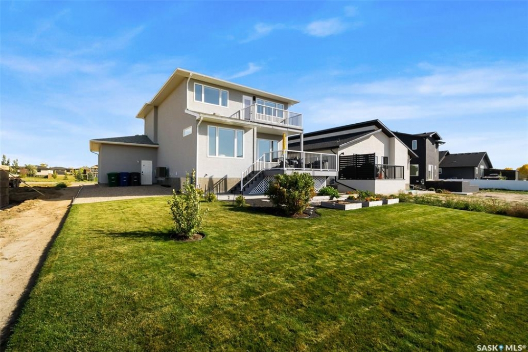 Welcome to 408 Hillside Drive in Pilot Butte! Built in 2020, this impressive 2-storey home offers over 1,700 sq. ft. of thoughtfully designed living space plus a triple attached garage. With modern finishes, premium upgrades, and a prairie backdrop, it's the perfect blend of style, comfort, and functionality. The main floor showcases an open-concept layout with engineered hardwood flooring and 2x6 construction on 16” centers. A bright living room centers around a remote-controlled gas fireplace with stone surround, while oversized windows fitted with Hunter Douglas top-down/bottom-up blinds capture expansive views. The chef's kitchen boasts quartz countertops, custom cabinetry with under-cabinet lighting, subway tile backsplash, stainless steel appliances including a granite sink, a large island, and walk-in pantry. The dining area opens onto a spacious deck, ideal for entertaining, while a powder room and mudroom with laundry complete this level. Upstairs, the primary suite impresses with 10' ceilings, a walk-in closet, and spa-inspired ensuite with dual sinks and custom tiled shower. Two additional bedrooms, a full bath, and a bonus room with balcony access offer versatility for family living. The basement is open for development, with exterior walls spray-foamed and drywalled—ready for your personal touch. Notable upgrades include a whole-home water filtration system, surge protection, central A/C, on-demand hot water, and hot/cold water taps in the garage. Curb appeal shines with a fully insulated triple garage, exposed aggregate driveway, and beautifully landscaped yard. The backyard retreat features underground sprinklers, raised garden beds, lush lawn, a composite deck, and tiled patio backing green space—perfect for enjoying Saskatchewan sunsets. This home combines quality construction, thoughtful upgrades, and an unbeatable Pilot Butte location. Truly move-in ready for its next proud owner.