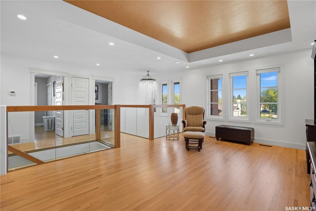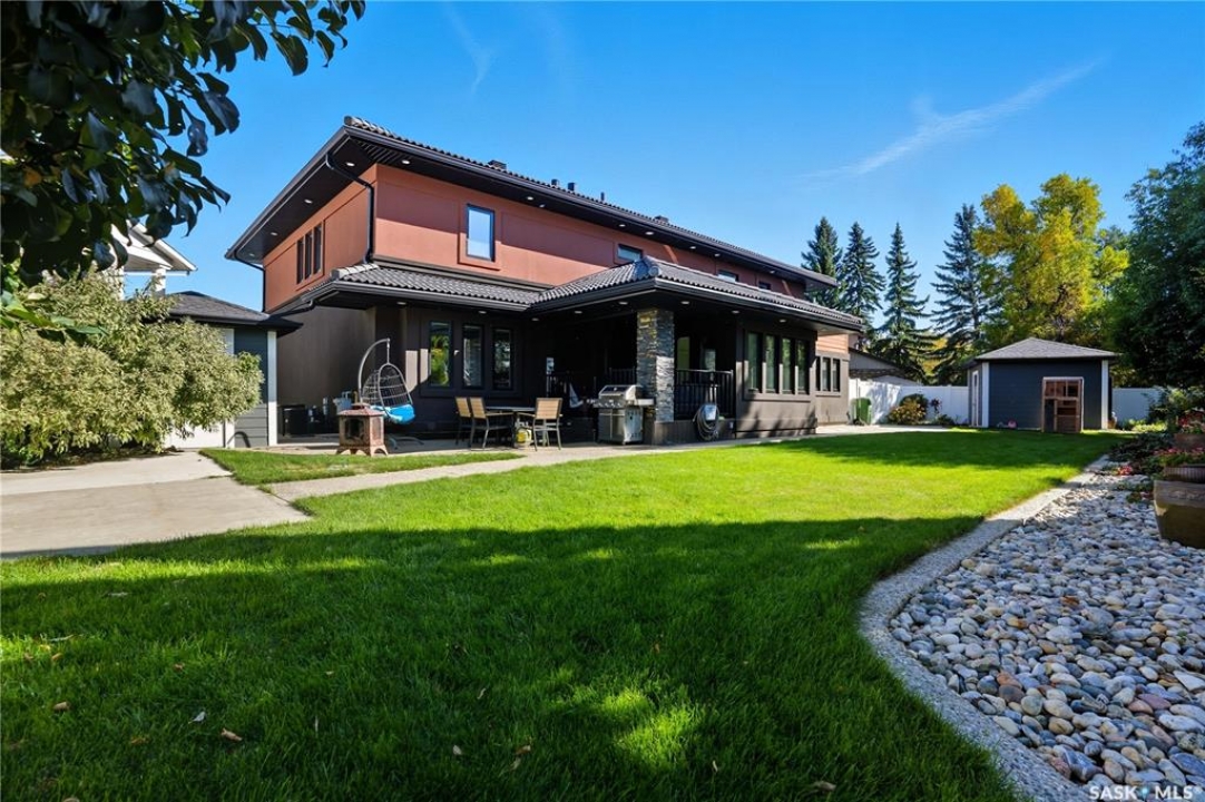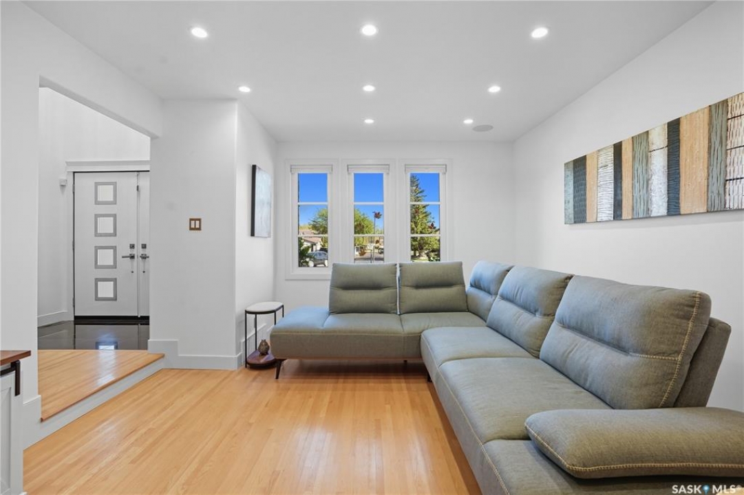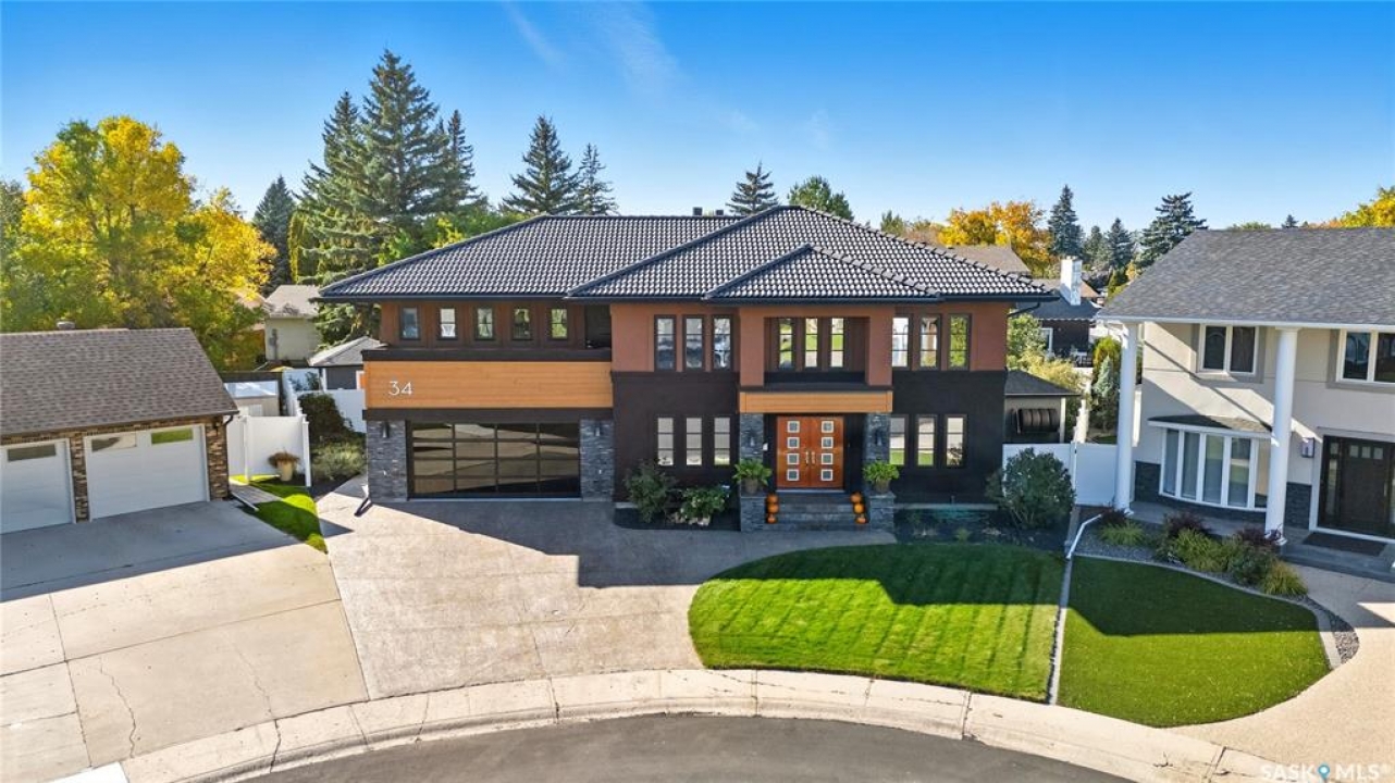 Welcome to 34 Leslie Place, a quiet bay in Regina's desirable Albert Park. This extensively renovated home blends elegance, comfort, and functionality—ready for immediate enjoyment. The grand entryway opens to a sunken living room with a 2-way gas fireplace and white quartz surround, a central wood-tile staircase, family room, and formal dining area overlooking the backyard. Custom hardwood floors flow throughout. The kitchen features warm wood cabinetry, granite countertops, tile flooring, double stainless sinks, a fireplace, and a cozy breakfast nook. A 2-piece bath and office/den with private entrance—currently a salon—complete the main floor. Upstairs, a bonus room overlooks a crystal chandelier and highlights custom woodwork, a gas fireplace, coffered ceiling, pot lights, and built-in sound. The luxurious 5-piece bath offers double sinks, glass block accents, and a seating area. The spacious primary suite includes two private balconies, dual closets (including built-in shoe storage), and a spa-like ensuite with soaker tub, walk-in shower, and water closet. Three additional bedrooms complete the upper level. The finished basement features a soundproof entertainment room, bedroom, 3-piece bath, and laundry with sink and cabinetry. Outside, enjoy a fully landscaped corner lot with stone/stucco exterior, wood accents, custom lighting, and double drive. The PVC-fenced backyard includes a covered deck wired for sound, stone patio, and heated double garage with epoxy floors and aluminum/glass door. Value-added features: built on piles, exterior EIFS envelope, tile roofing system, natural gas BBQ hookup, central A/C, Control4 system, alarm, 200-amp panel, sewer backflow valve, HRV, hi-eff furnaces with humidifiers, and more. All drawings and improvement details available. A rare find in a prime location—call your agent today.