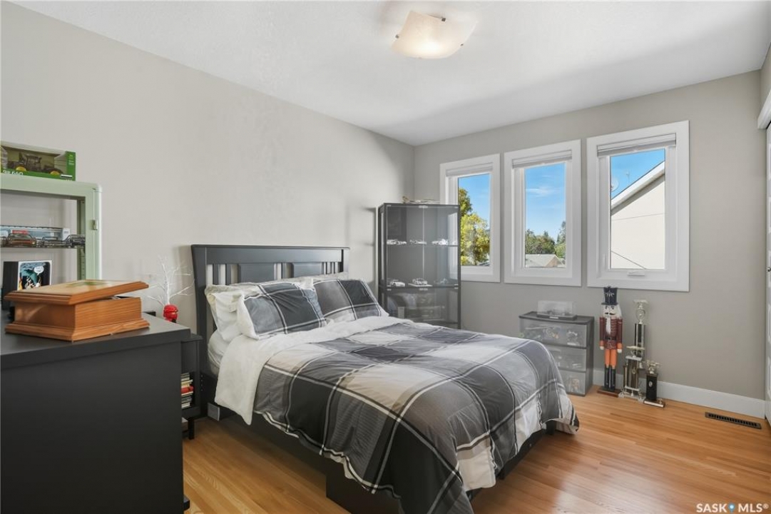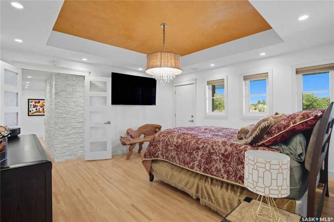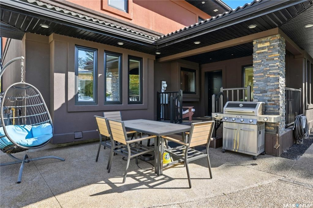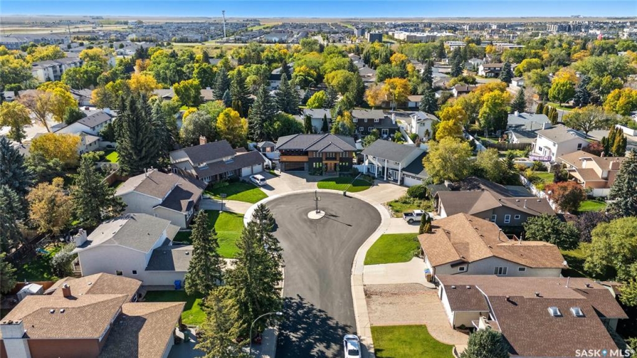 Welcome to 34 Leslie Place, a quiet bay in Regina's desirable Albert Park. This extensively renovated home blends elegance, comfort, and functionality—ready for immediate enjoyment. The grand entryway opens to a sunken living room with a 2-way gas fireplace and white quartz surround, a central wood-tile staircase, family room, and formal dining area overlooking the backyard. Custom hardwood floors flow throughout. The kitchen features warm wood cabinetry, granite countertops, tile flooring, double stainless sinks, a fireplace, and a cozy breakfast nook. A 2-piece bath and office/den with private entrance—currently a salon—complete the main floor. Upstairs, a bonus room overlooks a crystal chandelier and highlights custom woodwork, a gas fireplace, coffered ceiling, pot lights, and built-in sound. The luxurious 5-piece bath offers double sinks, glass block accents, and a seating area. The spacious primary suite includes two private balconies, dual closets (including built-in shoe storage), and a spa-like ensuite with soaker tub, walk-in shower, and water closet. Three additional bedrooms complete the upper level. The finished basement features a soundproof entertainment room, bedroom, 3-piece bath, and laundry with sink and cabinetry. Outside, enjoy a fully landscaped corner lot with stone/stucco exterior, wood accents, custom lighting, and double drive. The PVC-fenced backyard includes a covered deck wired for sound, stone patio, and heated double garage with epoxy floors and aluminum/glass door. Value-added features: built on piles, exterior EIFS envelope, tile roofing system, natural gas BBQ hookup, central A/C, Control4 system, alarm, 200-amp panel, sewer backflow valve, HRV, hi-eff furnaces with humidifiers, and more. All drawings and improvement details available. A rare find in a prime location—call your agent today.