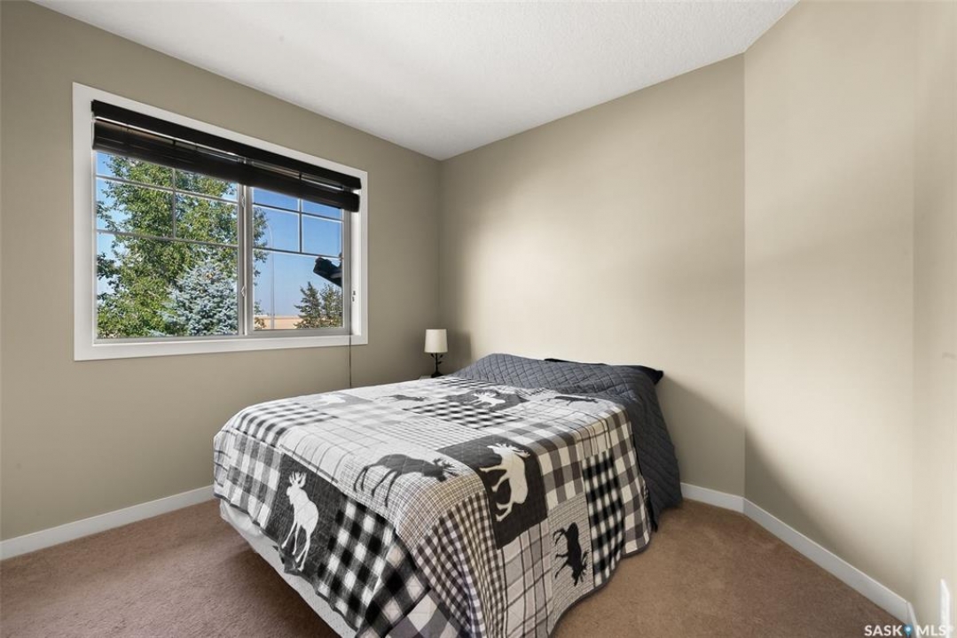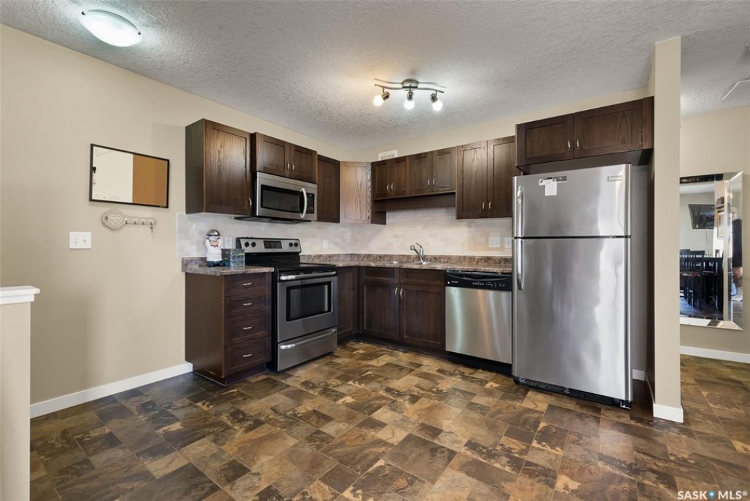 Located in the sought-after Lakeridge Addition! This well-maintained upper-level condo offers 2 bedrooms, 1 bathroom! Bright, functional living space – perfect for first-time buyers, downsizers, or investors. Step into an open-concept layout featuring a spacious living room with large windows overlooking open green space – no rear neighbours! The kitchen offers rich cabinetry. Vinyl flooring runs throughout the main areas. The 4-piece bathroom is clean and modern, and the unit includes in-suite laundry and a utility/storage room for added convenience. Enjoy your morning coffee or sunset views from the covered balcony just off the living room. This unit comes with one electrified parking stall (stall #60) located conveniently nearby, plus visitor parking. Included are all appliances (fridge, stove, dishwasher, microwave hood fan, washer & dryer), window coverings, and a window A/C unit. Located in a quiet, well-kept complex, you're just minutes from Regina's north-end amenities – grocery stores, restaurants, schools, parks, and transit. Condo fees are a low $189.50/month and cover exterior maintenance, lawn care, snow removal, and more. Affordable, stylish, and move-in ready – this condo has it all. Don't miss your chance to own in one of Regina's most desirable areas. Contact your REALTOR � today to schedule a private showing!