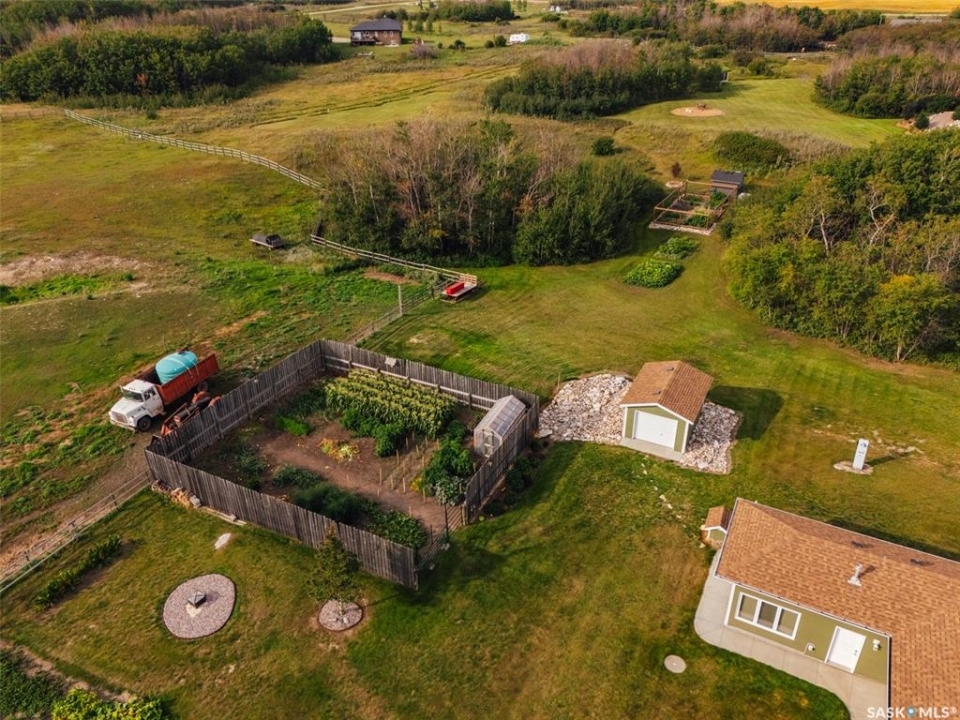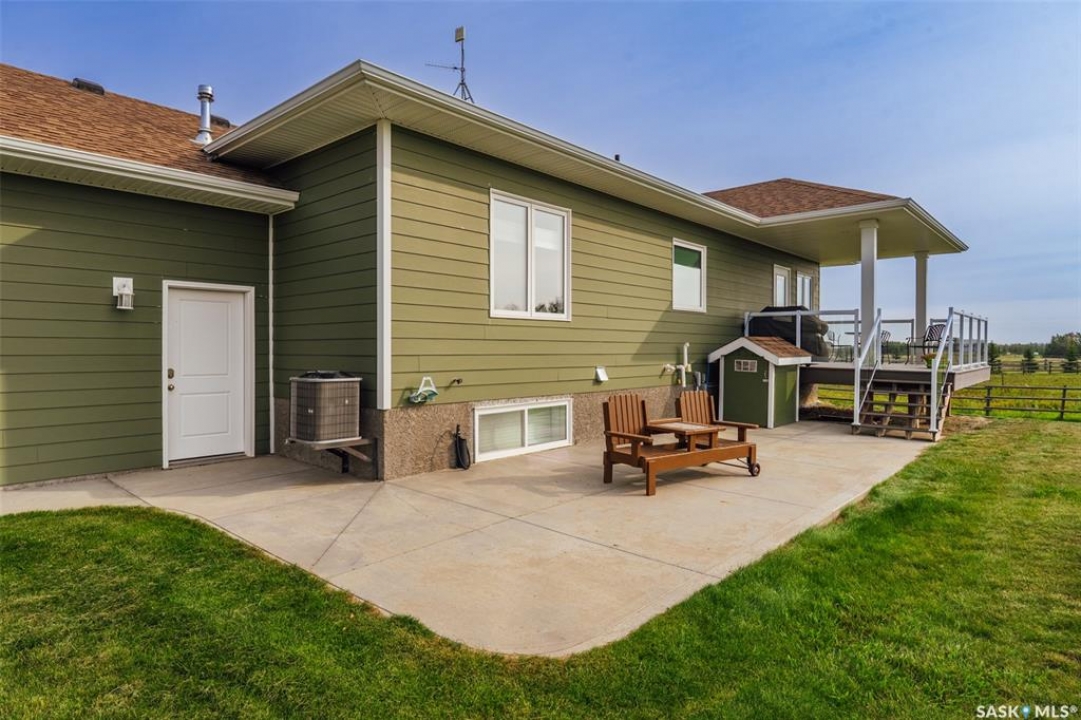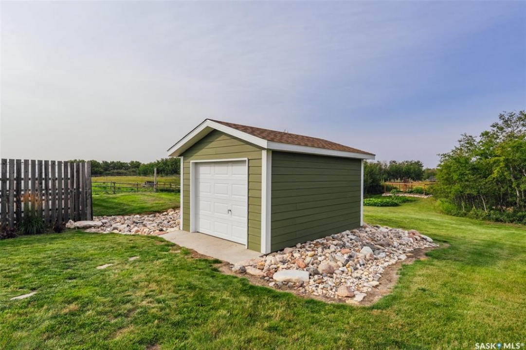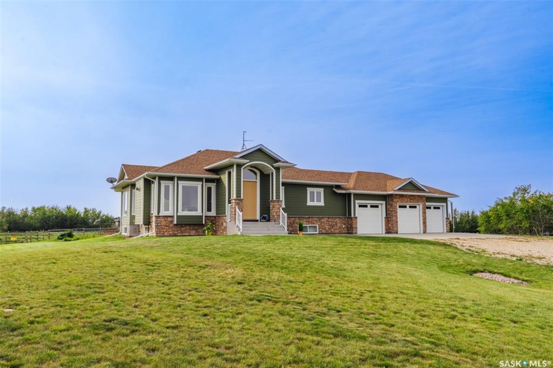 Welcome to 118 Louise Crescent in the coveted acreage community of Cherry Hills — just 15 minutes from Saskatoon's edge. This 1,502 sq. ft. executive bungalow is a stunning blend of modern design, smart functionality, and country charm. Step inside to discover a bright, open-concept main floor with an exceptional window package that floods the home with natural light. The spacious living room, dining area, and kitchen flow seamlessly under a vaulted ceiling, creating the perfect setting for entertaining or relaxing. The kitchen features quartz countertops, a corner pantry, roll-out drawers, stainless steal appliances. The dining room can easily seat a large extended family for holiday meals and the gas fireplace in the adjoining living room makes for cozy evenings. Hardwood runs throughout the main level, and a covered deck off the dining area allows for year-round BBQ. The primary suite is a lovely retreat, offering a large walk-in closet and an ensuite with a soaker tub beneath a privacy rain-glass window, heated floors, and a walk-in shower. A 2nd large bedroom (or office), another 4-piece bath, and a spacious mudroom/laundry room with built-in cabinetry, quartz countertops, and deep utility sink complete the main floor — all leading to an oversized triple-car garage with a separate workshop bay and a sunlit all-season greenhouse.The fully finished basement features a large family and games area, 2 more bedrooms, 4-piece bath, and a vented cold storage room perfect for preserves or wine. Outside, the 7.14 acre property is 3/4 fenced with treated rail fencing, hotwired, & divided into five paddocks with a 4-season watering bowl sourced by underground lines. Mature spruce trees border the property, and there's a drive-in garden shed, an adorable matching horse barn, and 2 fully developed gardens with direct waterlines. Complete with central air, central vac, and window coverings, this Cherry Hills acreage offers comfort with country serenity — a truly rare find.