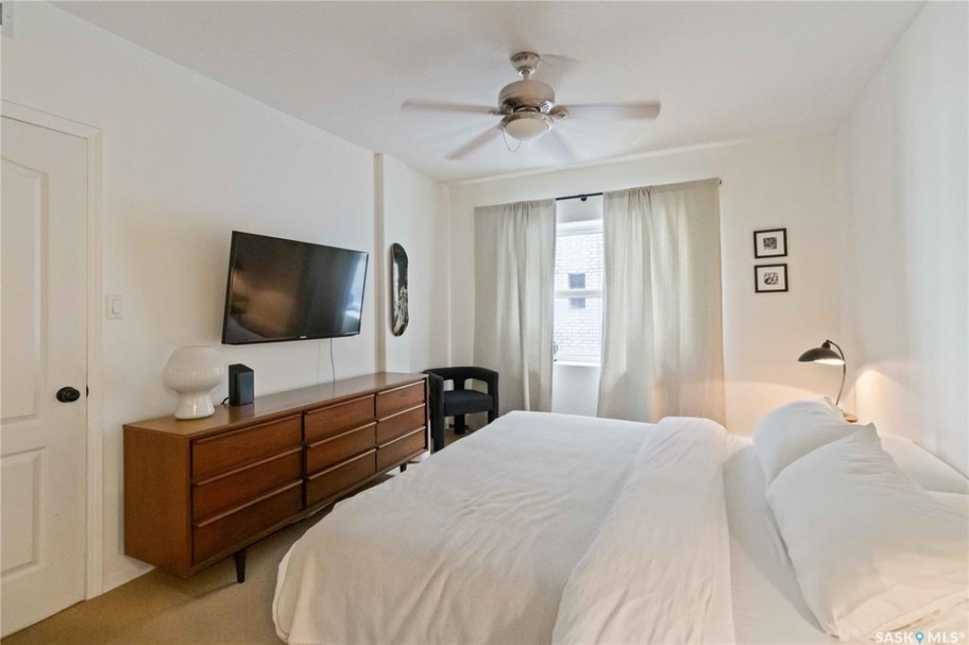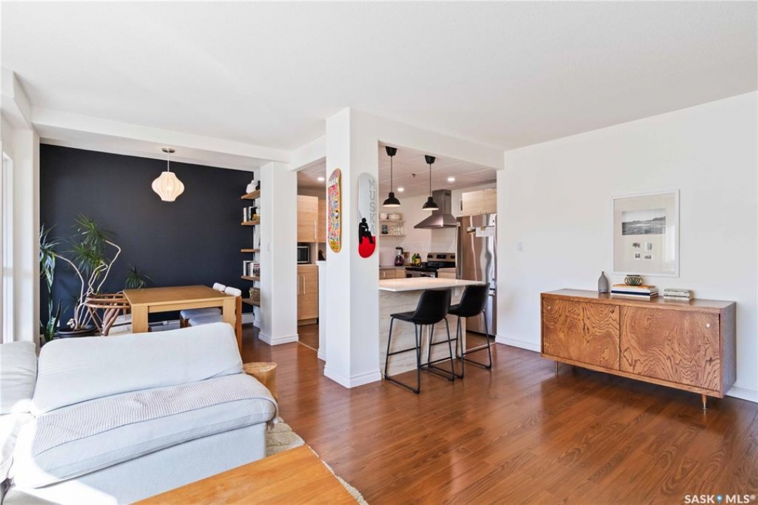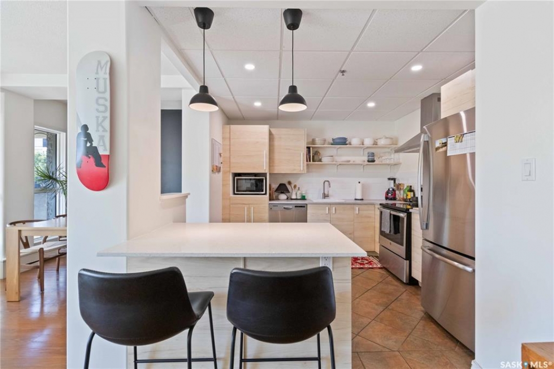This condo is located on the first floor, with easy elevator access. Inside, you're greeted by a bright and spacious entryway. The unit offers an open-concept living and kitchen area. The kitchen stands out with its quartz-topped island, modern Scandinavian-inspired cabinetry, tiled backsplash, sleek pot lighting, stainless steel appliances. Just off the dining space, you'll find a private west-facing balcony with a BBQ hookup—perfect for enjoying sunny afternoons and glowing evening sunsets. The living room is generously sized, featuring large windows that fill the space with natural light. The primary bedroom includes a full ensuite with a walk-in shower, while the second bedroom (currently used as an office) sits adjacent to the main bath with tub/shower combo. Additional highlights include in-suite laundry, central air conditioning, and the convenience of having the laundry room tucked away near the entry. Recent Chg: 09/22/2025 : NEW : ->A