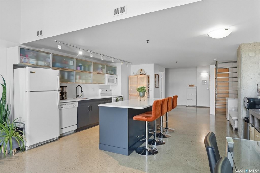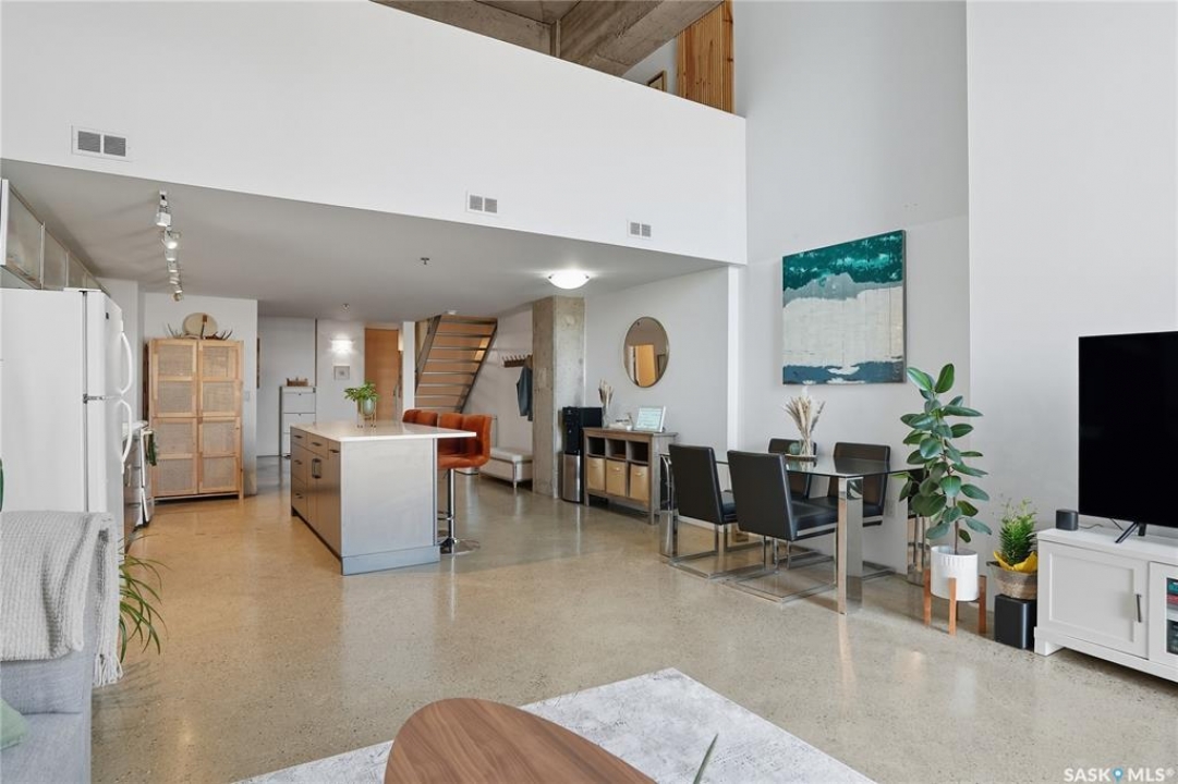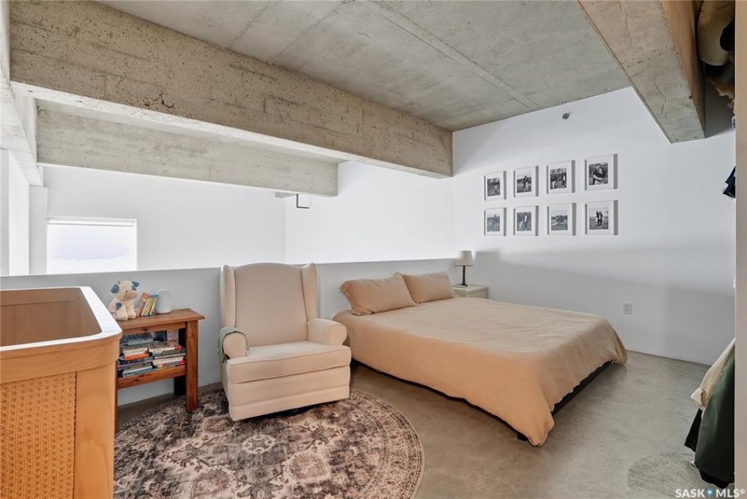 Welcome to this stunning East-facing loft located in the heart of Saskatoon's Central Business District. With 1,100 square feet of free-flowing living space, this 1-bedroom, 1.5-bath unit combines industrial charm with modern finishes, offering the perfect balance of comfort, style, and urban convenience. Soaring ceilings and a large window floods the space with natural light, enhancing the airy, open-concept layout. The kitchen has been beautifully upgraded with new quartz countertops and an oversized island—ideal for both entertaining and everyday living. The spacious living and dining areas flow effortlessly, creating a versatile space for relaxing or hosting. The large bedroom features a 4-piece ensuite, while a separate half-bath adds convenience for guests. Located directly across from the buildings fitness centre and rooftop terrace access, this unit offers unmatched access to some of the building's best amenities. The building itself is a standout in downtown living, with a modern lobby, rooftop terrace complete with a pergola-covered BBQ area, fitness centre, elevator, and heated underground parking. Live just steps from some of Saskatoon's best restaurants, coffee shops, shopping, nightlife, and the riverbank. Whether you're a professional looking for a stylish downtown home or an investor seeking a high-demand location, this loft offers exceptional value and a lifestyle that's hard to beat.