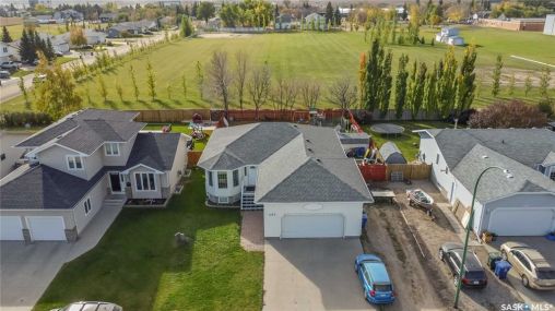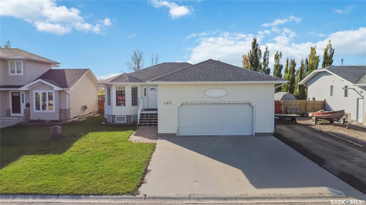 Welcome to 603 Cannon Court in Aberdeen. This home is situated on one of the best lots in the community. Located on a quiet cul de sac that backs onto a park that connects to the school and arena. Not to mention the huge 8246 square foot lot that is fully fenced and landscaped. There is a double concrete driveway out front with room on the west side of the lot for rv parking. The home comes with a double 24x24 attached garage that is insulated and boarded. The main floor of this raised bungalow has a large living room at the front of the house, kitchen and dining face the back yard with entry to the deck off the dining. The kitchen features a large island and corner pantry. There is a large master bedroom with a full 4 pc bath, a second bedroom, laundry room and 2nd 4 piece bath all on the main floor. The basement has a bedroom, a large 2 piece bath that has lots of room for a tub or shower and the rest of the basement is a huge family room. The home has new shingles, furnace, water heater and hrv. All this for $374900.00. Call to view!!