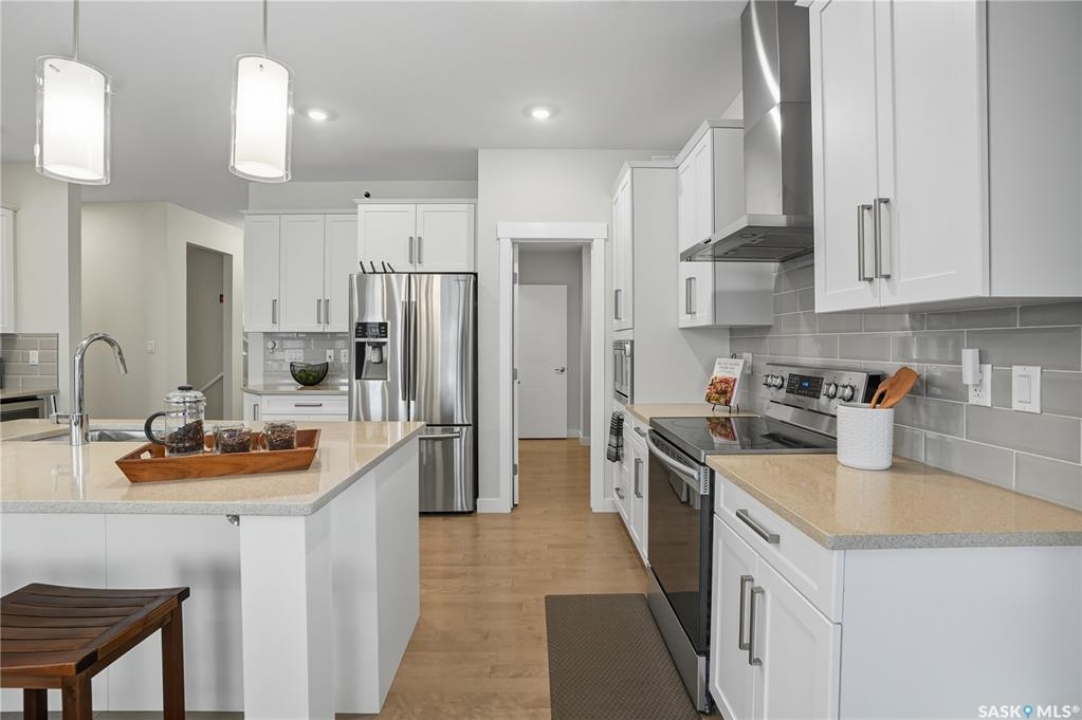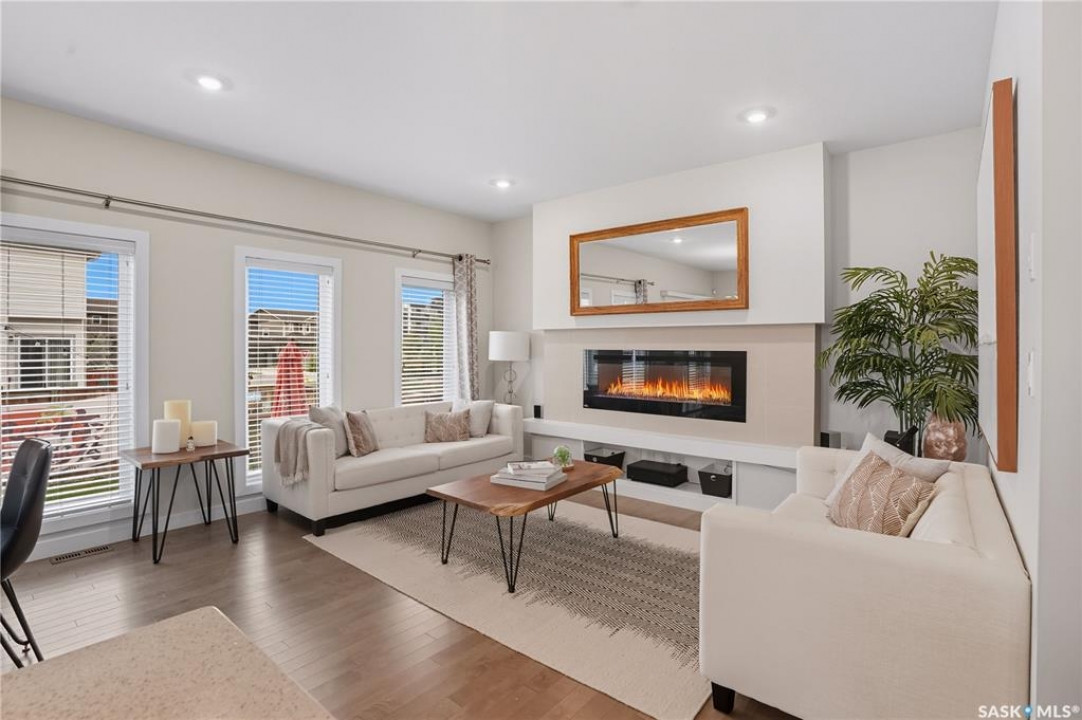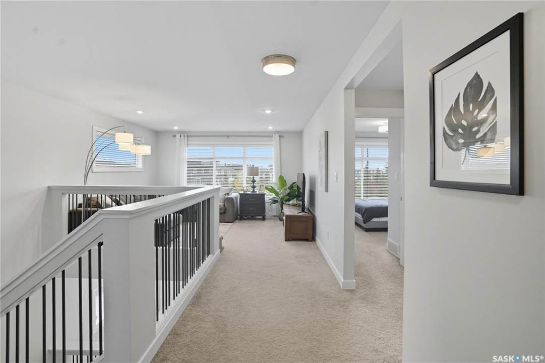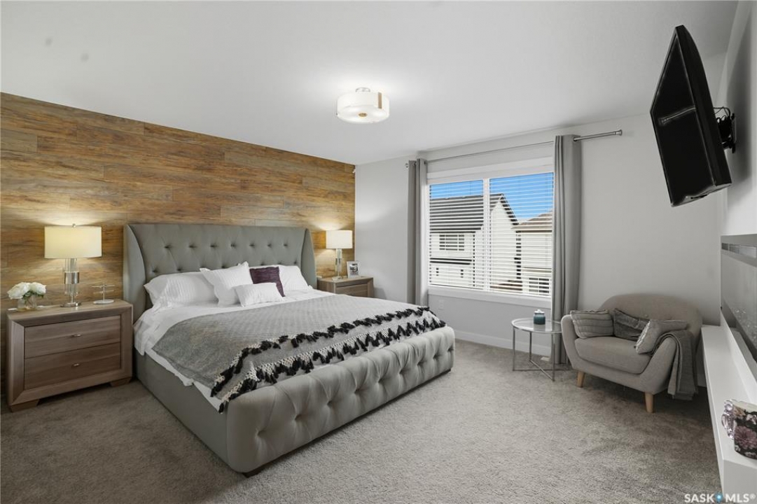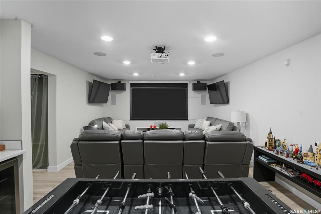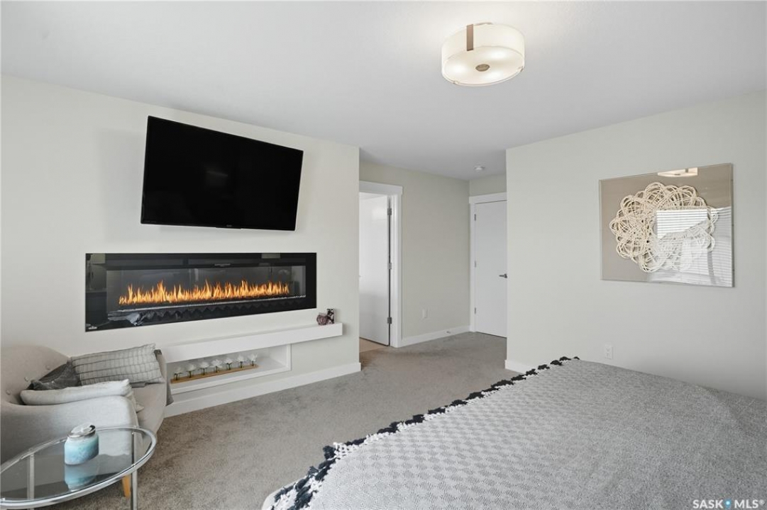 Welcome to 303 Dagnone Crescent—an exceptional former Daytona show home in the highly sought-after Brighton community. This stunning 2-storey residence offers 2,287 sq. ft. of thoughtfully designed living space on a desirable corner lot, facing a beautiful walking trail and steps from parks, the Brighton Child Care Centre, and the vibrant community shopping hub. Its modern exterior features vinyl siding with stone accents and a fully finished triple-staggered garage, complete with in-floor heat, built-in speakers, a home gym with mirror, and included TVs—perfect for both hobbyists and fitness enthusiasts. Inside, the 9-ft main floor impresses with a spacious foyer, open-concept living and dining areas, and a chef's kitchen boasting quartz countertops, soft-close cabinetry, stainless steel Samsung appliances, a walk-through pantry, and a wet bar with wine cooler. Upstairs, enjoy a bright bonus room with trail views, a luxurious primary suite featuring an electric fireplace, a spa-like 5-pc ensuite with double vanity, soaker tub, and tiled shower, plus two generous bedrooms and a convenient laundry room with cabinetry. The professionally finished basement continues the show-home standard with a versatile glass-walled office/bedroom and an entertainment-ready theatre room complete with three TVs, speakers, projector, and screen. A second wet bar, full bathroom, and ample utility upgrades ensure comfort and convenience year-round. With nearly every detail considered—from high-end finishes to abundant natural light and scenic surroundings—this home perfectly combines style, functionality, and location. All furniture is negotiable, and all wall decorative artworks are included. Most items are available for purchase. Don't miss the opportunity to own one of Brighton's finest properties, where every feature reflects quality craftsmanship and modern living at its best.