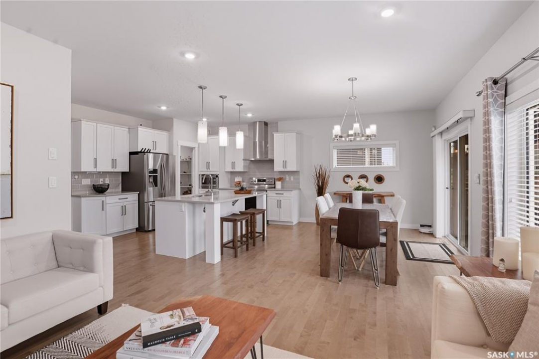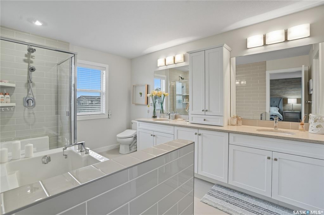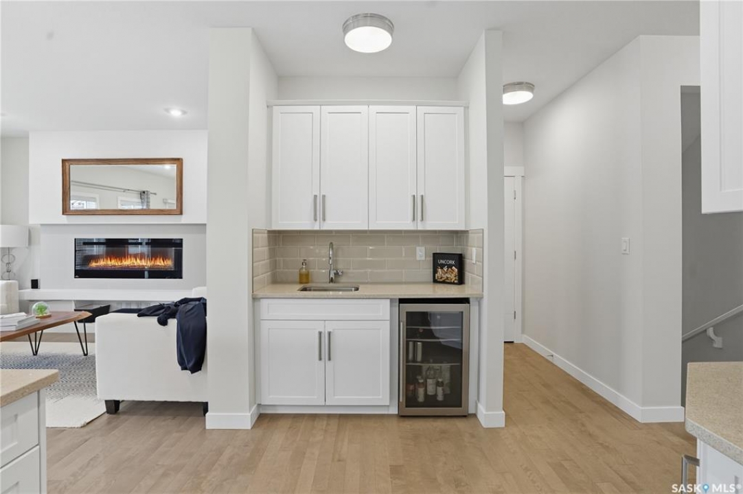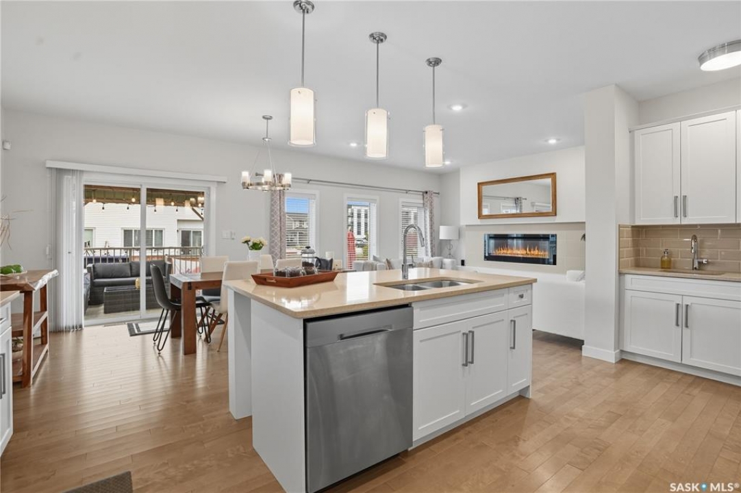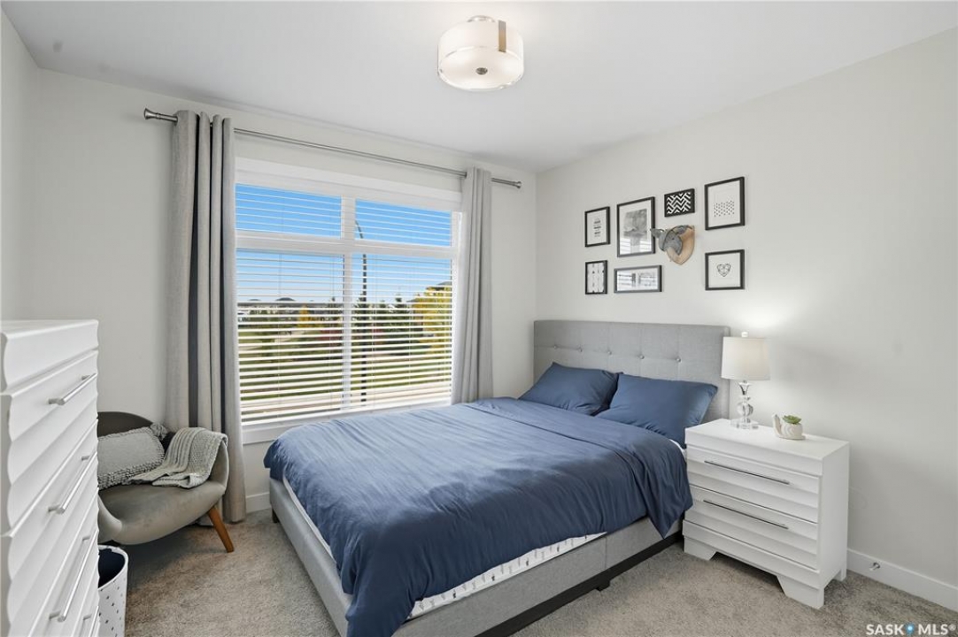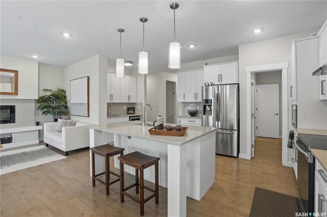 Welcome to 303 Dagnone Crescent—an exceptional former Daytona show home in the highly sought-after Brighton community. This stunning 2-storey residence offers 2,287 sq. ft. of thoughtfully designed living space on a desirable corner lot, facing a beautiful walking trail and steps from parks, the Brighton Child Care Centre, and the vibrant community shopping hub. Its modern exterior features vinyl siding with stone accents and a fully finished triple-staggered garage, complete with in-floor heat, built-in speakers, a home gym with mirror, and included TVs—perfect for both hobbyists and fitness enthusiasts. Inside, the 9-ft main floor impresses with a spacious foyer, open-concept living and dining areas, and a chef's kitchen boasting quartz countertops, soft-close cabinetry, stainless steel Samsung appliances, a walk-through pantry, and a wet bar with wine cooler. Upstairs, enjoy a bright bonus room with trail views, a luxurious primary suite featuring an electric fireplace, a spa-like 5-pc ensuite with double vanity, soaker tub, and tiled shower, plus two generous bedrooms and a convenient laundry room with cabinetry. The professionally finished basement continues the show-home standard with a versatile glass-walled office/bedroom and an entertainment-ready theatre room complete with three TVs, speakers, projector, and screen. A second wet bar, full bathroom, and ample utility upgrades ensure comfort and convenience year-round. With nearly every detail considered—from high-end finishes to abundant natural light and scenic surroundings—this home perfectly combines style, functionality, and location. All furniture is negotiable, and all wall decorative artworks are included. Most items are available for purchase. Don't miss the opportunity to own one of Brighton's finest properties, where every feature reflects quality craftsmanship and modern living at its best.