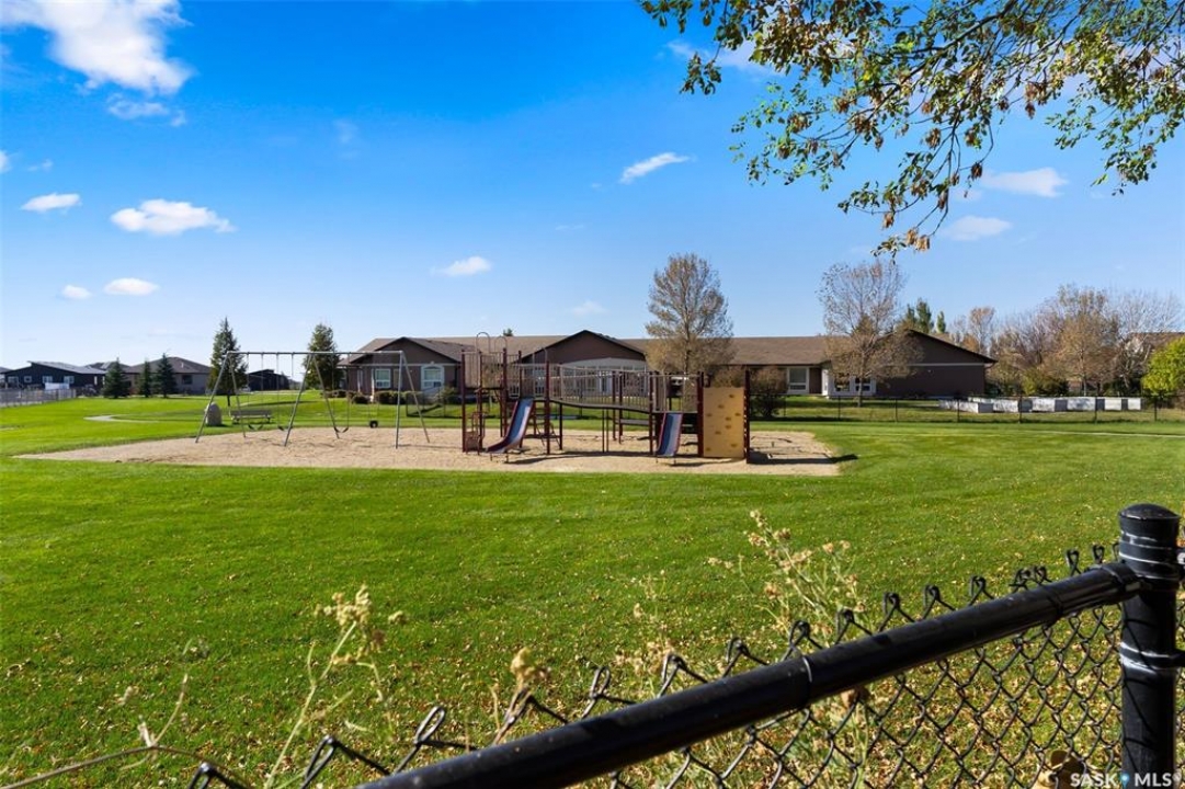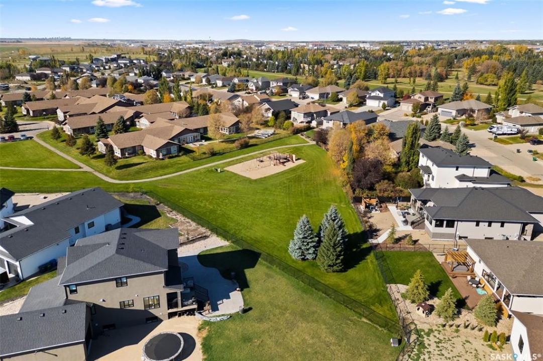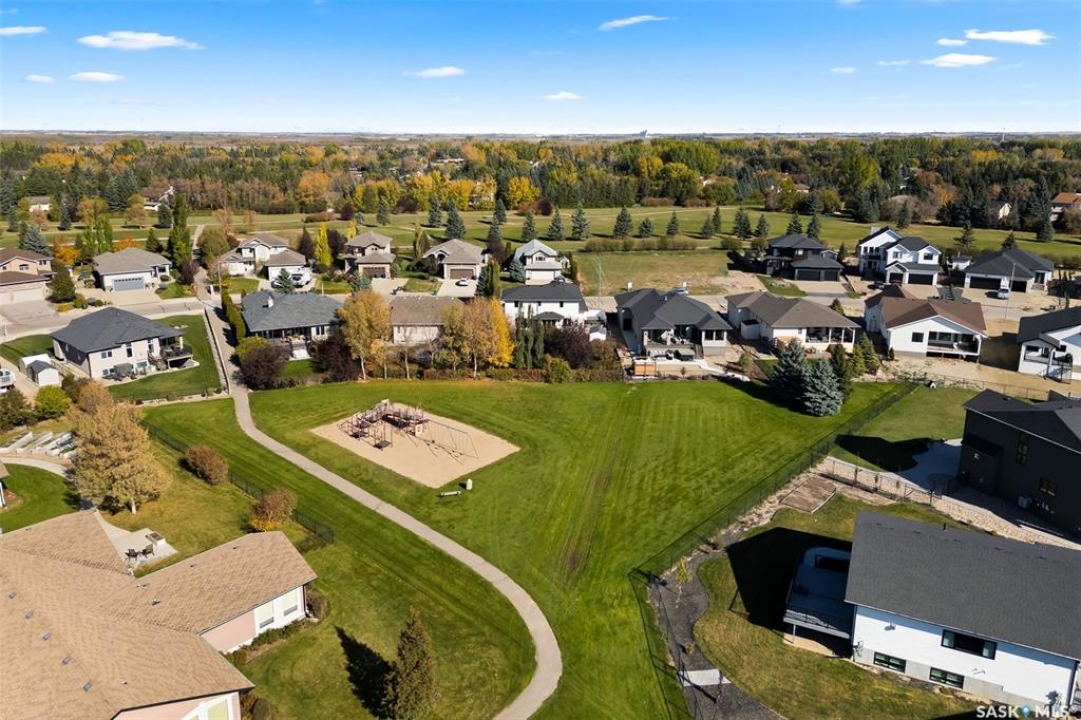 Gorgeous 2 story home in Emerald Park in prime location. Custom built home by Ripplinger Homes is nearly 2200 sq/ft and backs green space and southern exposure. Loads of natural light throughout. Welcoming entrance with ceramic tiled flooring transitions into maple hardwood floors. Main floor office is the perfect space for those who work from home. Spacious living room with natural gas fireplace with tiled accent and maple trim. There's an open view to the backyard thanks to a large picture window. Nice transition to the formal dining and kitchen area, upgraded kitchen island with quartz countertops ('24), stainless steel appliances and two piece bathroom. Main floor hardwood flooring was refinished in 2025. Direct entry to the 26 x 28 garage. Second level features 3 large bedrooms PLUS a bonus room that's the perfect media space. Walk-in closet in the primary bedroom and large ensuite. Basement is fully finished with additional bedroom and rec-room area and 3 piece bathroom. (current vanity will be changed out). Gorgeous and private backyard with mature trees, storage shed and hot tub included. Other recent upgrades include: shingles ('2018), new paint (2024), furnace ('23), c/air ('24). Move in ready family home is close to schools, shopping and Regina's east end amenities.