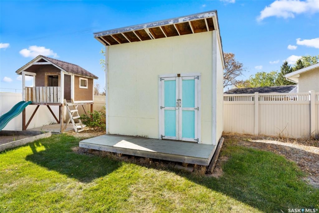 Welcome home to 146 Vernon Crescent, a charming family home tucked away on a quiet, family-friendly crescent in in Regina's desirable Argyle Park neighbourhood. From the moment you arrive, you'll appreciate the peaceful setting, with no back neighbours and a welcoming community vibe. Inside, this home features a fantastic floor plan with three spacious bedrooms on the main floor and a beautifully updated (plus OVERSIZED) 4-piece bathroom. The bright and functional kitchen provides an abundance of cabinets & prep space for family meals, along with lovely views of your backyard! Get ready to be the go-to holiday hosting spot because this dining room is large enough to host memorable holiday gatherings around a full size table with the leaf's in! can Downstairs the fully developed basement offers incredible versatility with a cozy den or home office, 3PCE bathroom, generous storage options, and a large recreation w/vintage wet bar area creates a comfy vibe perfect for a movie lounge, or games space! Step outside and fall in love with the expansive landscaped & fully fenced, ideal for summer barbecues, kids' play, or relaxing evenings under the stars. The yard showcases a massive custom built shed, a lovely play structure, and plenty of room to create your dream outdoor oasis. Located close to Dr. Hanna School and St. Timothy School & the shops on Rochdale Blvd, this property is perfect for families seeking convenience and community. Whether you're a first-time buyer or simply looking for more space to grow, 146 Vernon Crescent offers comfort, functionality, and charm in one inviting package! Don't miss your chance to call this beautiful home yours!
