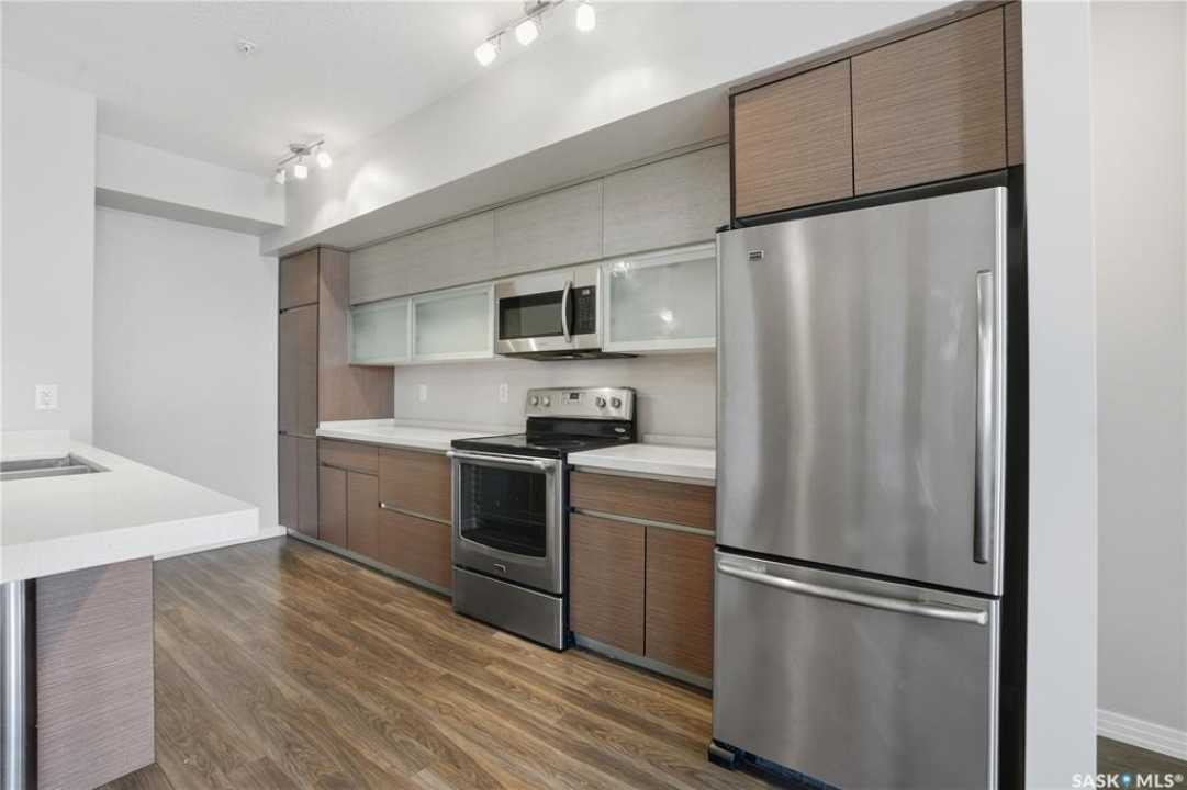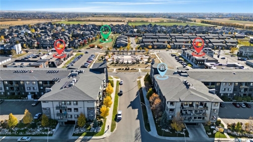 Excellent 2-bedroom, 2-bathroom east-facing condo with 2 parking spots (1 underground, 1 electrified surface-level) at Sequoia Rise, great location close to the Evergreen Square & bus routes to U of S. This trendy suite offers a functional layout with 9' ceilings, SoHo-style kitchen with quartz countertops and eating bar, ample living & dining space, in-suite laundry, split bedroom layout with generously-sized primary bedroom featuring walk-through closet to a beautifully-finished 4-piece ensuite with sit-down shower & dual sinks on a vastly-sized quartz-top vanity. A sheltered environment awaits you at the balcony, offering a relaxing space to soak up the sunrise with your morning coffee! Excellent climate control with in-floor zone heating (included in condo fees) & central air conditioning, providing gentle heating with the benefits of air handling. Building amenities include elevator access, intercom with cell phone compatibility, common exercise area & meeting room, visitor parking & mailboxes. Pet-friendly condo subject to restrictions. Whether you're looking to downsize, looking for economical living or buying your first home, this great condo should be on your list!