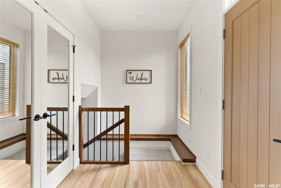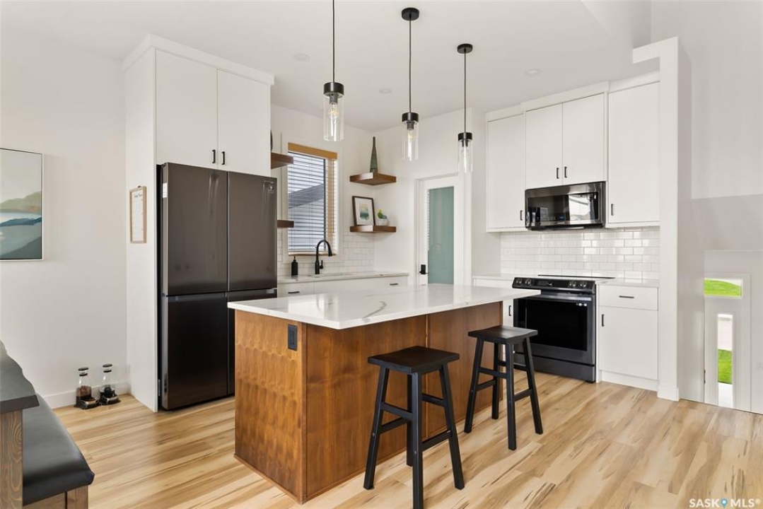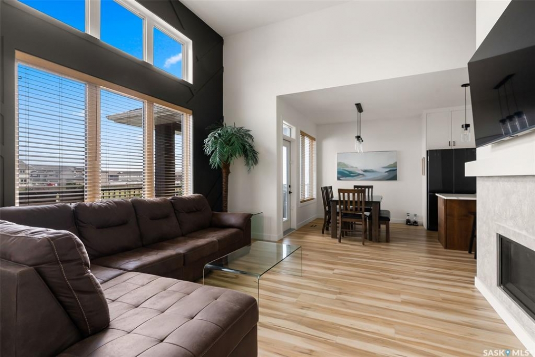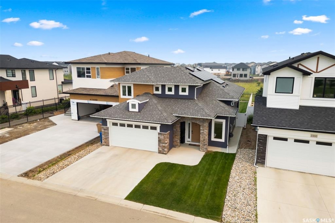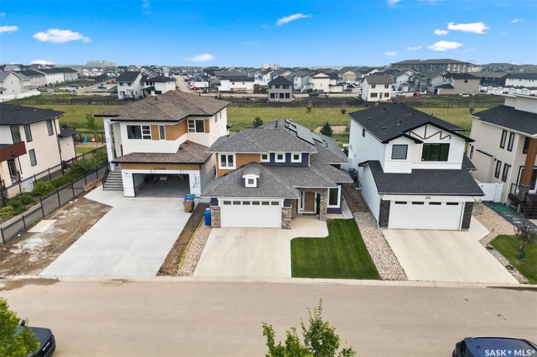 It's not every day you find a home that backs green space and fronts a park — but this one does! Located on a quiet cul-de-sac across from the Crosbie “Pirate” Park, this custom-built bi-level has no backyard neighbours and incredible curb appeal. The dark acrylic stucco, stone accents, and covered front entry create a welcoming first impression. Step inside to the spacious foyer with direct access to your heated double garage. The open-concept main floor feels bright and inviting. The two-toned kitchen features tall cabinets, quartz countertops, stainless steel appliances, and a walk-in pantry for extra storage. The living room has impressive high ceilings and a wall of windows that let the light pour in. Gather around the cozy gas fireplace or enjoy dinner with a view from the dining area that leads to your back deck and yard. Two bedrooms, a 4-piece bath, and laundry are conveniently located on this level. Upstairs, the private primary suite is your retreat with a large walk-in closet, dual vanities, and a beautiful ensuite. The fully finished basement offers plenty of space to relax or entertain with a family room, games area, and a built-in bookshelf for books or décor. The fun under-stair nook makes a great kids' hideaway, and the fourth bedroom is perfect for guests, teens, or a home office. A full bathroom completes the lower level. Outside, enjoy your partially covered composite deck with storage underneath, a fully fenced yard, and a firepit for cozy evenings. The solar panels are so efficient that you'll only pay SaskPower's minimum monthly fee. With schools and Starbucks just a short walk away, this home truly has it all — location, style, and a touch of everyday magic.