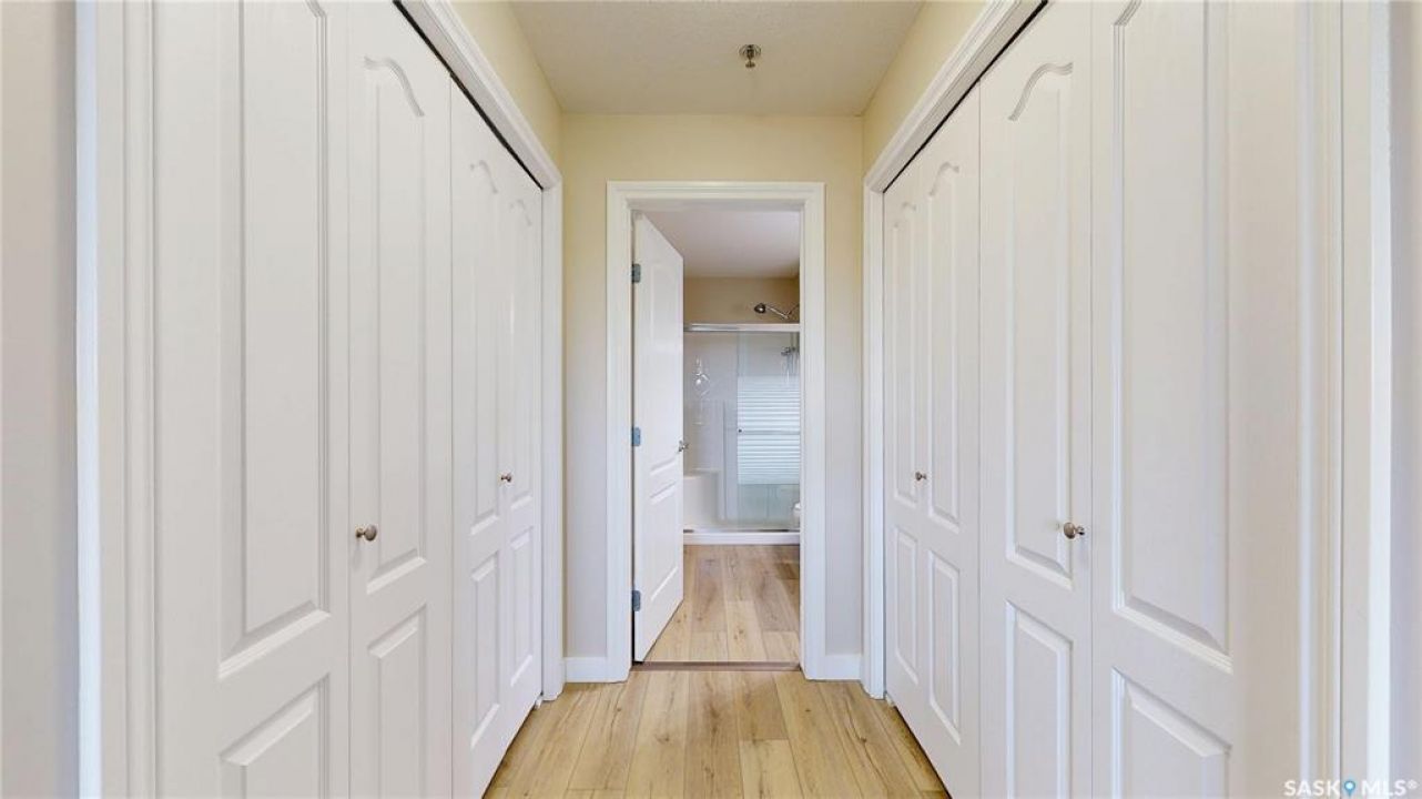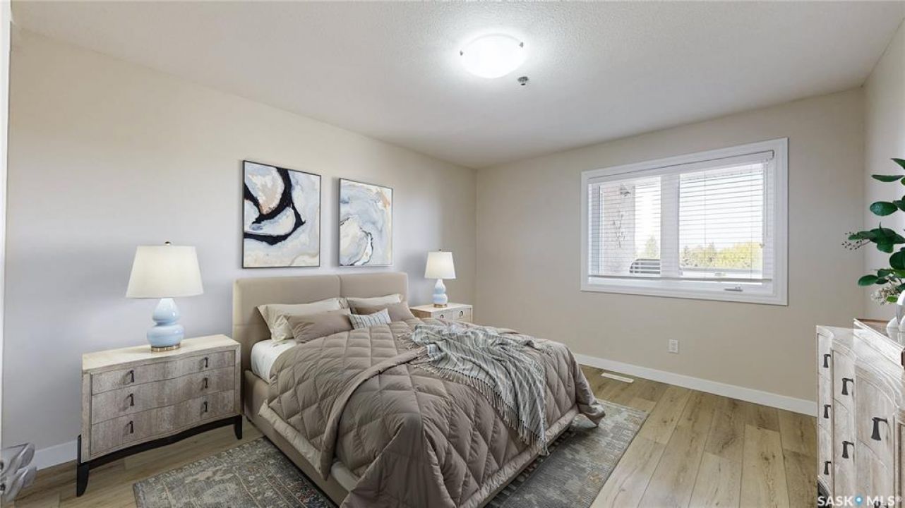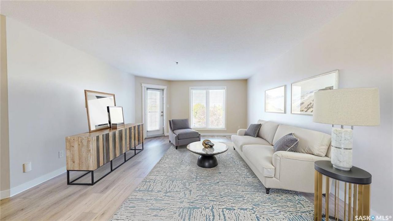 Welcome to �Unit 308 at 2885 Arens Road E, a meticulously maintained and spacious residence situated in the desirable �Wood Meadows �neighborhood,offering unparalleled access to all East End amenities. This �third-floor unit �boasts a desirable �open-concept layout,perfect for modern living and entertaining. The well-appointed kitchen features ample storage and counter space, complemented by a convenient �eat-up breakfast bar. Recent updates include new �countertops(2021) and a full suite of �stainless steel Whirlpool appliances. The entire unit features durable, recently updated �vinyl plank flooring(2025) and baseboards, �along with a bright interior finished with a �neutral paint palette �(2021). The dining area flows seamlessly into the large living room, which provides direct access to a good-sized �west-facing balcony—ideal for relaxing and enjoying stunning �sunset views. The smart floor plan offers privacy,separating the sleeping quarters. The �primary bedroom �features double closets and a private �three-piece ensuite bathroom. The secondary bedroom and the main four-piece bathroom are situated on the opposite side of the living space. This unit comes equipped with modern conveniences,including �in-suite laundry,central air conditioning, natural gas connection with Colman Revolution BBQ included, all custom blinds and a �built-in central vacuum system. Ownership includes �one exclusive parking stall �and a secure �storage unit cabinet �within the heated parkade which is uniquely built at ground level for ease of access. The building is exceptionally well-maintained and offers an impressive array of �amenities �for residents to enjoy, including:Hospitality Room, Exercise Room,Craft/Games Room,Workshop,Guest Suite, Internal shared storage room, Wash Bay in the Parkade, Elevator and Visitor Parking. �Condo fees include � water, sewer, centralized water heater and water softener, snow removal, lawn care, garbage and recycling, common area maintenance, building insurance and reserve fund.