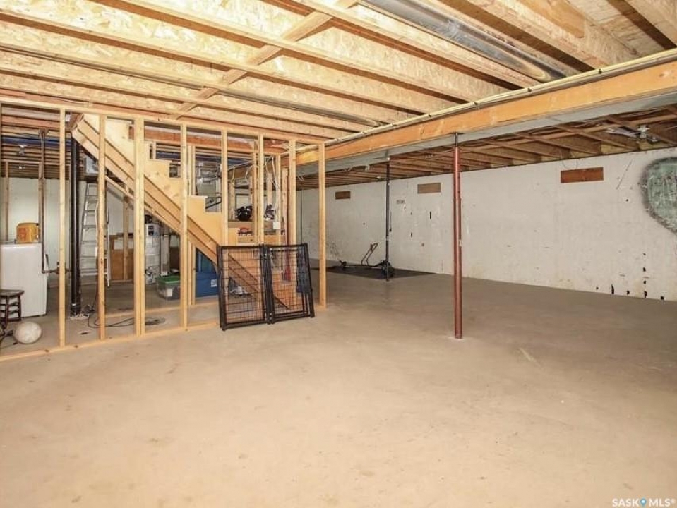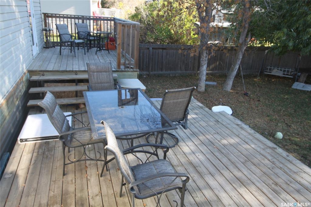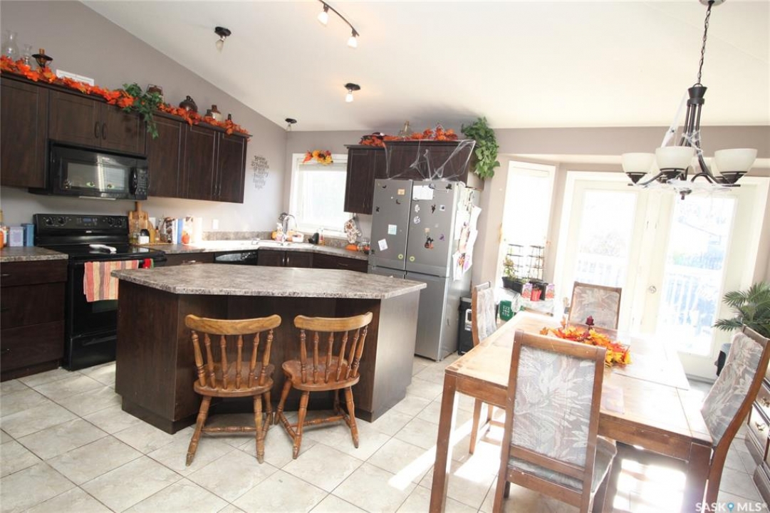 Spacious open floor plan. Vaulted ceiling in the living, dining room and kitchen. Large kitchen with numerous cabinets and an island. Garden door off the dining area leads to a sunny south-facing 2-level deck. Primary bedroom has a walk-in closet and a 3-piece en-suite with a 4'6" walk-in shower. Access is also available to the deck from the primary bedroom. Second and third bedrooms are both a good size. Basement has large windows and is open for development. Cherry and Saskatoon Berry bushes at the back of the property. And, when you crave the Saskatoon amenities, it's a short 20-minute drive on a double divided highway. 10 minutes to Blackstrap Provincial Park where you can enjoy swimming, boating, fishing, camping and winter fun.