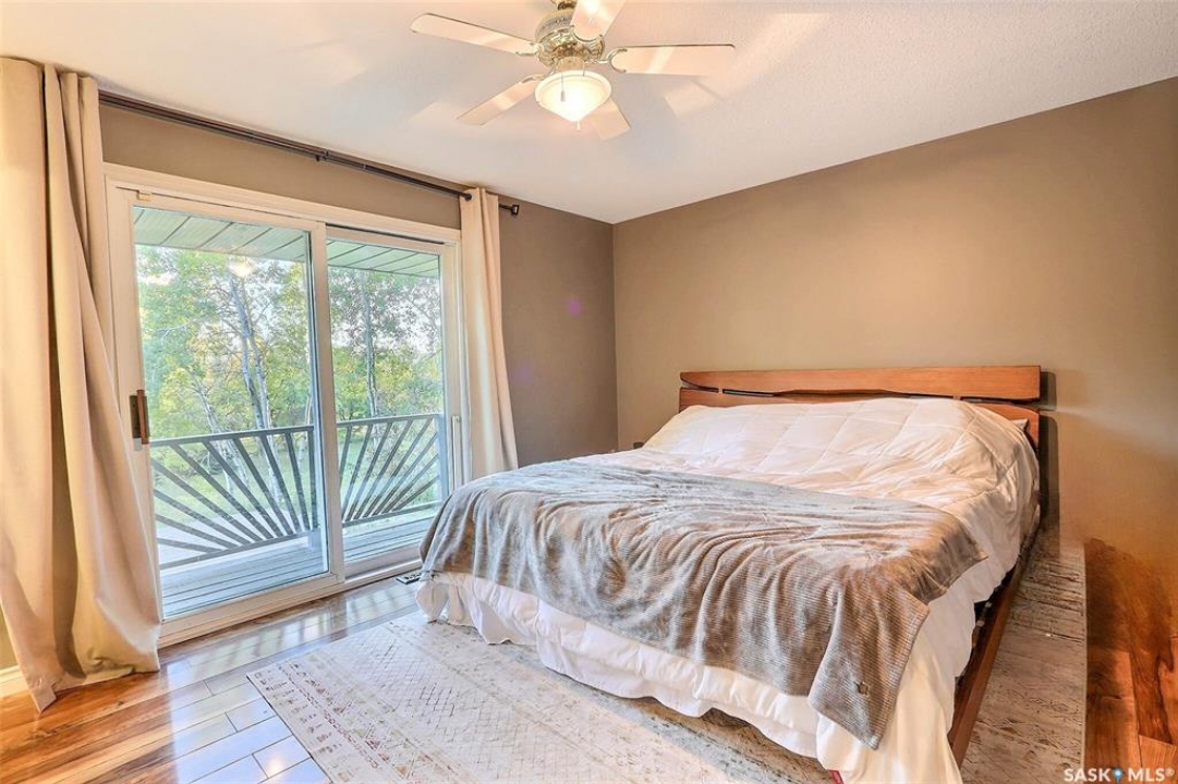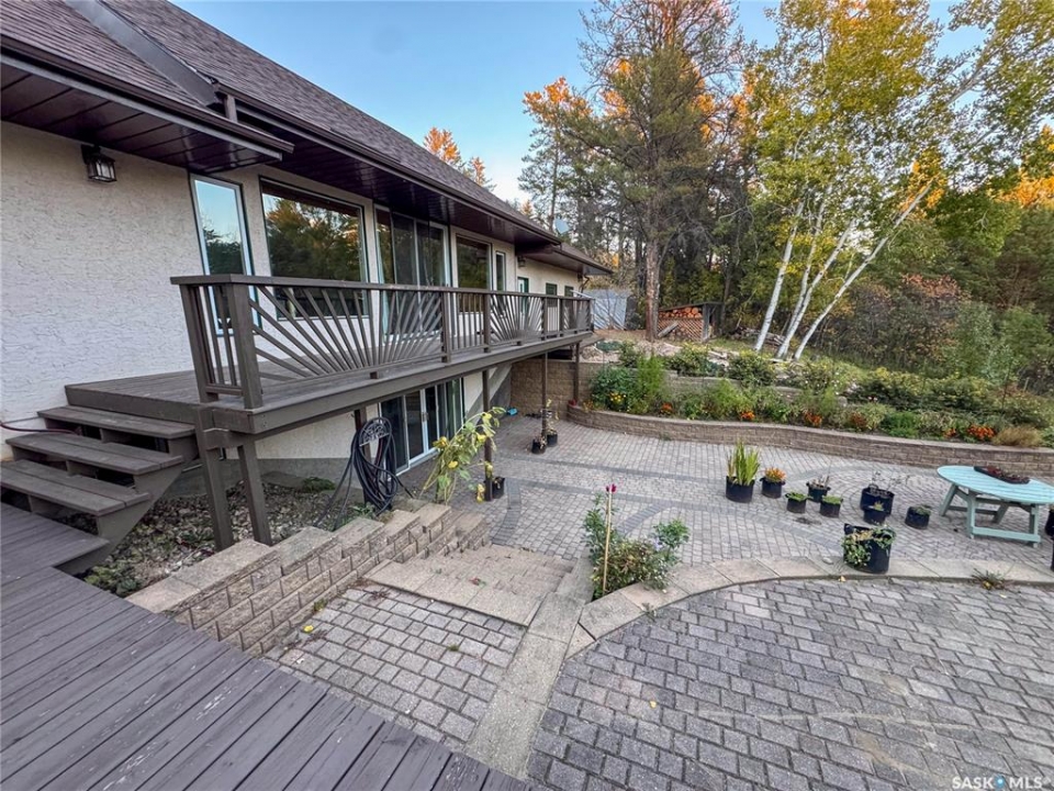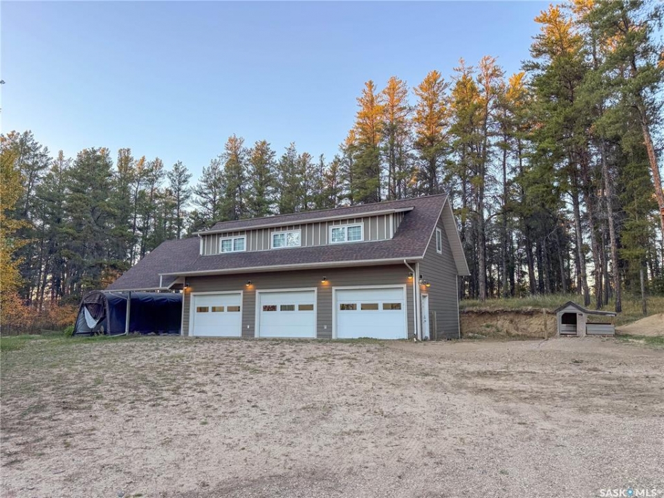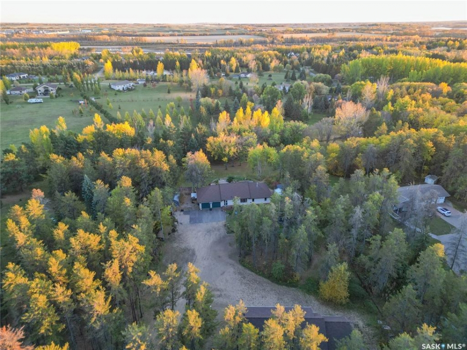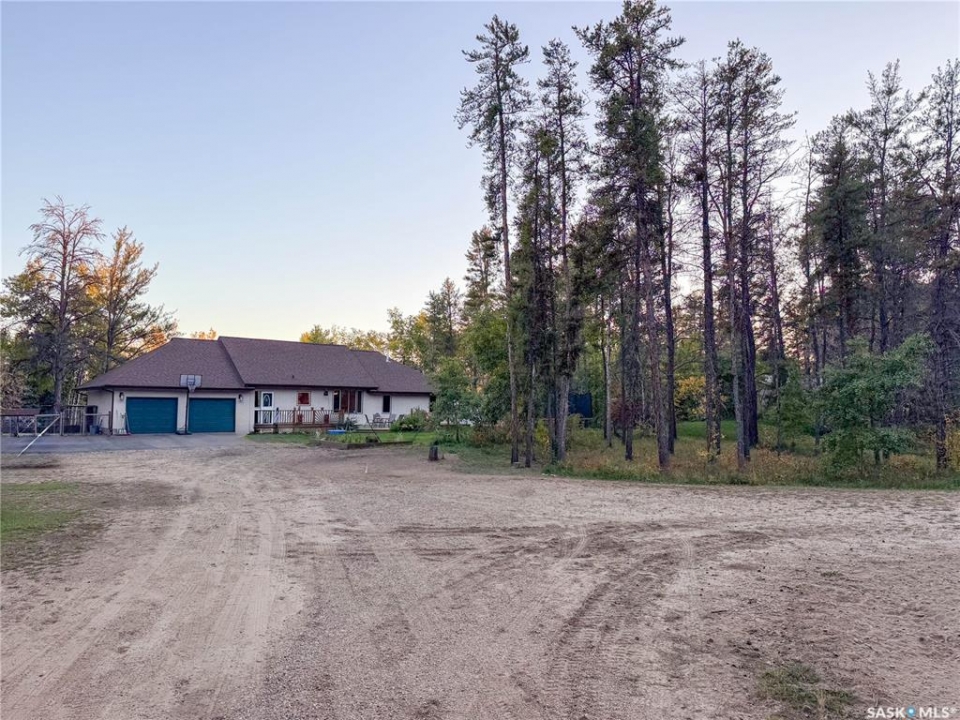 Immaculate 4 Bedroom + Den Acreage with Walkout Basement & Dream Garages only 5 Minutes from Prince Albert! This stunning and meticulously maintained 1,518 sq/ft bungalow offers the perfect blend of luxury, privacy, and convenience on a beautifully landscaped 2.47-acre lot. Built in 1994, this home features a spacious walkout basement, attached 26' x 28' double attached garage, and an incredible 24' x 48' heated detached triple garage complete with a carport and fully finished loft space above — ideal for hobbies, storage, or a home business. The main floor welcomes you with vaulted ceilings, hardwood flooring, and a cozy wood-burning fireplace with stone surround and built-ins in the bright south-facing living room. The kitchen offers an abundance of cabinetry and opens to the dining area. Three spacious bedrooms, a full bathroom, and a private ensuite in the primary which also has access to the deck and hot tub overlooking the breathtaking yard. The walkout basement is an entertainer's dream with a massive games room and family room featuring built-ins, cork flooring, and access to the covered patio. You'll also find a fourth bedroom, den, full bathroom, laundry, and plenty of storage space. Outside, the fully fenced and heavily treed property provides complete seclusion with green space, and manicured landscaping that must be seen to be appreciated. Additional features include central air conditioning, central vac, multiple sheds, and pavement right to your driveway. A one-of-a-kind property offering the best of acreage living with city convenience — truly impressive inside and out!