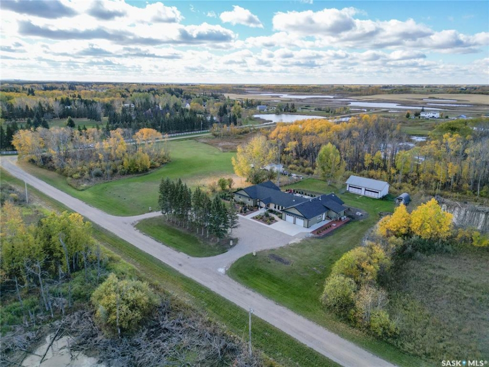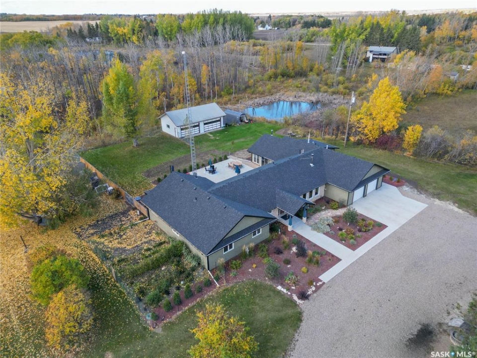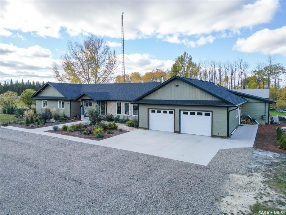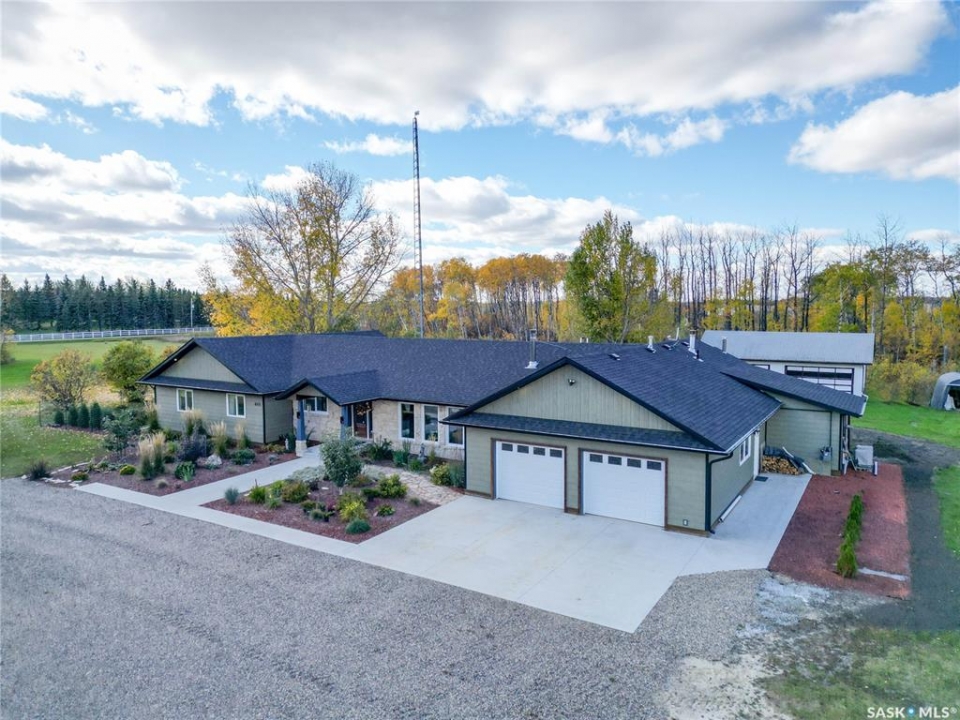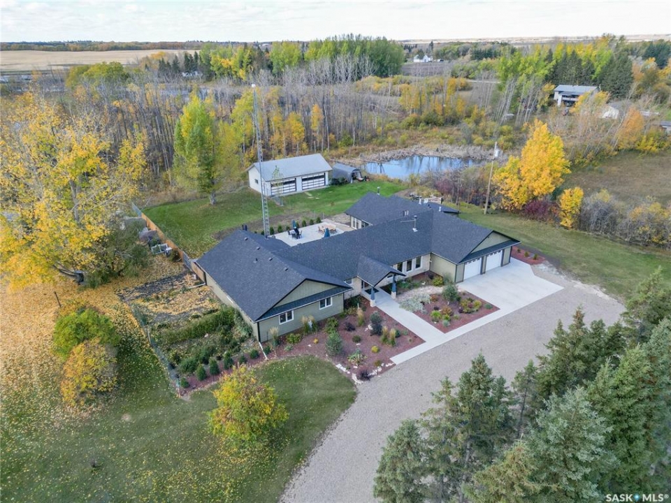 Once in a lifetime 10 acre estate in prestigious Madden Place neighborhood of Green Acres – fully updated & turn key! This extraordinary 3,466 sq/ft ranch-style bungalow offers unmatched luxury, privacy, and convenience just minutes from Prince Albert. Set on 10 beautifully landscaped acres with an additional 75 trees planted, this sprawling estate is truly one of a kind. Impeccably maintained and move-in ready, the home features 4 bedrooms plus a den, 4 bathrooms, and over 3,400 sq/ft of refined living space. The stunning great room showcases vaulted ceilings with exposed wood beams, wood burning fireplace, hardwood floors, and expansive windows that flood the space with natural light. The open-concept kitchen boasts two-tone cabinetry, granite countertops, a massive island, stainless steel appliances, and a butler's pantry. A second family room with cozy N/G fireplace and wet bar leads to an incredible sunroom with vaulted wood-beamed ceilings, wood burning fireplace, and wall-to-wall windows overlooking the grounds. The spacious primary suite offers a N/G fireplace, deck access with a gazebo, and luxurious 5-piece ensuite with full Travertine slabs in the shower and Travertine dual sinks. The home also includes a large laundry room with abundant storage and an inviting foyer with custom barn doors. Outdoor living is unmatched — enjoy an expansive patio done with paving stones, meticulous landscaping, fenced areas, and unmatched curb appeal. The property includes both an attached heated 26' x 28' double garage and a detached garage with two double doors and concrete floors. Additional highlights: city water, two natural gas fireplaces, two air conditioning units, newer vinyl windows, new 200-amp panel, central vac, electric hot water heater, weeping tile, fire-kill granite front step, and four fireplaces in total. A rare opportunity to own a truly perfection level estate — offering luxurious one-level living in one of Prince Albert's most sought-after locations.
